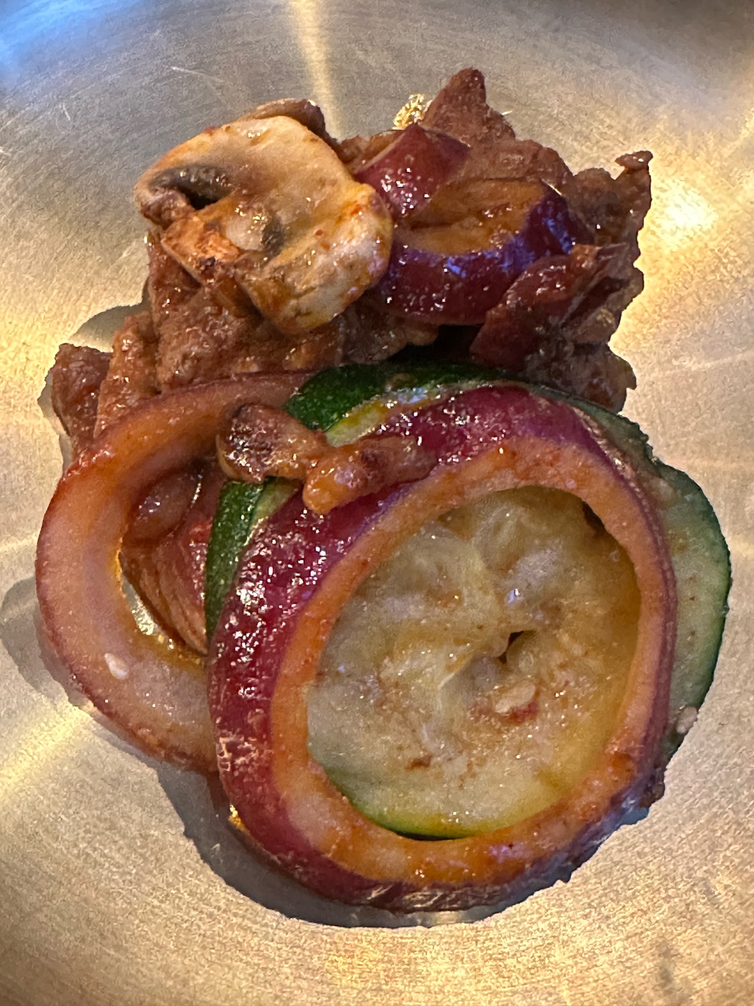 En soit c’est très bon cependant j’ai été déçu que les menus barbecues comportent aussi peu d’accompagnements et de légumes, c’est quand même la base dans un barbecue coréen. Il y a littéralement un oignon, trois champignons, une carotte et une courgette avec un bol de riz (le riz n’a pas bon goût mais c’est évidement un avis personnel). Les sojus sont quand même assez onéreux. La viande de bœuf était tendre et très bien assaisonnée !