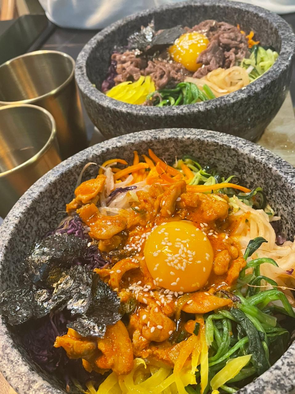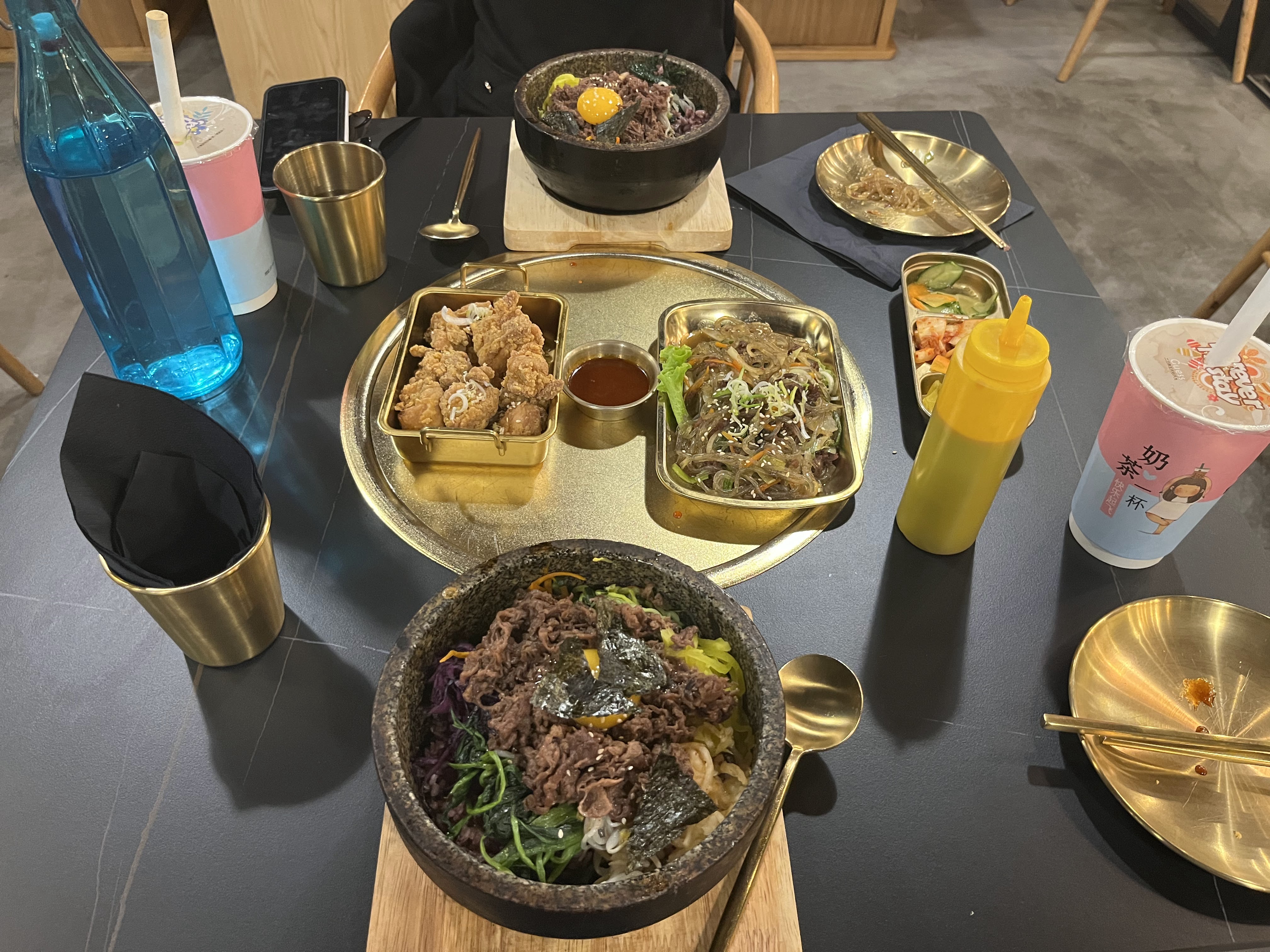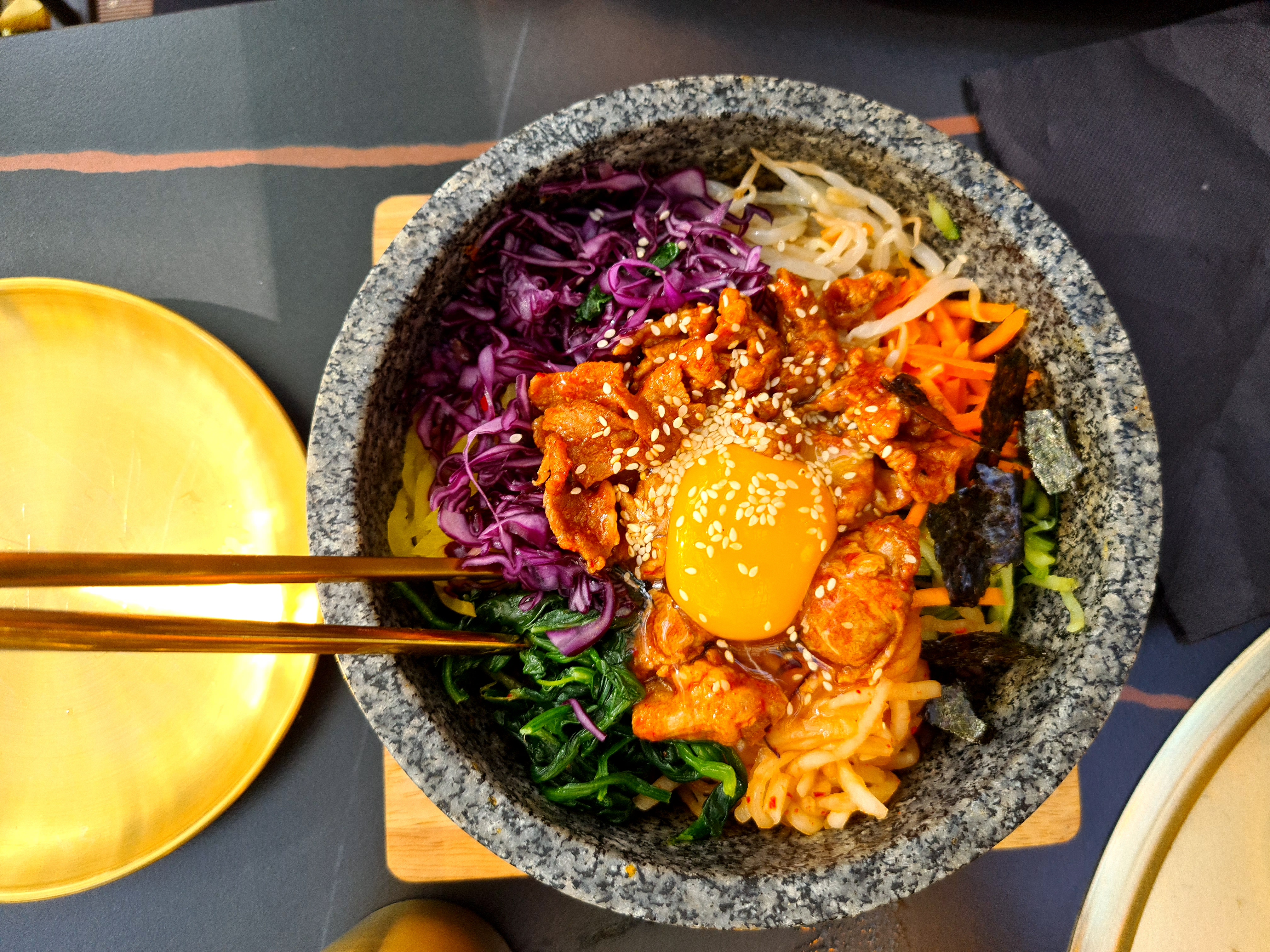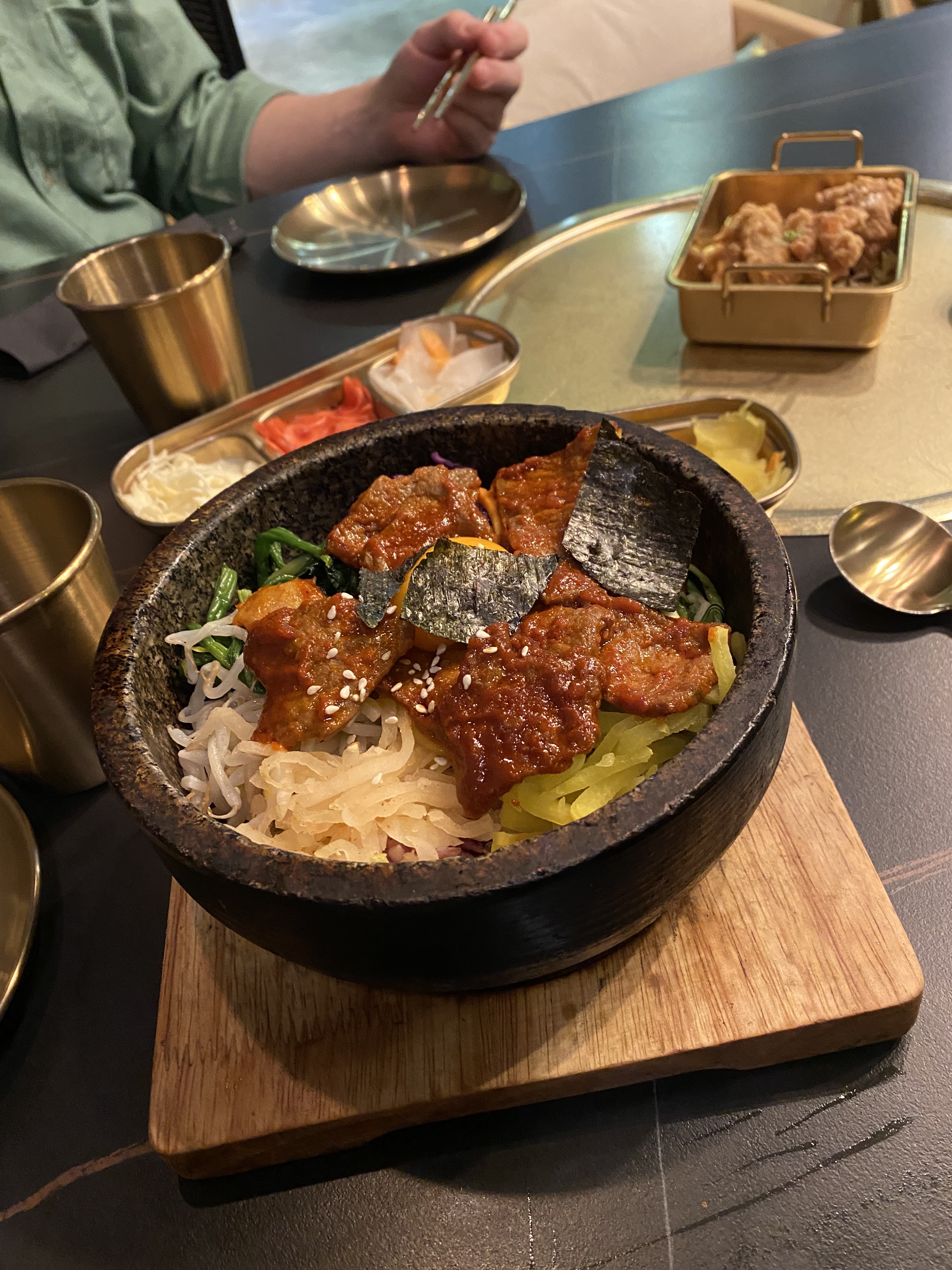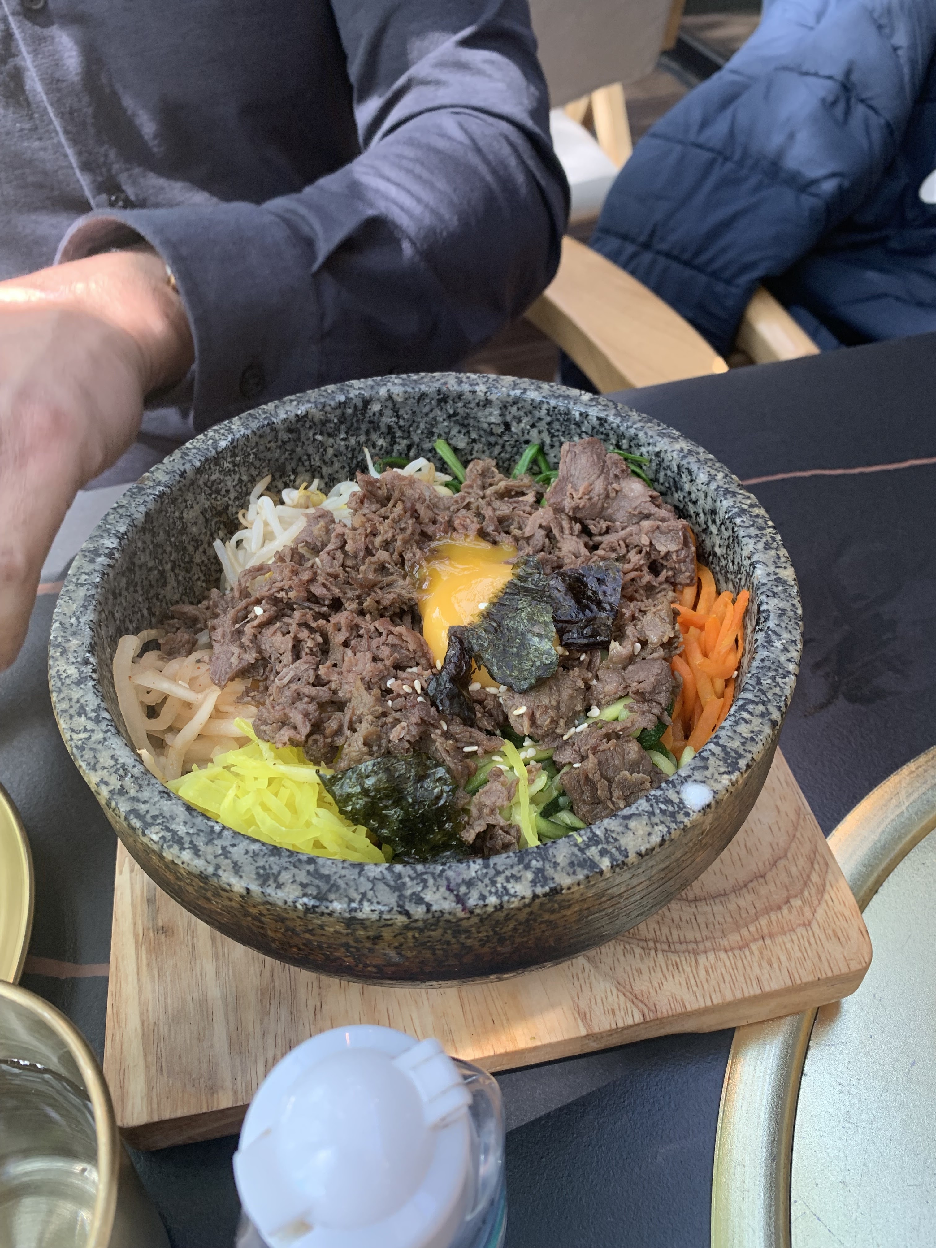Le restaurant est top, avec un décor extérieur et intérieur très cool ! Le bibimbap au bœuf mariné est délicieux 😁