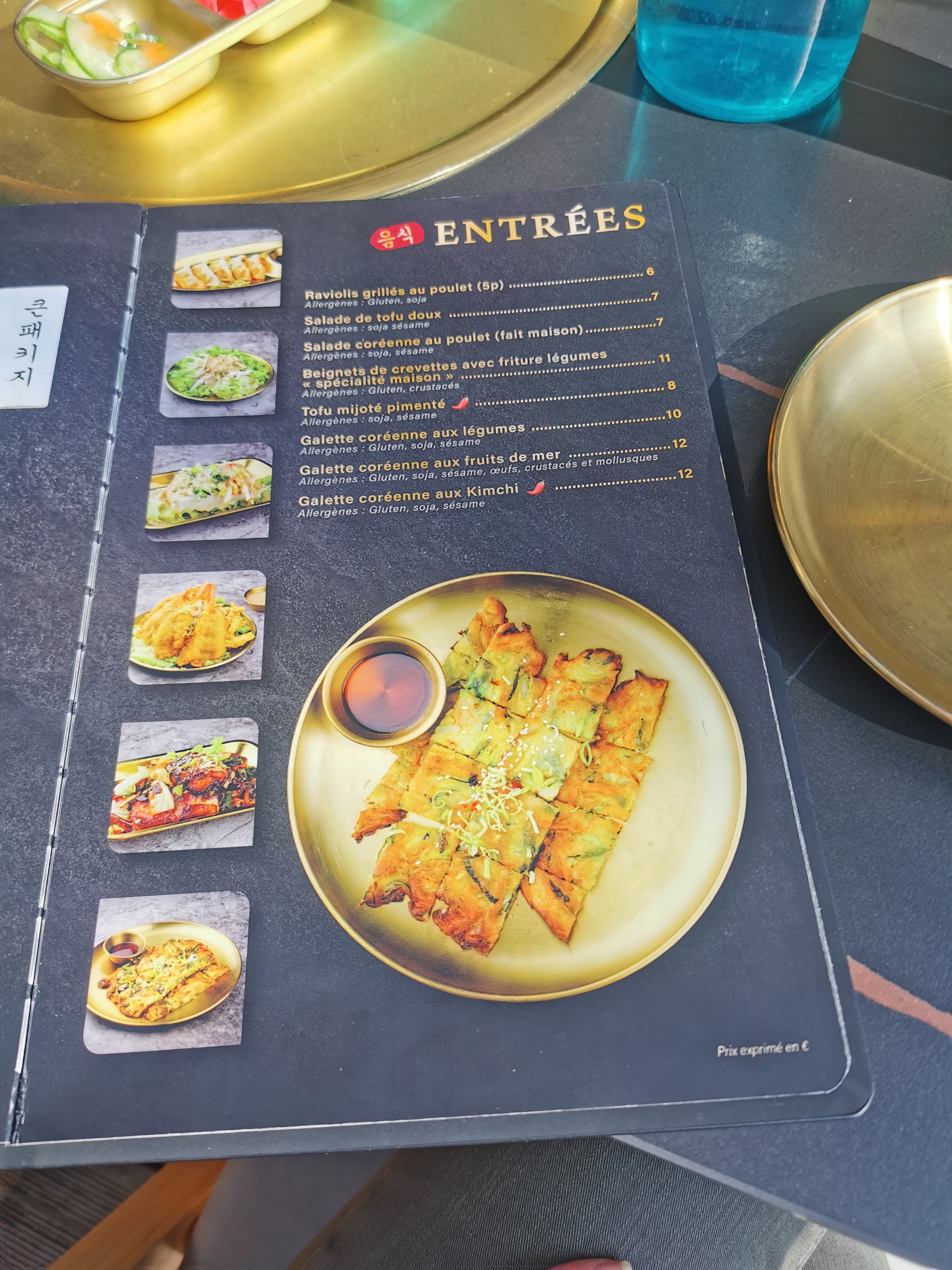 Cadre très agréable. Le décor est superbe. Service top mais perfectibles. Nous servir les bières sans verre. Concernant les plats, les nouilles sautées en entrées sont vraiment excellente. Par contre je trouve que pour le barbecue ça manque de condiments, j'en ai connu d'autres plus complets. Genre épinards, kimchi, pomme de terres sucrés. La c'était un peu léger. Bibimbap bon mais pas de quoi casser 3 pattes à un canard. Ma femme aurait préféré du riz blanc dedans.