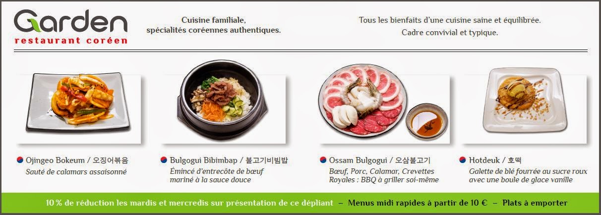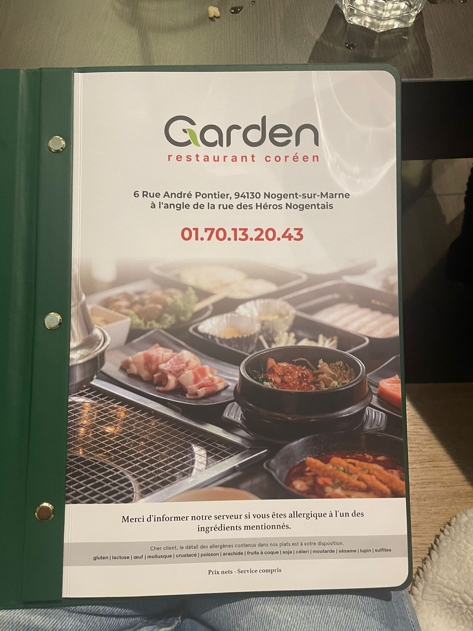 Nous sommes allées au Garden hier soir avec 2 amies. L'endroit est joli, et très propre! Nous avons commandé une entrée pour 3 les beignets de crevettes croustillants je crois. Comment décrire le plus précisément ce plat...une tuerie!!!!! puis nous avons pris du bœuf bulbogui sur plaque chauffante et un bibimpap et là encore...délicieux!!!! Nous nous sommes régalées tout ça pour un ticket moyen relativement raisonnable (surtout en comparaison d'autres coréens!). Je recommande :)