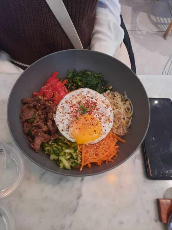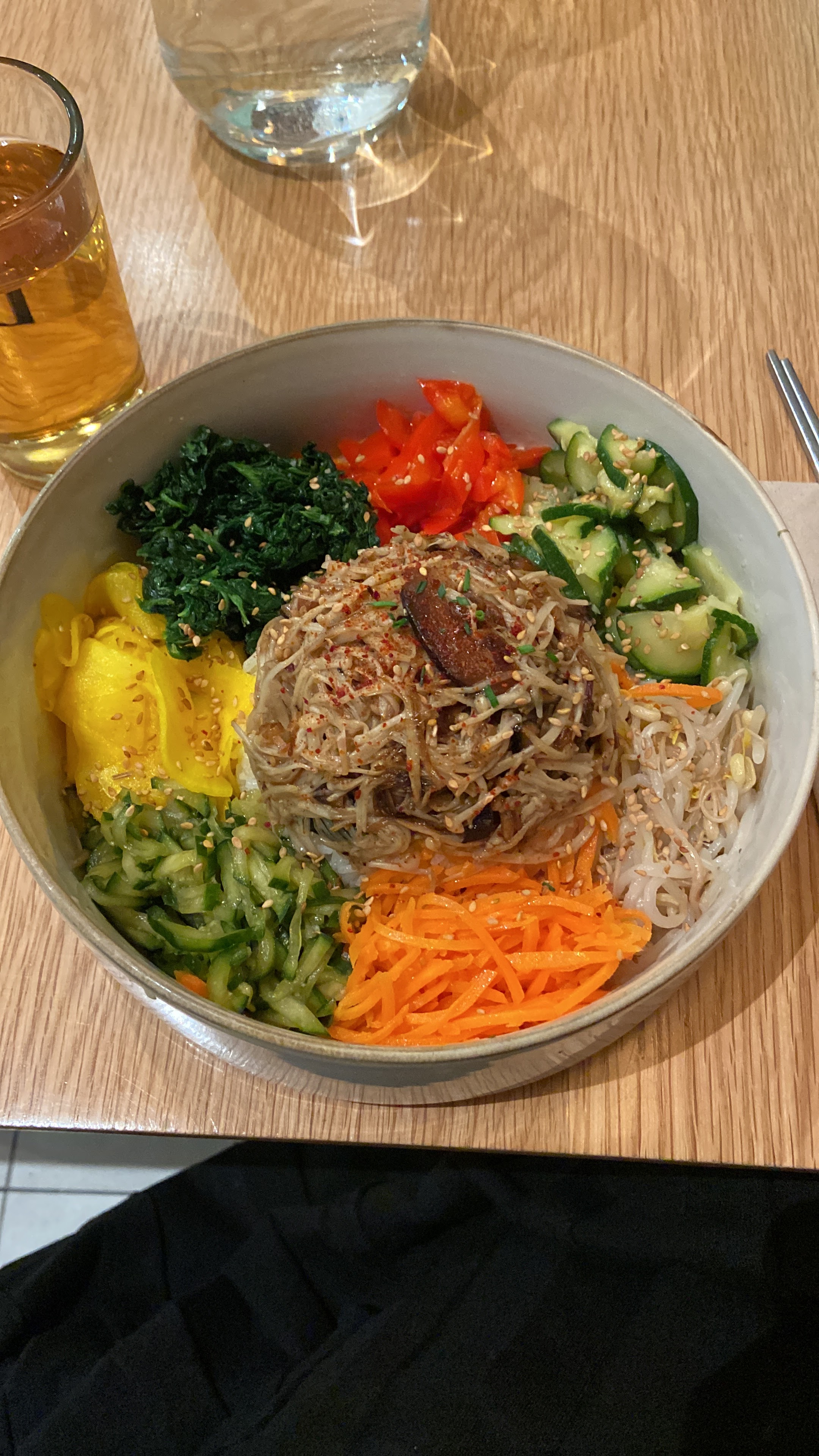 Excellent, un bibimbap copieux, mes parents ont adoré la soupe et les raviolis, le japchae tester par la mère a aussi été validé. Attention pensez à réserver pour manger sur place