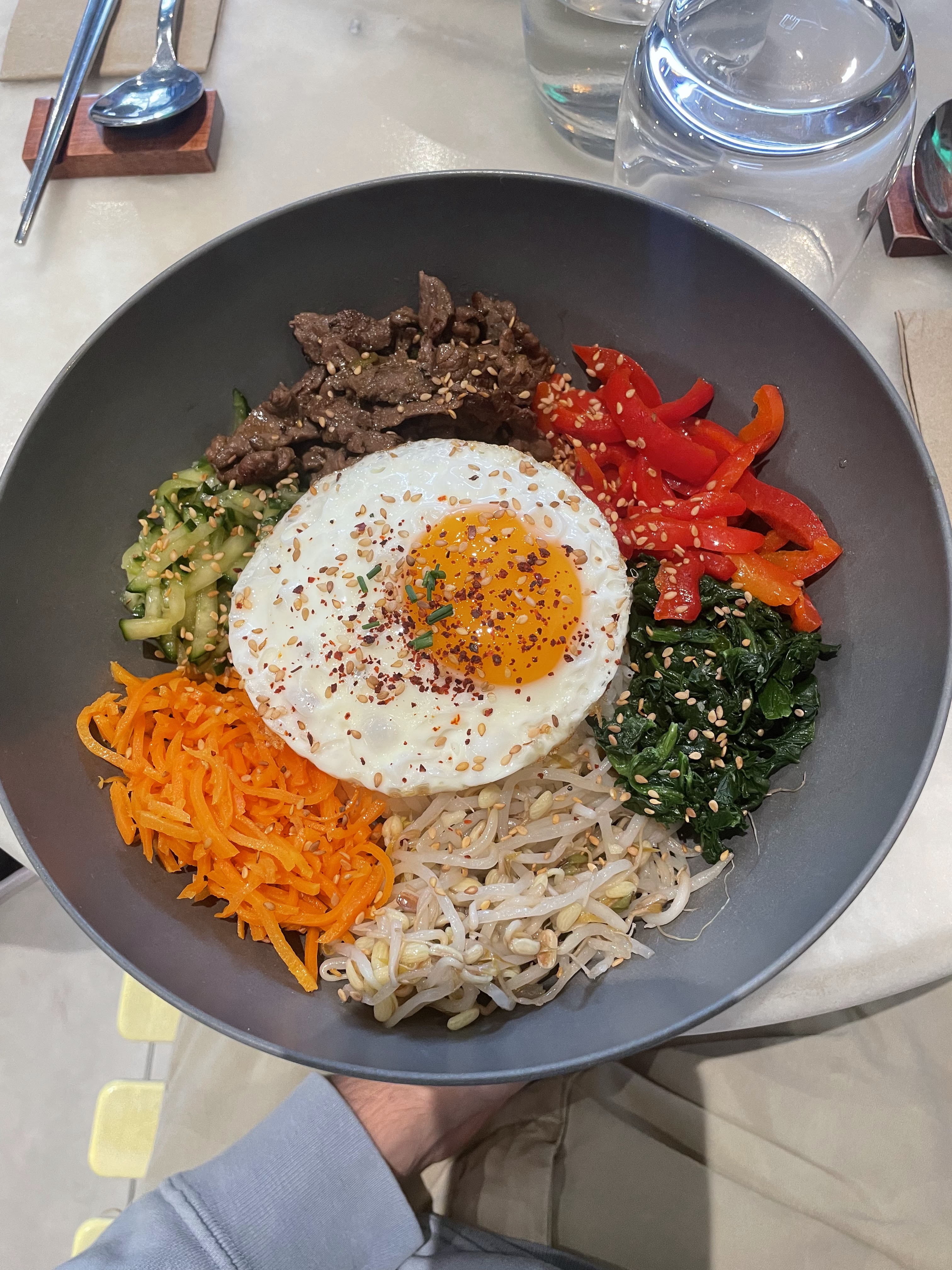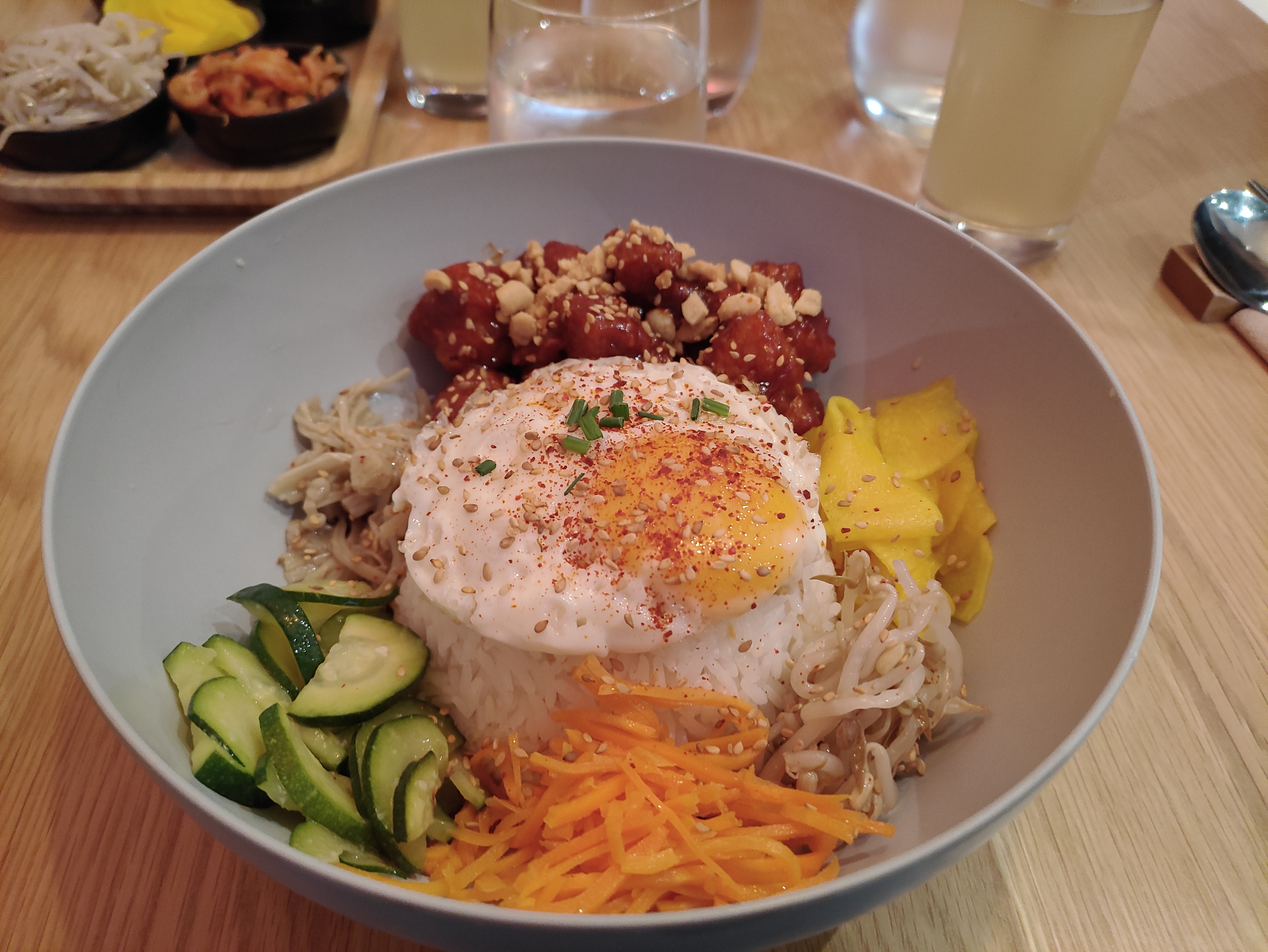 J'ai testé le bibimbap Yeosu, qui était très bon avec sa sauce relevée mais pas piquante. En dessert j'ai bien aimé le cheesecake au yuzu. Bémol : le pancake hotteok était trop sec pour être mangé seul et aurait mérité un coulis ou de la chantilly. Bon service et climatisation agréable en intérieur.