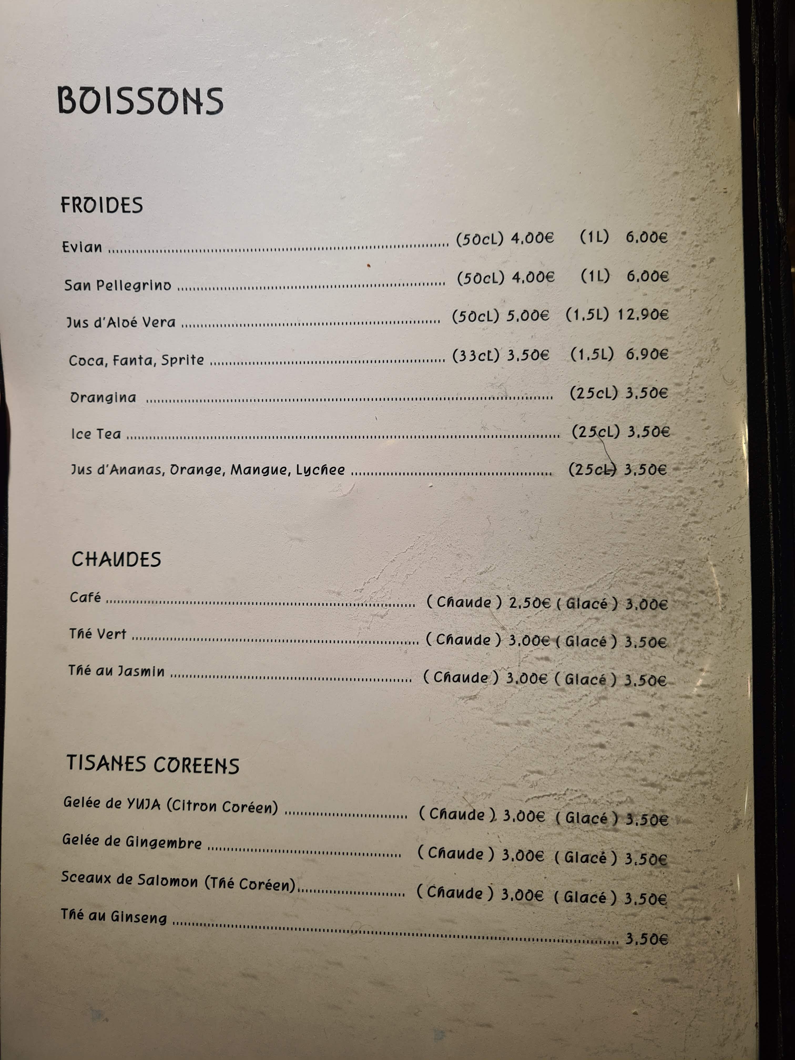 J'ai acheté des bibimbap à porter. C'était super, les plat ! Pour le barbecue, les viandes sont bonnes mais le restaurant n'a pas changé de grille lors du repas.