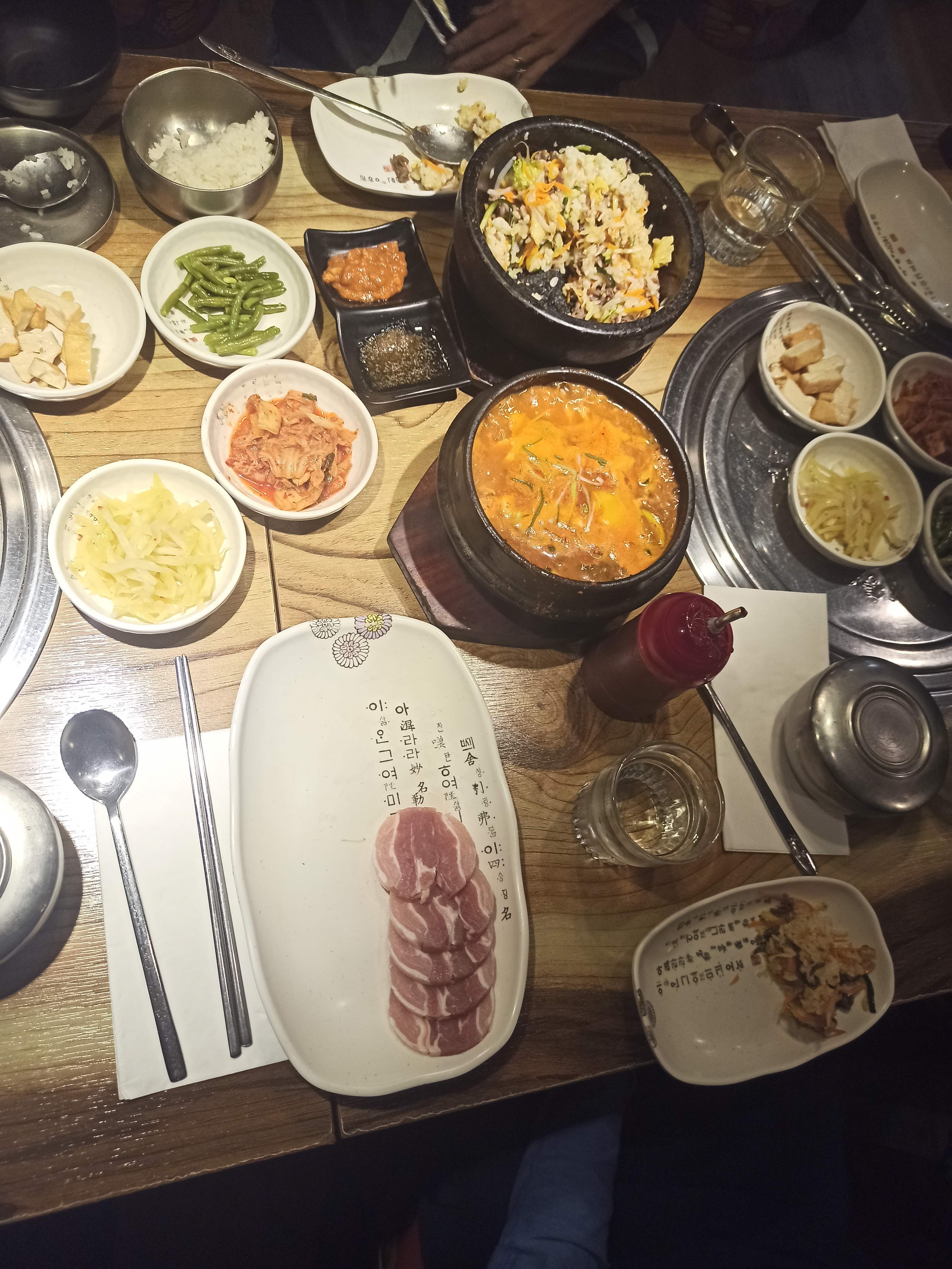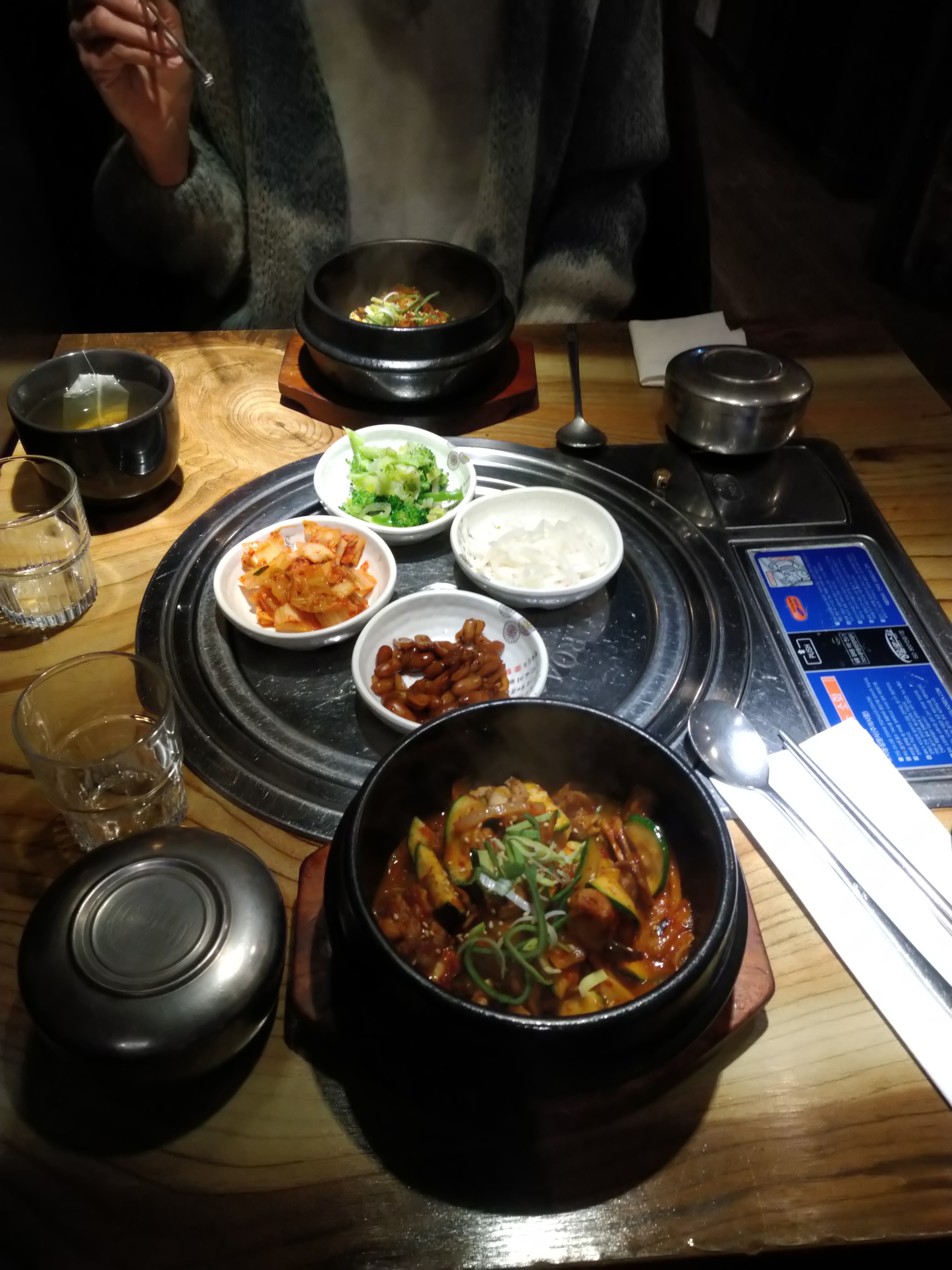 Accueil très sympatique, même si nous n'avions pas pu reserver en avance nous avons pu dîner. 😊 Service rapide 👍🏼 Rapport Qualité/prix : correct Restaurant à recommander sans hésitation ⬇️ entrée : galette de kimchi ⬇️ plat : Bol en pierre, porc et calamar mariné piquant avec ses accompagnements, pour 2.