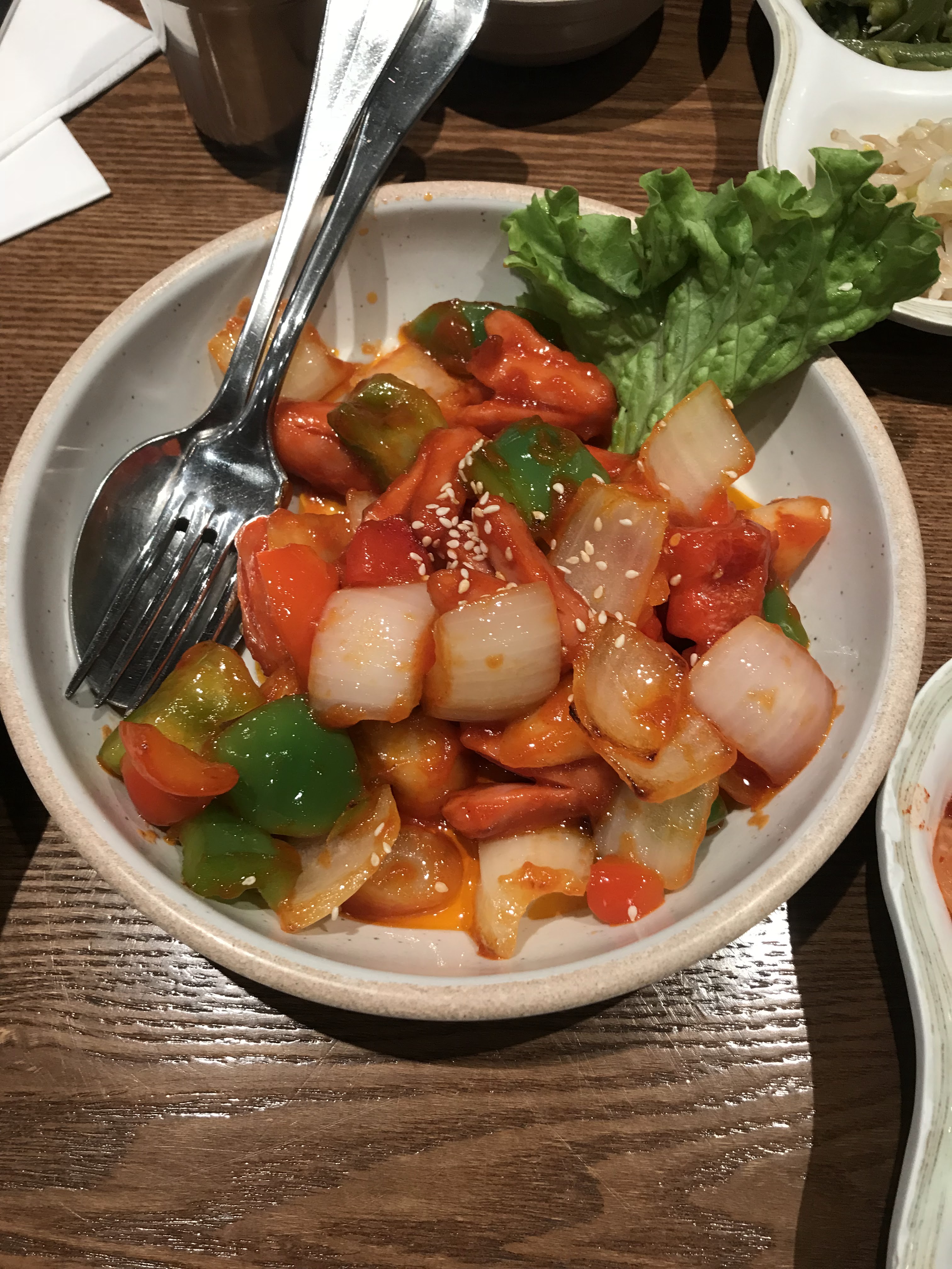 Nous appris le poulet frits à la sauce en entrée Un bibimbap et les autres un plats à base de poulet epicé Incroyable service , bien accueilli et surtout bien organisé. Les plats sont généreux servis avec des accompagnements a servir.