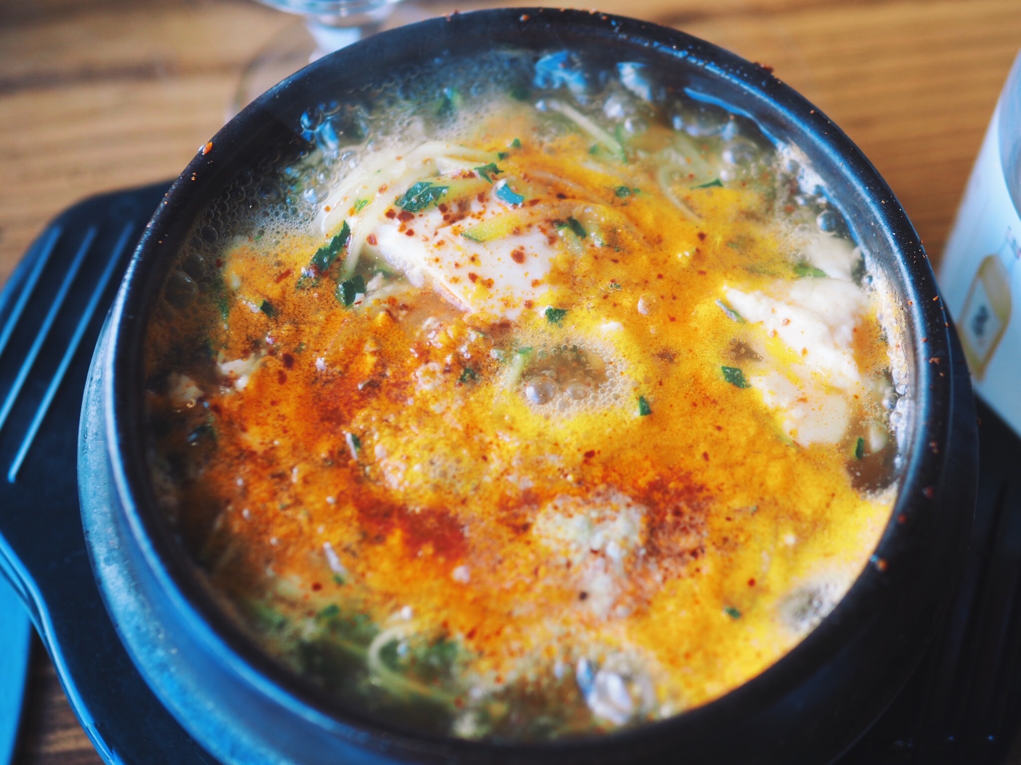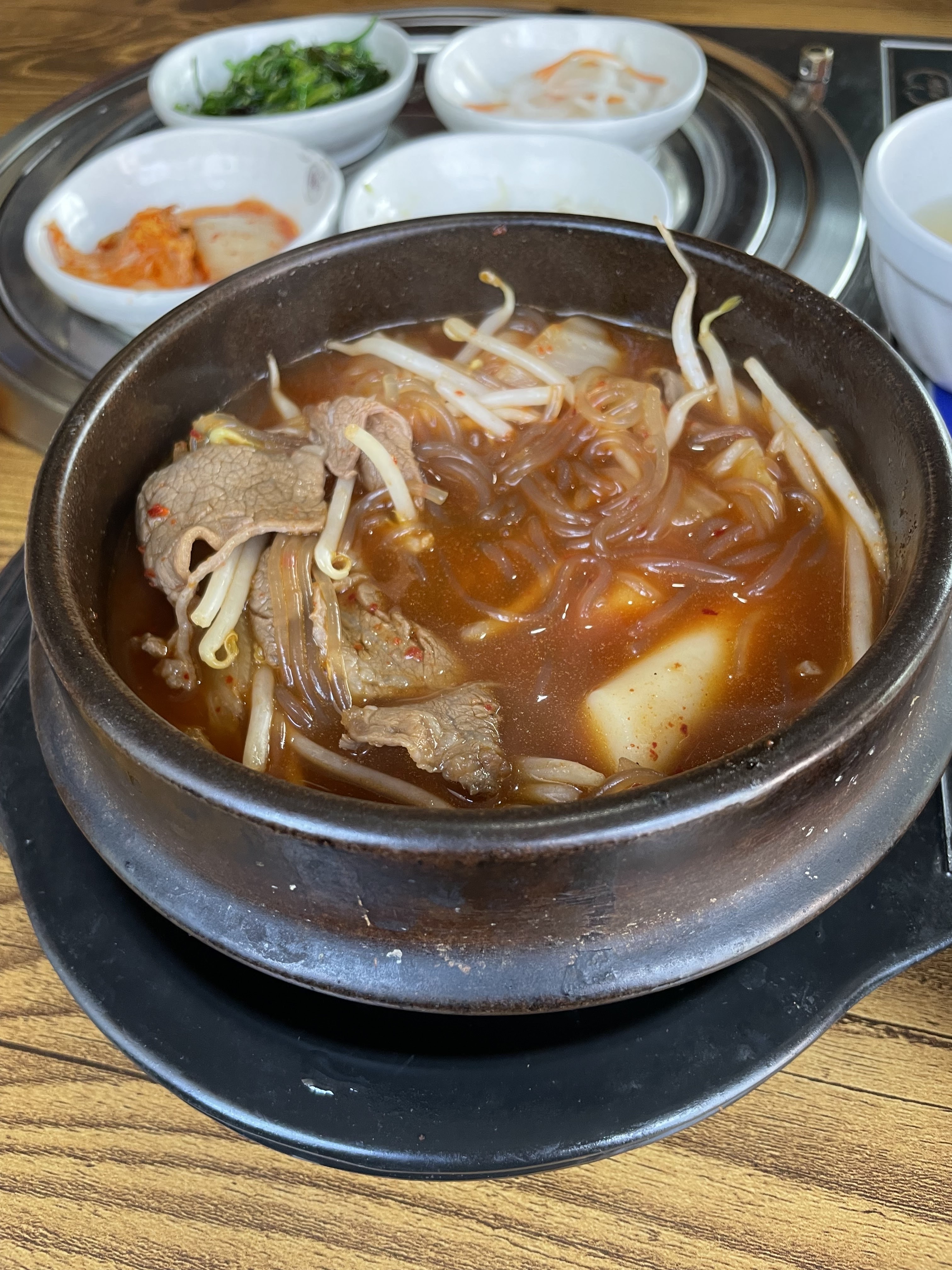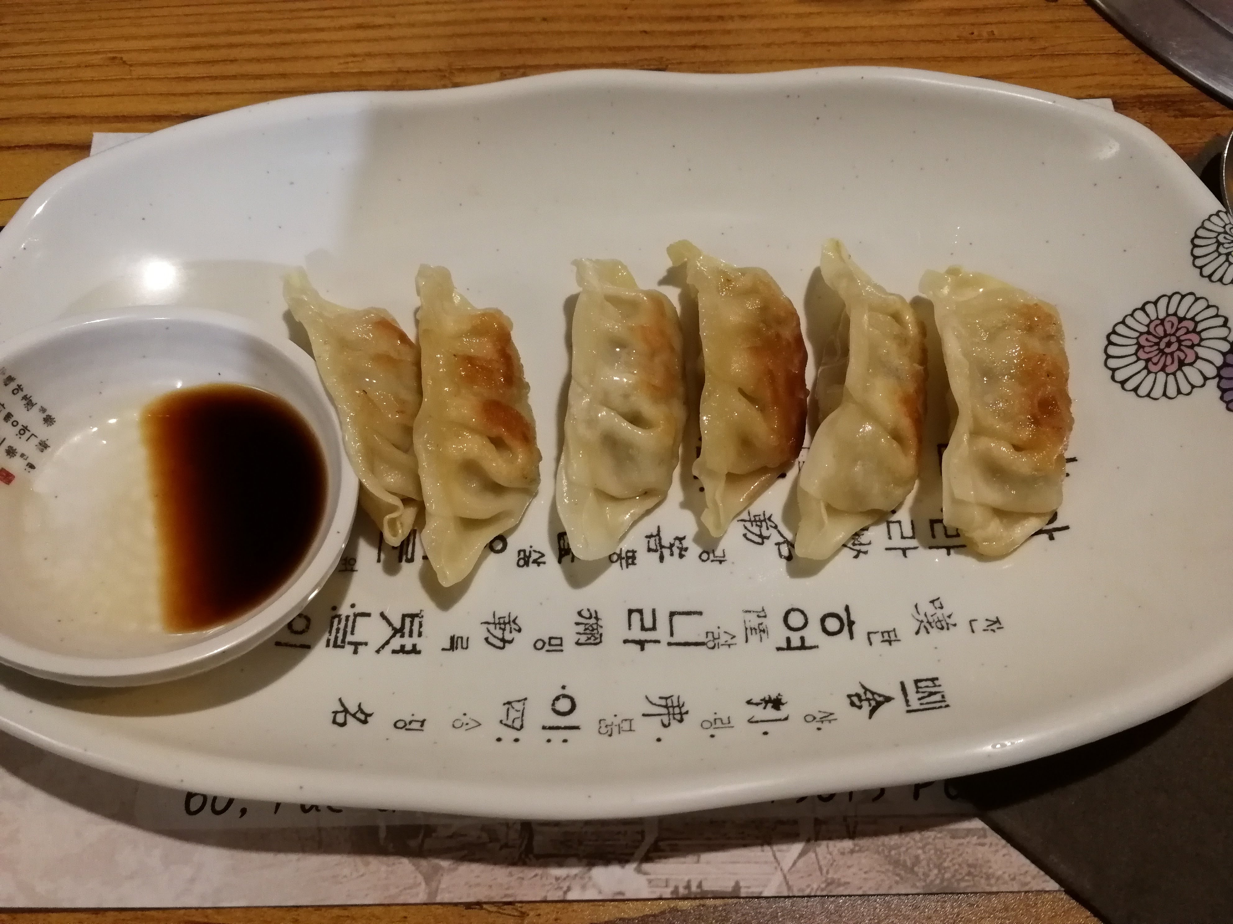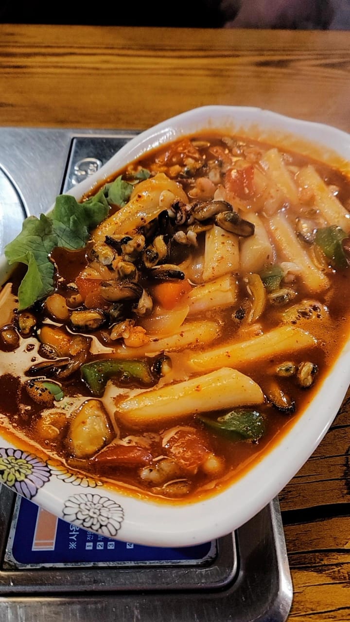 La soupe aux raviolis n'avait pas de goût et pas de saveur, les crêpes coréennes étaient OK mais pas excellentes non plus ; le bibimbap fruit de mer était trop salé...