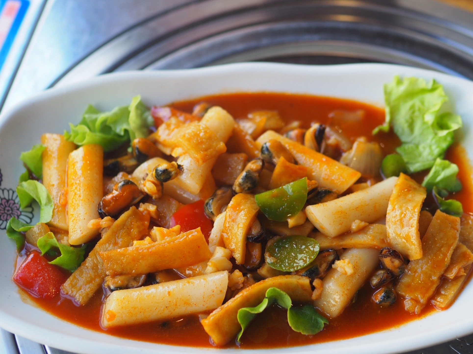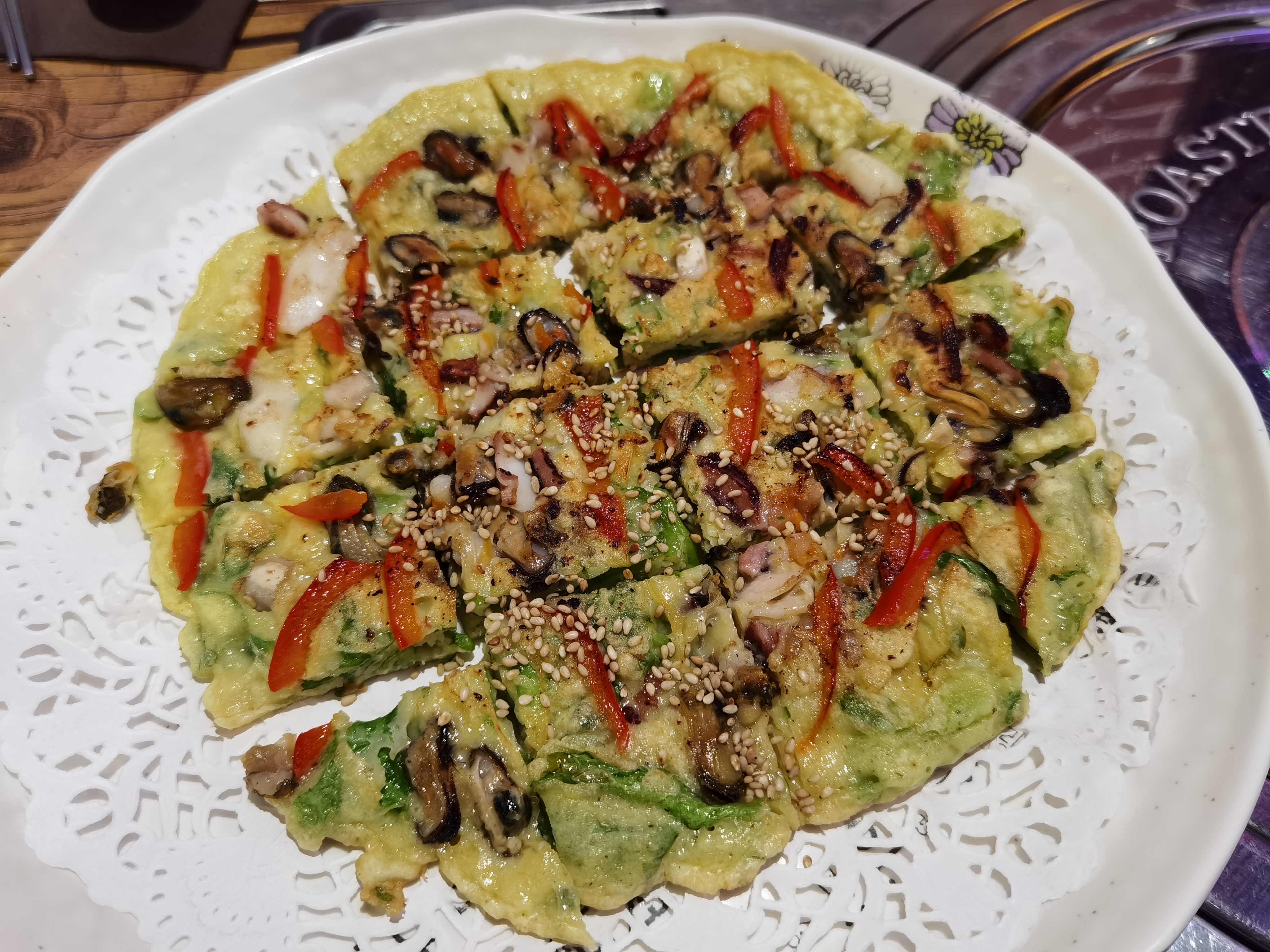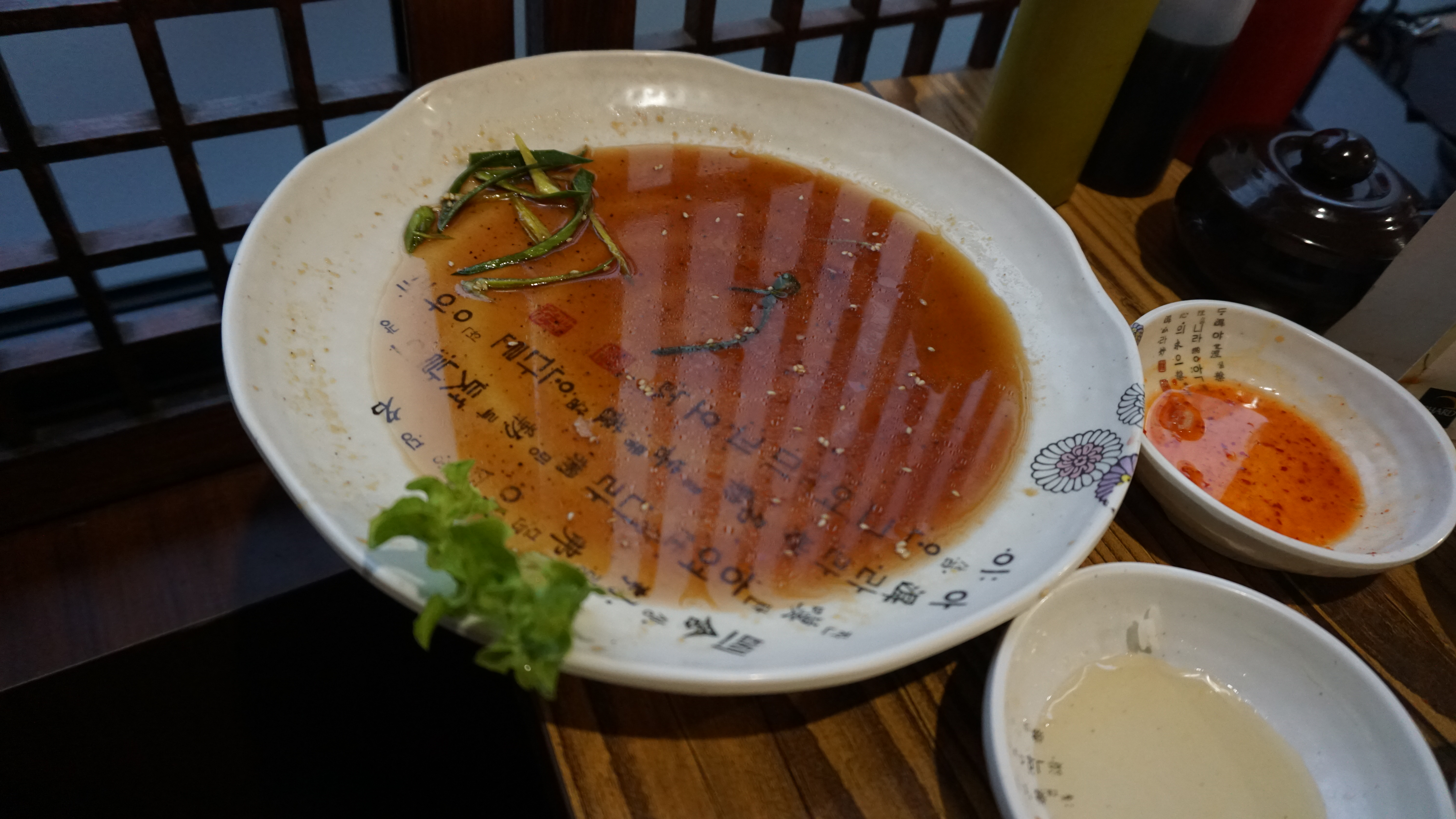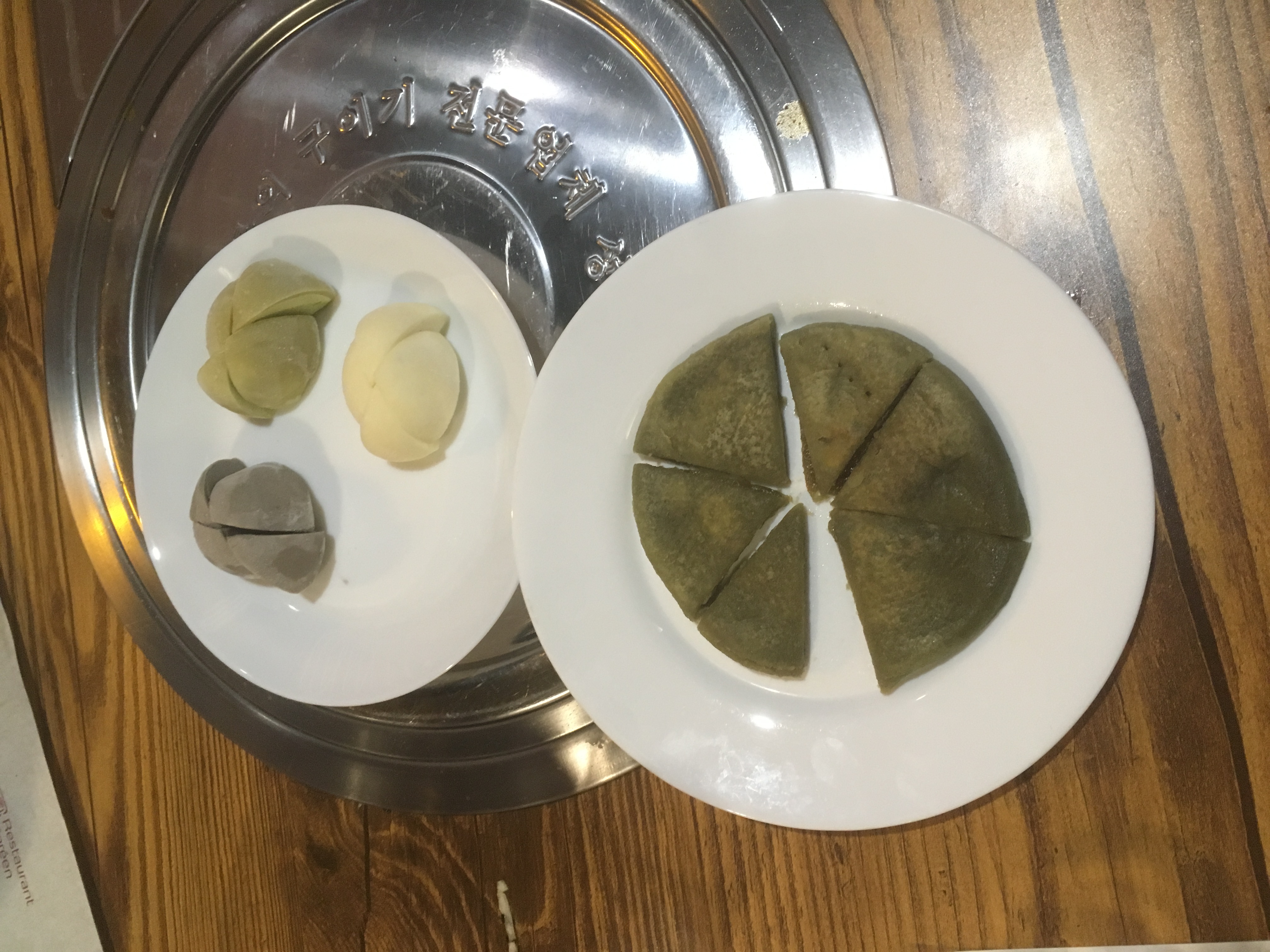 La soupe aux raviolis n'avait pas de goût et pas de saveur, les crêpes coréennes étaient OK mais pas excellentes non plus ; le bibimbap fruit de mer était trop salé...