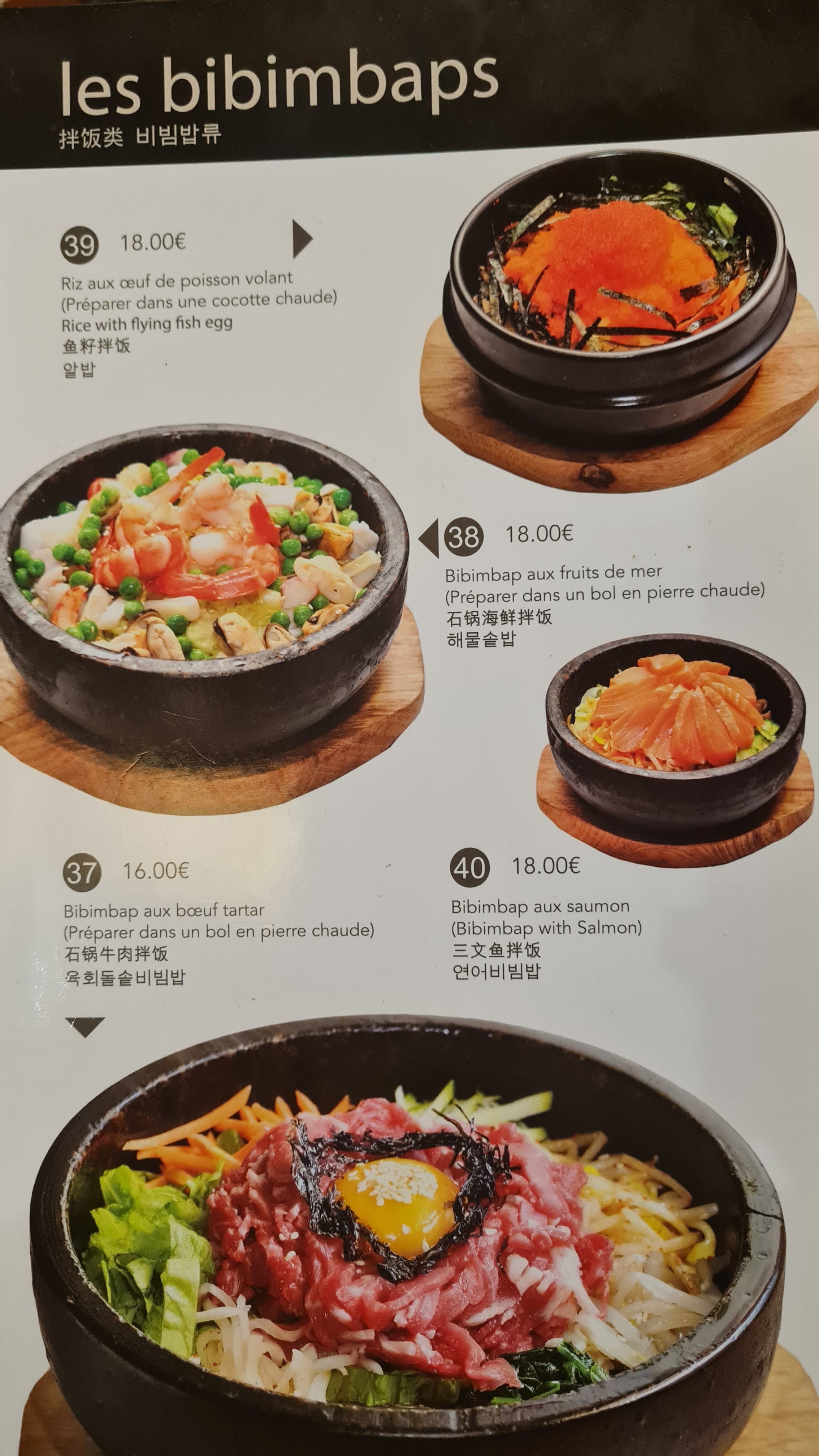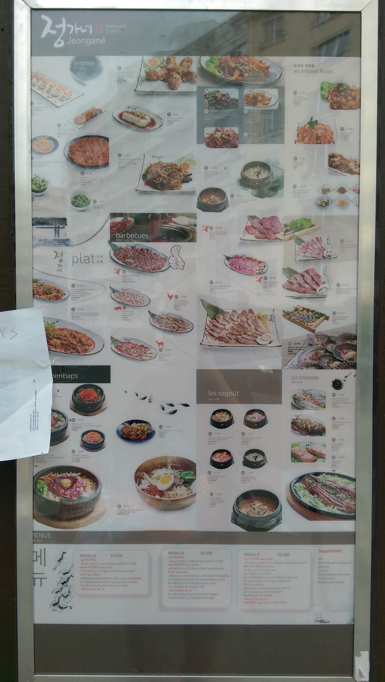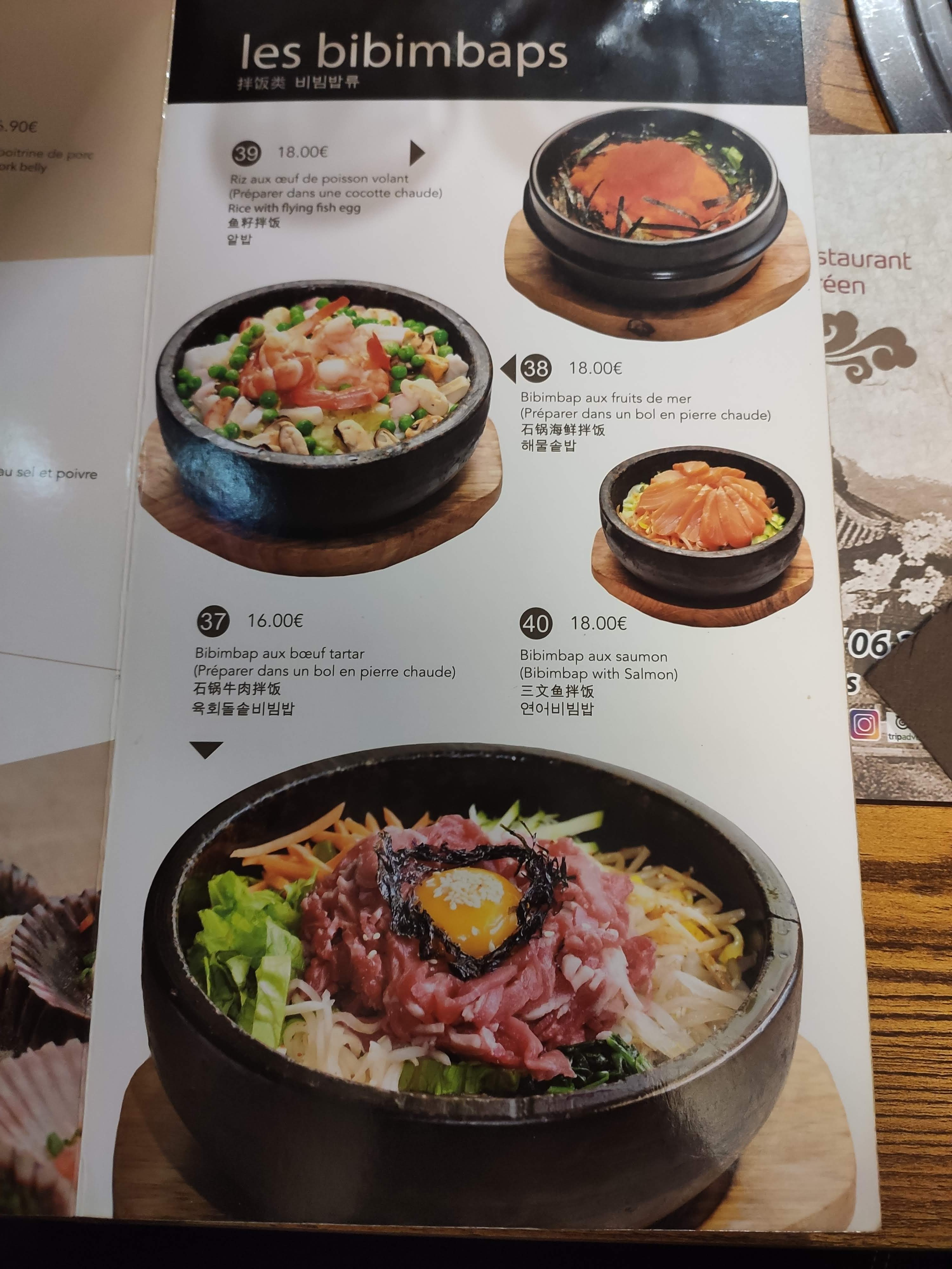 Vu avec le repas du soir a 20 €. Ce n'est pas un vrai restaurant coréen mais un chinois. Le bulgogi servi était un riz sauté. A éviter surtout vu le prix : on mange mieux dans un traiteur chinois a 10 € ...