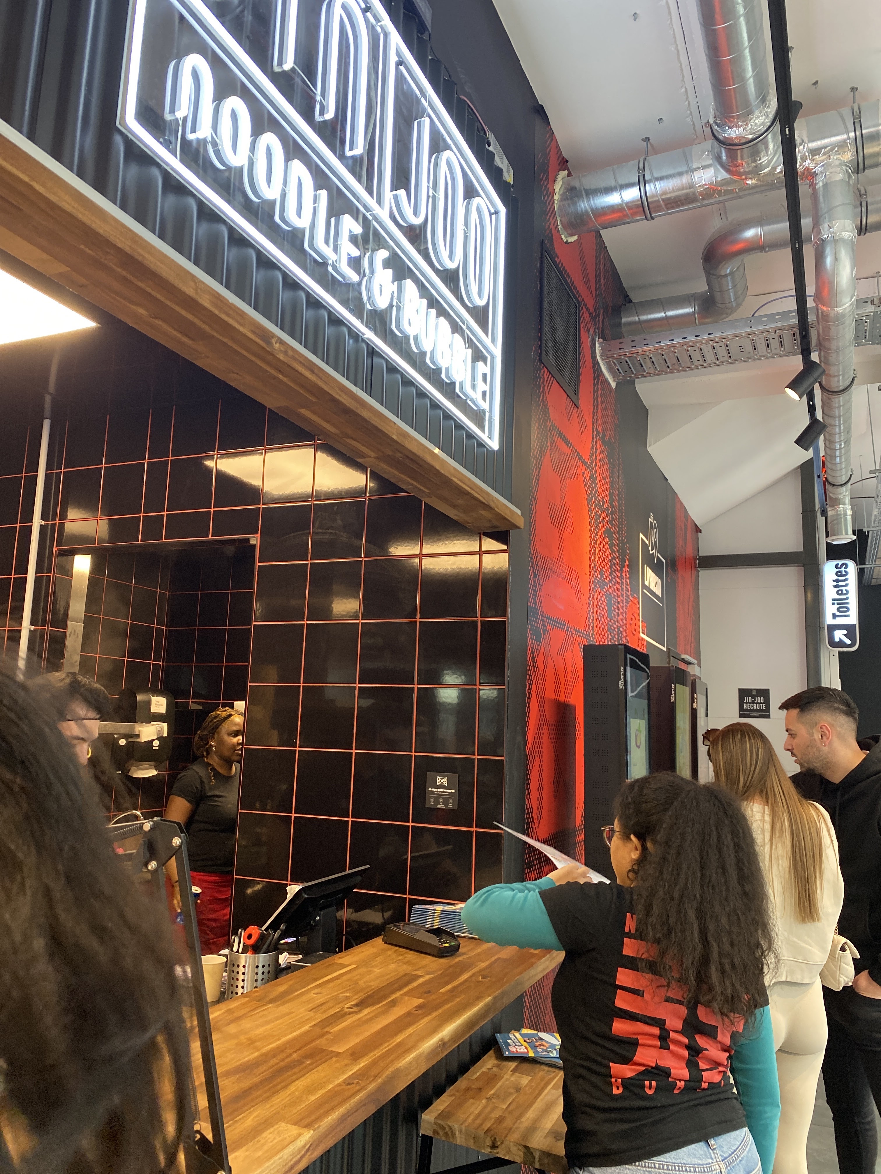 Après une visite de l'exposition Banquet à la Cité de la Gastronomie, mon fiston et moi avons déjeuné juste à côté à JinJoo, ouvert le jour même. La déco manga est top (les posters 😍), les bornes sont simples à utiliser et surtout les nouilles que nous avons prises étaient très bonnes avec des goûts bien différents 😋 (petit b molle sur les tranches de poulet que mon fils a trouvé un peu sèches). Mention spéciale pour le BBT Purple Rain Sprite, super bon et frais 🤩 la terrasse extérieure est un vrai plus. On reviendra goûter les autres nouilles et BBT, ainsi que le mangastore à l'étage 🔥