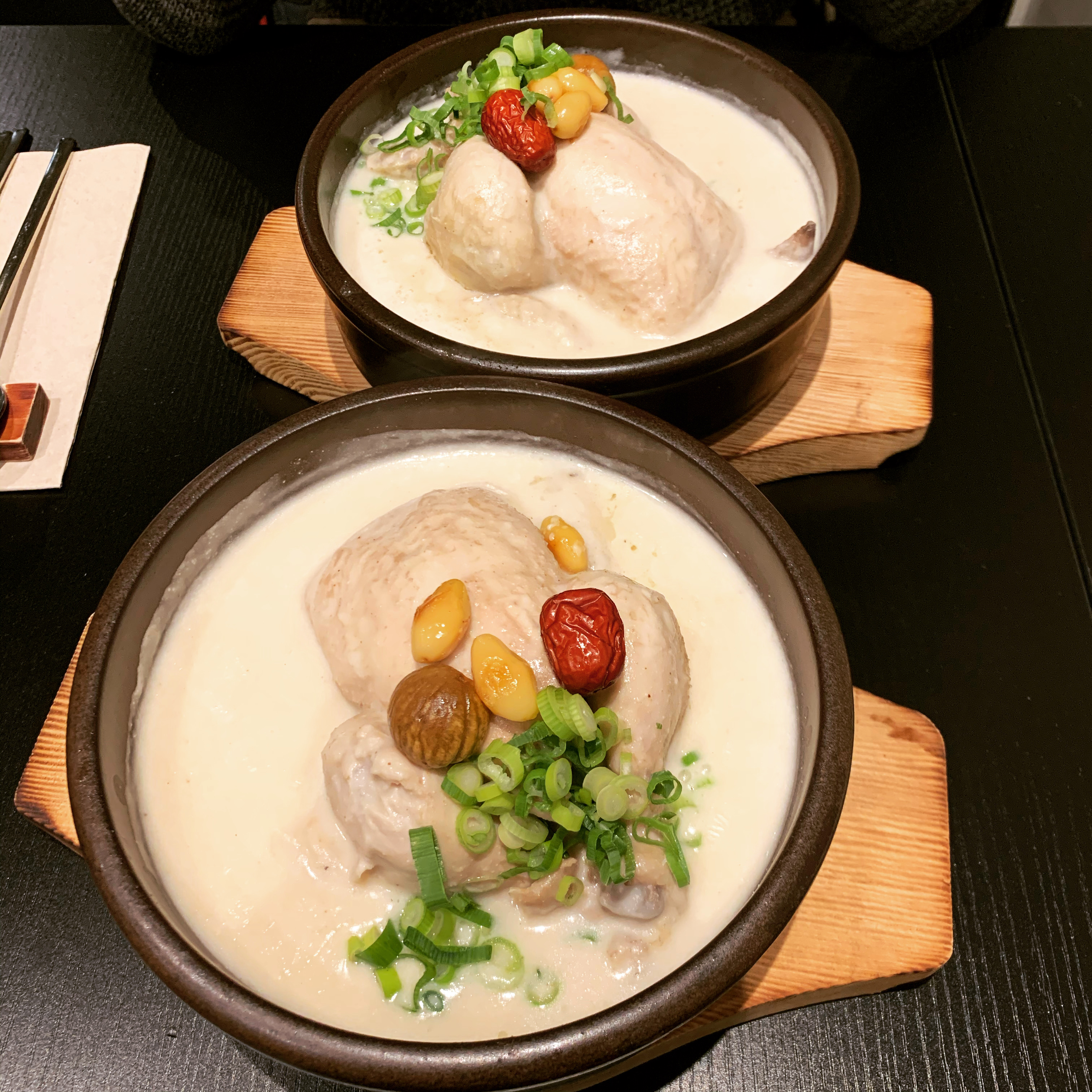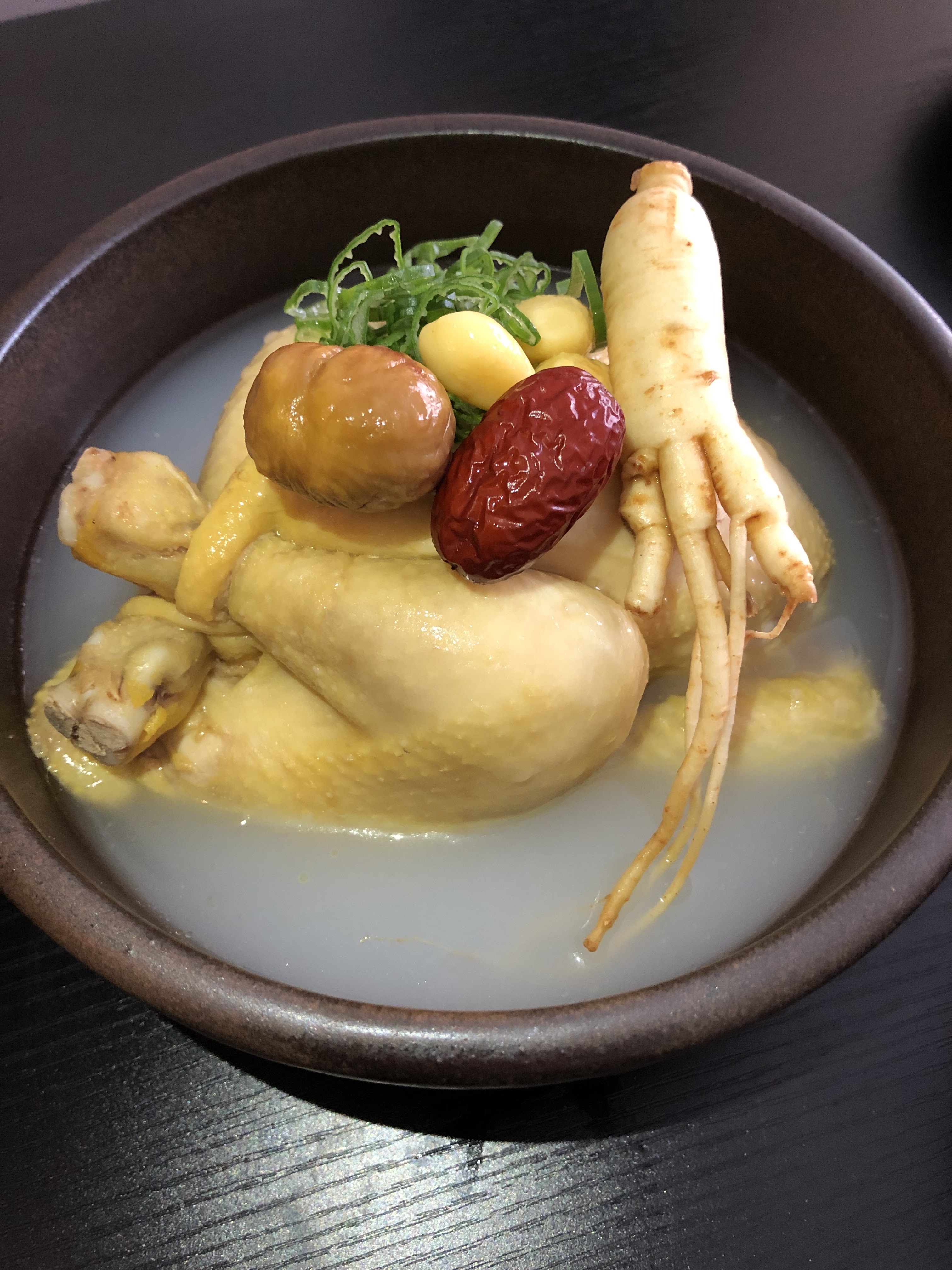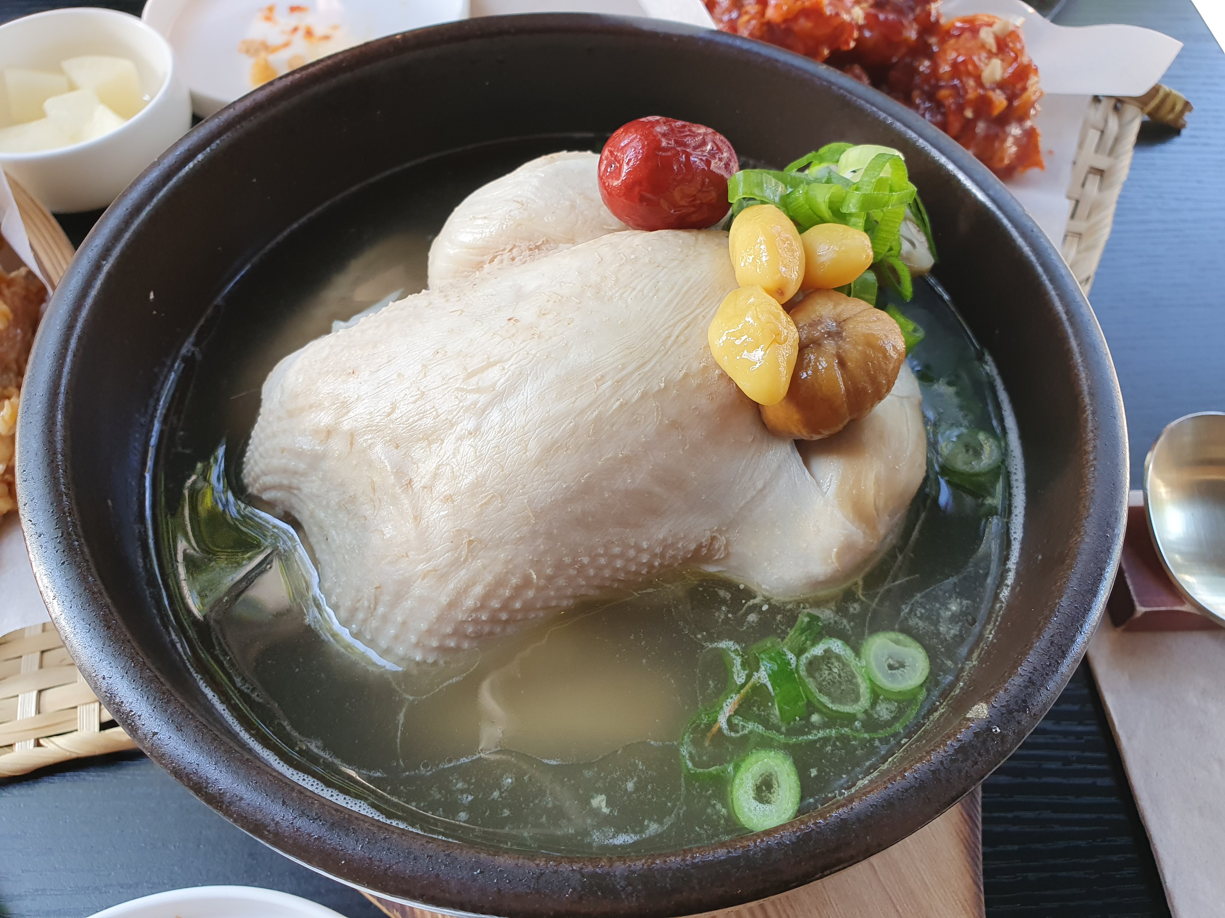 Du vrai samgyetang, meilleur que celui de Corée ! Le poulet aux crêpes aux oignons verts est tellement délicieux :)