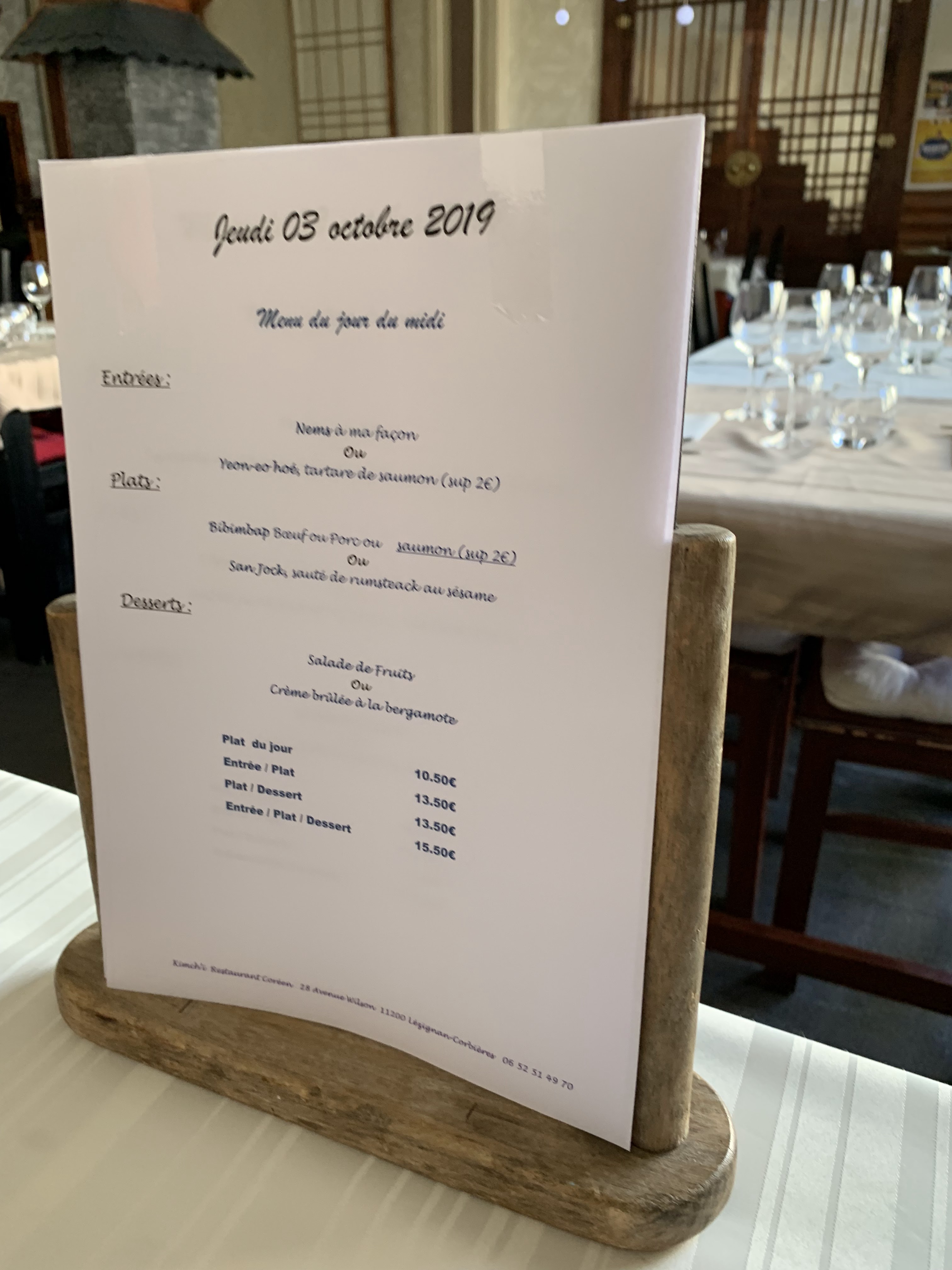 Je n'aurai pas imaginé manger coréen et ce fut une très agréable surprise, la carte est courte et la cuisine est excellente et nous nous sommes régalés, le patron est accueillant et aimable expliquant bien les plats préparés par son épouse et il nous a conseillé pour le très bon vin que nous avons acheté à la cave du château du moulin
