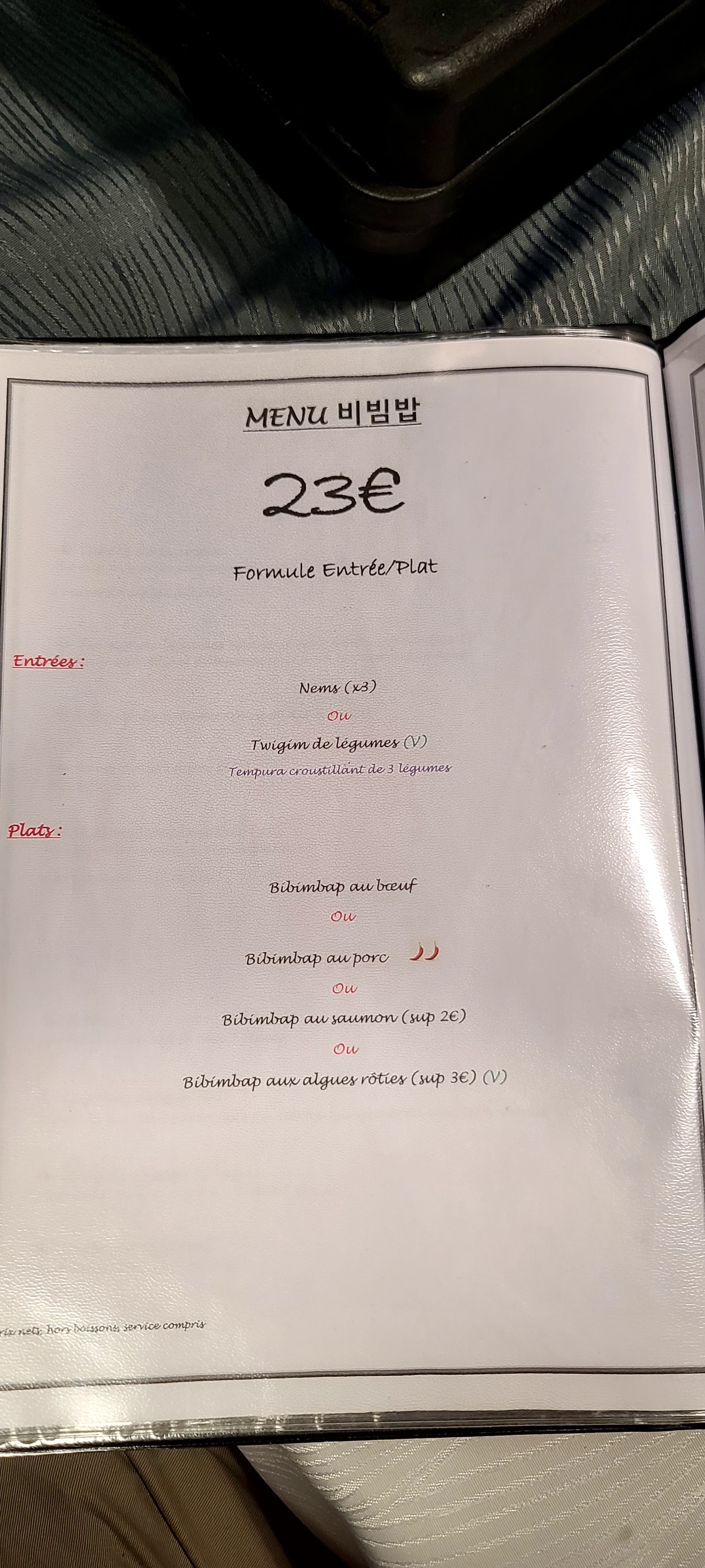 Superbe restaurant coréen Très bonne nourriture et bien expliquée Places de parking à côté Le bibimap au bœuf est à tomber par terre