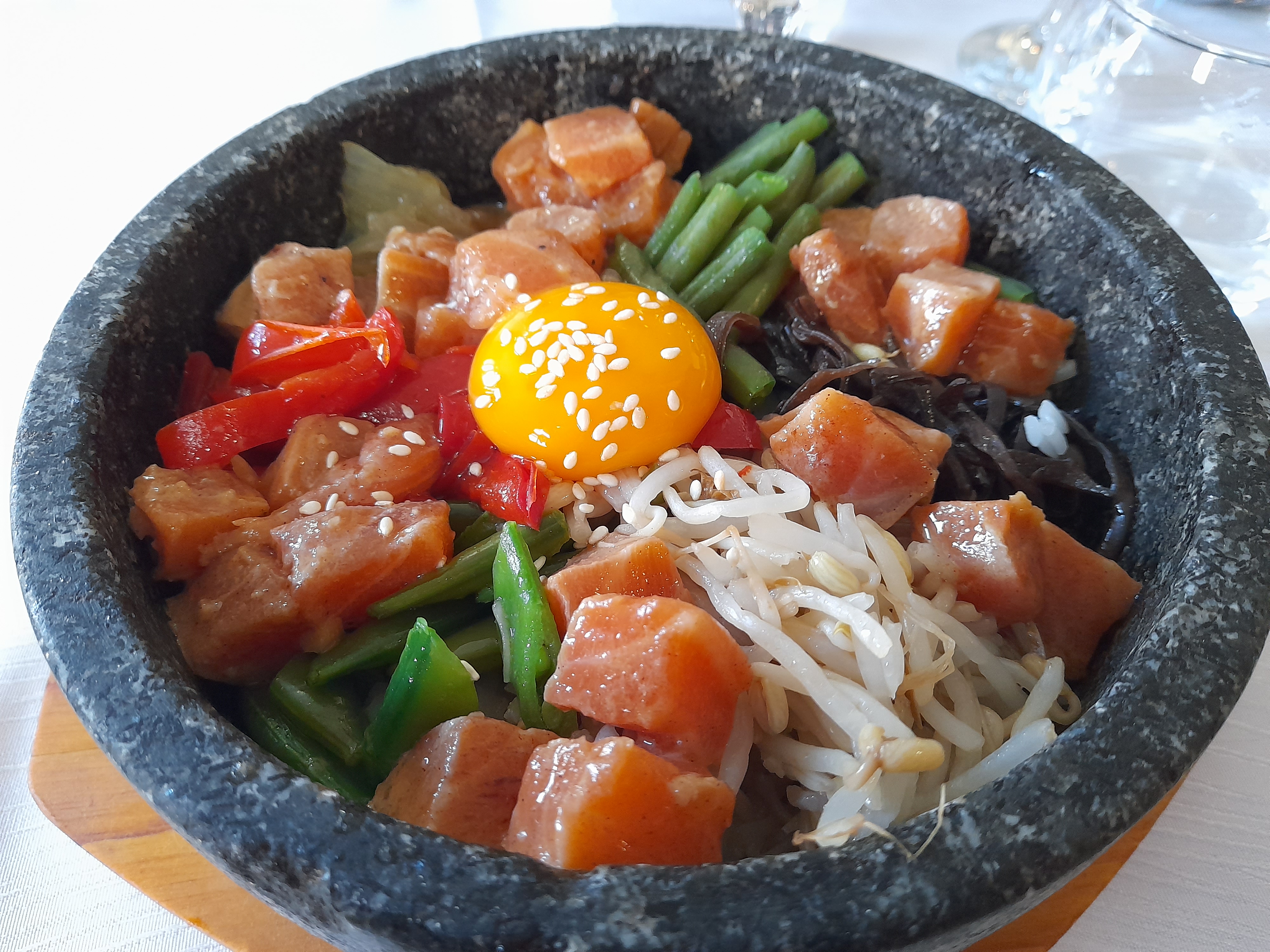 Le meilleur canard laqué de ma vie découverte du bibimbat plat emblématique de la Corée dans son bol en pierre de lave brûlante excellente entrée excellent plat excellent dessert tout fait maison avis aux amateurs