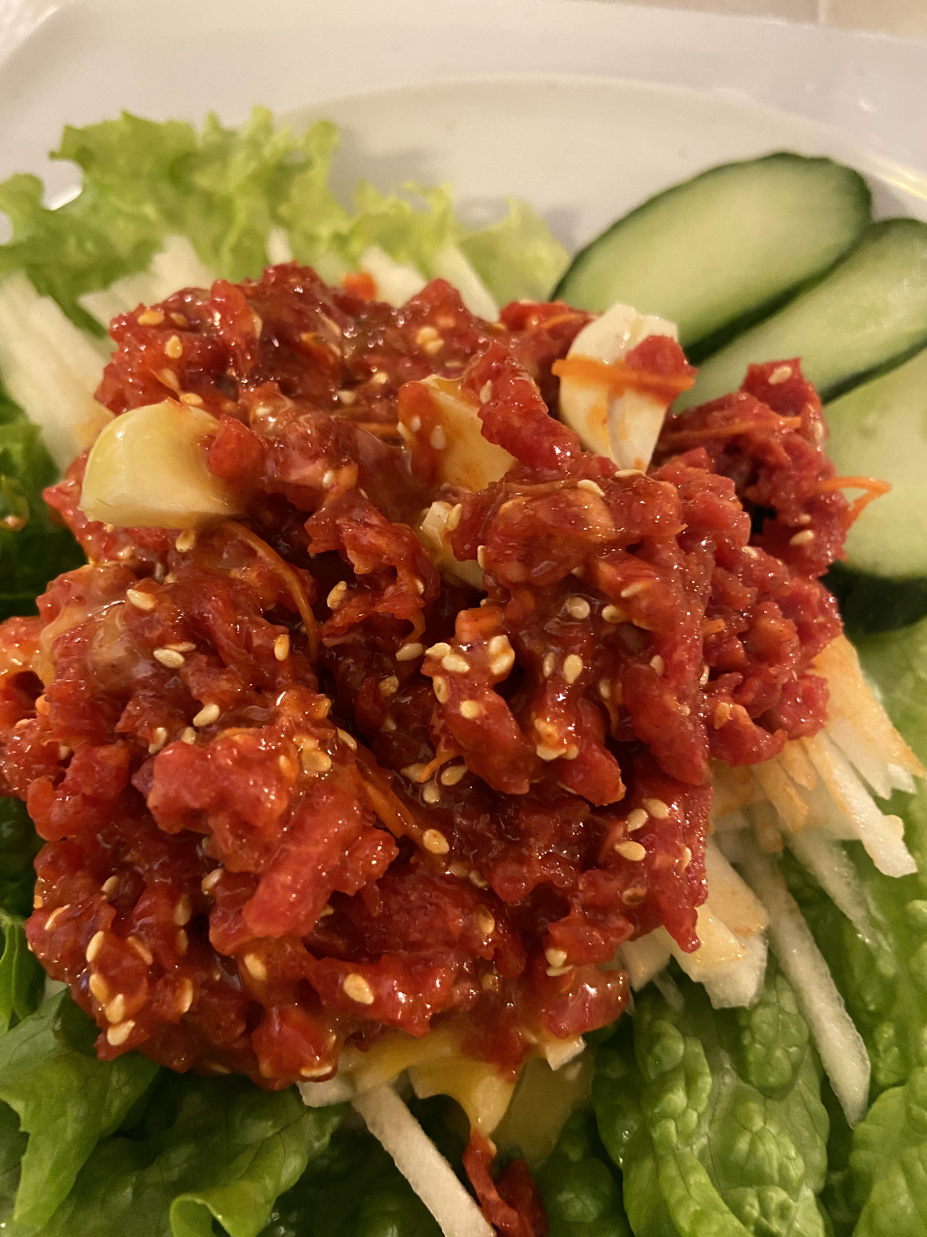 Le tartare de bœuf est vraiment délicieux. J'ai trouvé que Tteokbokkil avait un peu trop d'ail pour moi.
