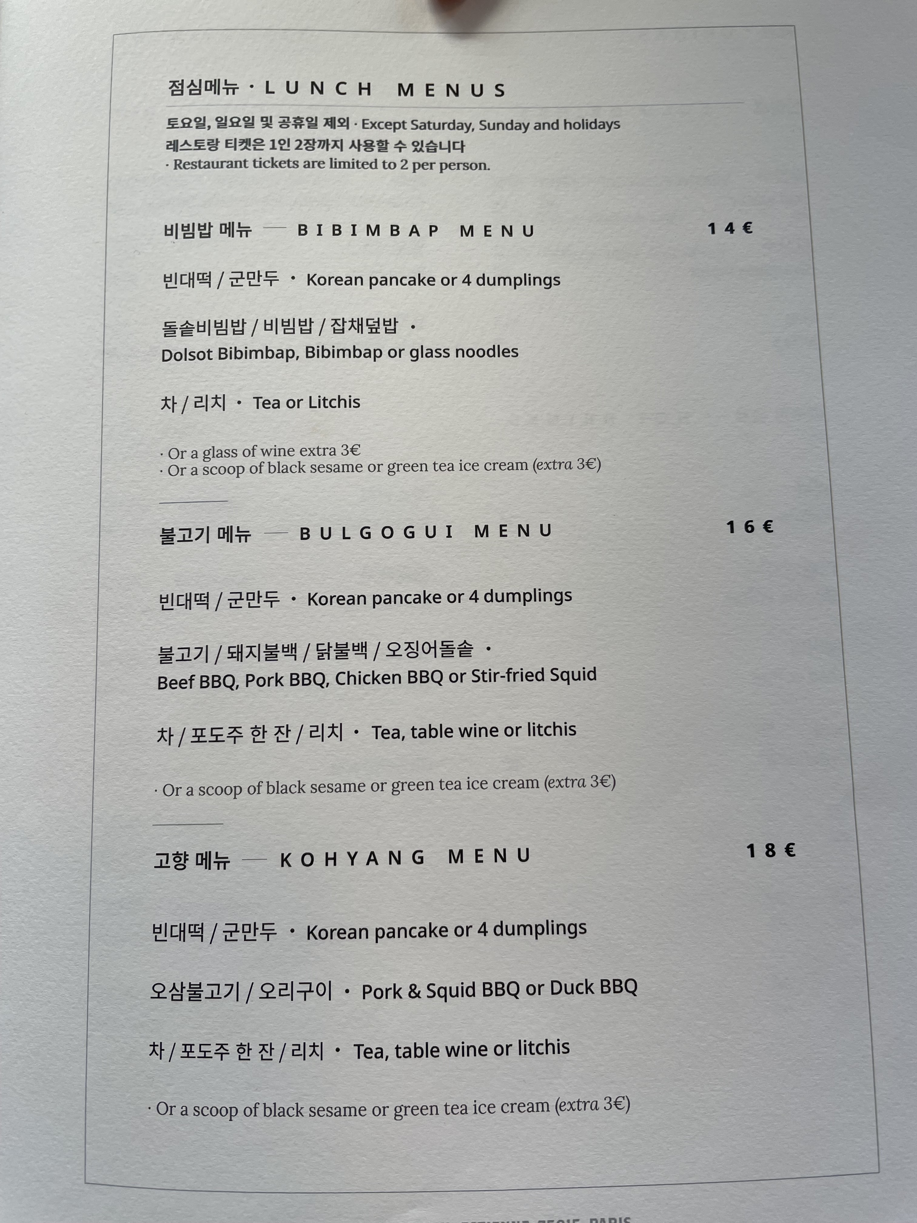 Nous avons très bien mangé le midi. Il y a 3 menu, deux avec BBQ et un avec Bibimbap. Nous avons pris un des menu avec BBQ, l'assaisonnement de la viande était très bon, le kimchi bien piquant comme il faut ! Le personnel a été très attentionné et à fourni de chouettes couverts à notre enfant. La glace au sésame maison était vraiment délicieuse. Nous reviendrons dès que possible...