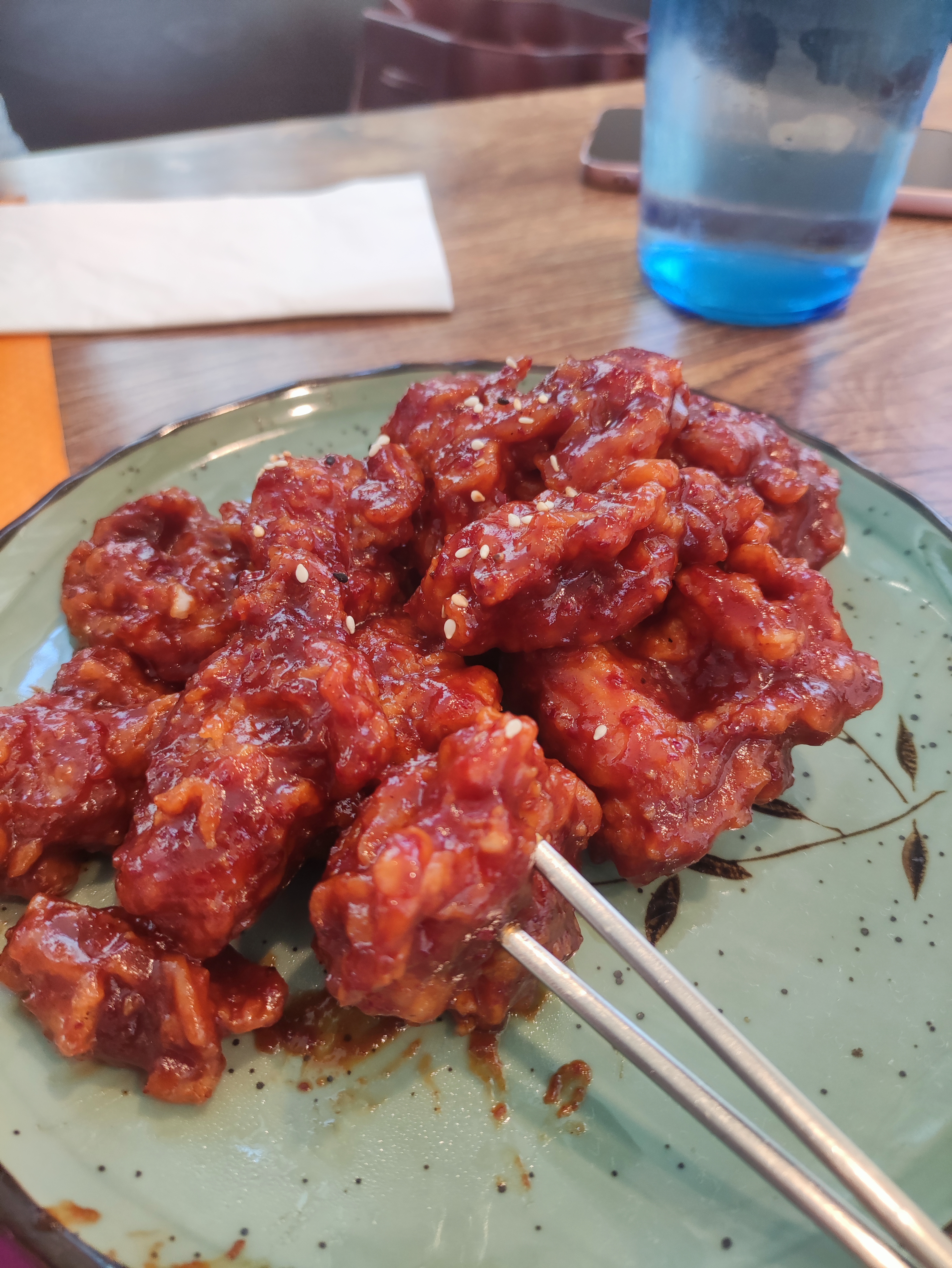Restaurant très cosy, climatisé. L'accueil est très chaleureux, la nourriture excellente. Les Mandu sont très bons, le japchae n'est pas très sucré. Le poulet frit coréen est bien croustillant, un peu sucré et légèrement pimenté. Tout ce qu'il faut!