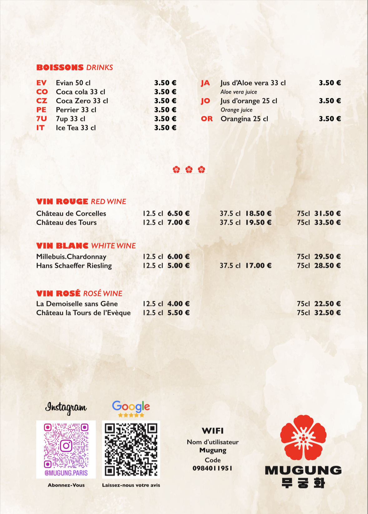 Excellente expérience chez Mugung! Restaurant coréen sur Rue saint denis, je vous le recommande fortement. Pas très voyant a première vue mais dès l’entrée je me suis sentie dans une atmosphère zen, agréable et je savais que j’allais bien manger. 3eme fois pour moi dans ce restaurant, je peux vous conseiller : - Corn cheese chicken -BONELESS CARAMEL - Beoseot Jeongol entrecôte -Galette fruit de mer Le service est très agréable, la cuisine est bonne et le lieu est chaleureux. Un 5 ⭐️ bien mérité.