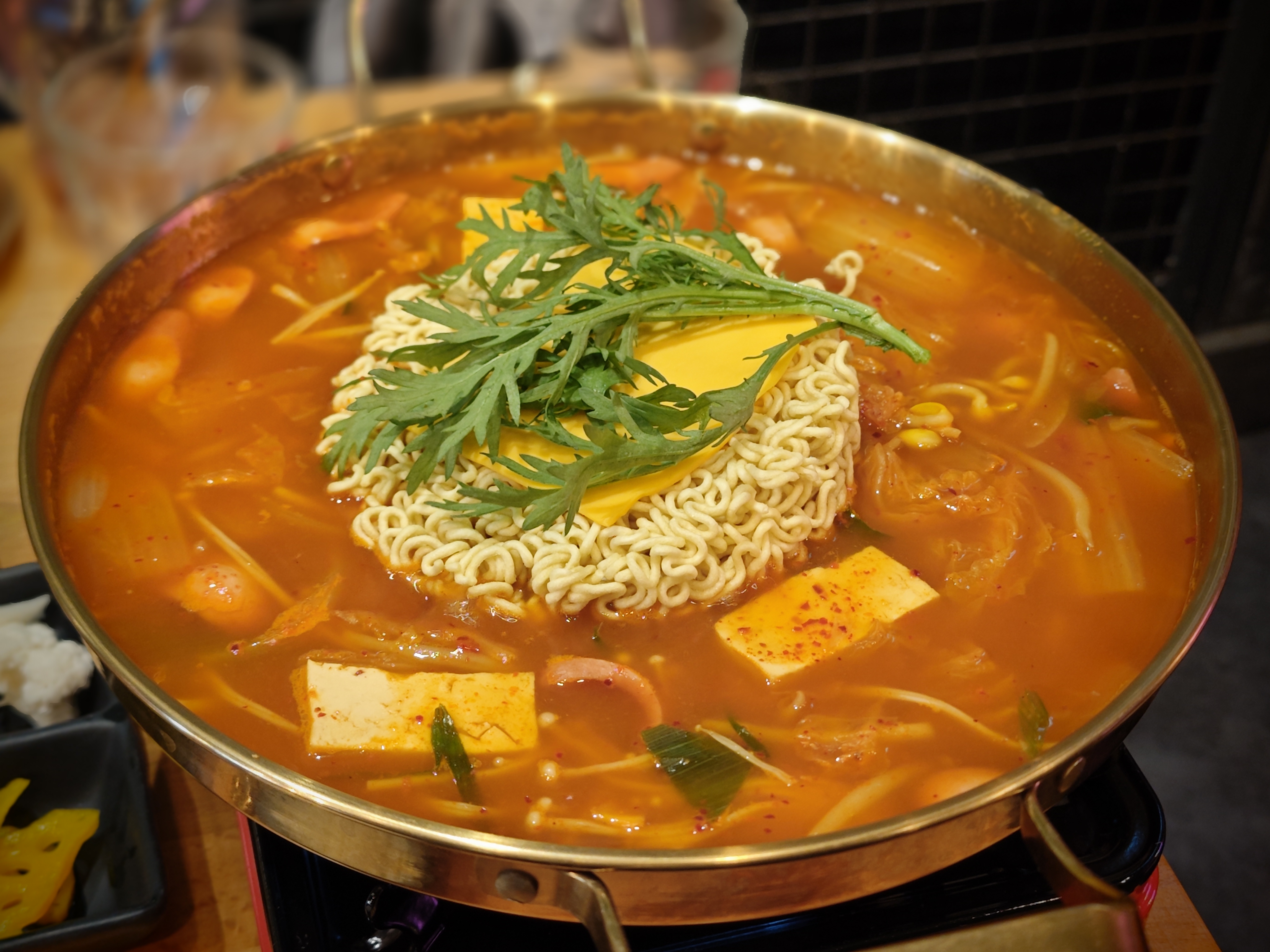 J'ai enfin pu prendre la fondue de l'armée Budae Jigae. C'est bon mais c'est quand même assez pauvre au niveau des ingrédients : du chou, du tofu, des nouilles instantanées, des saucisses de porc.. Bof bof. Sur la photo du restaurant il y a beaucoup plus d'ingrédients qu'en réalité... Je ne conseille pas.