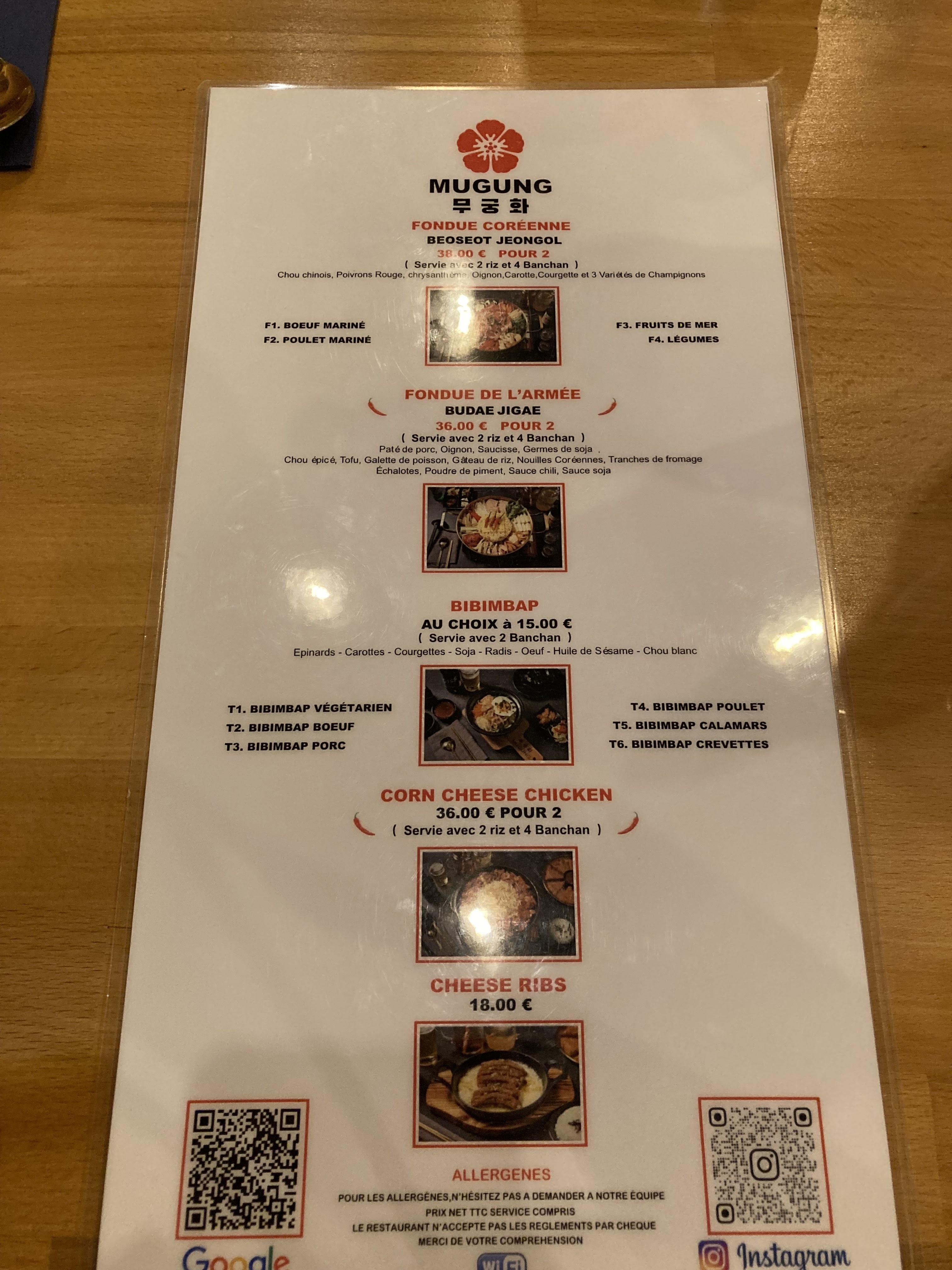 Nous avons mangé notre premier repas Coréen (fondue) chez Mugung et nous n avons pas été déçu. Tant par la qualité, la quantité, la variété des ingrédients mais également l accueil qui nous a été réservé. Nous y retournerons volontiers pour essayer d autre plat.