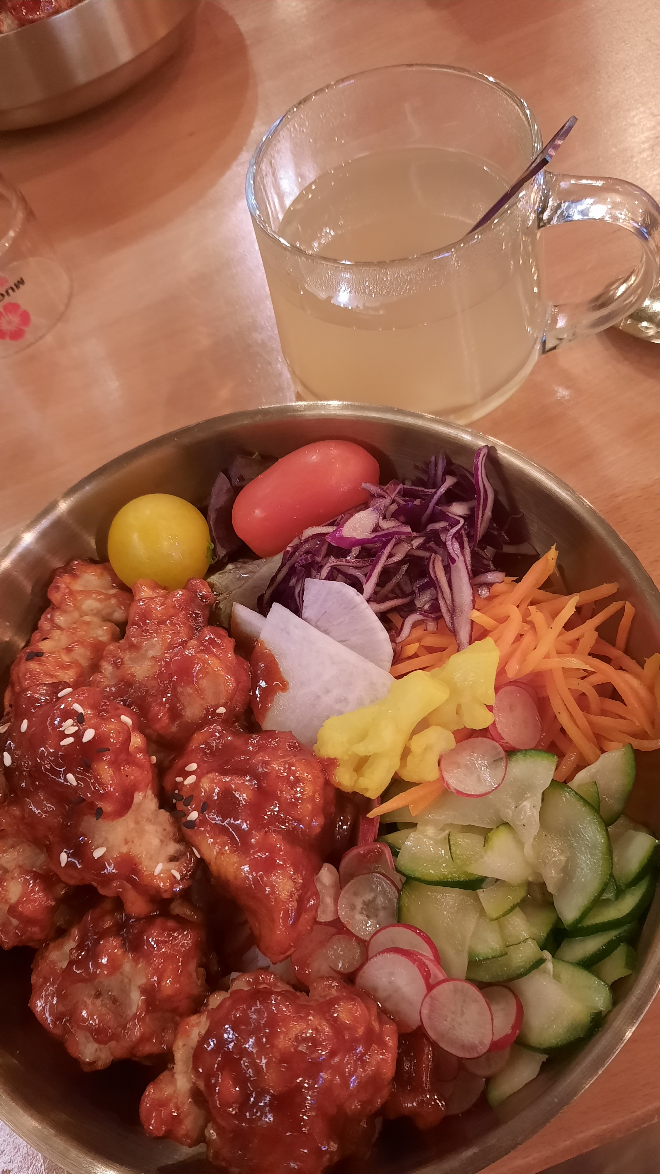 Bibimpap poulet frit épicés avec du thé miel et gingembre. C'était très bon.
