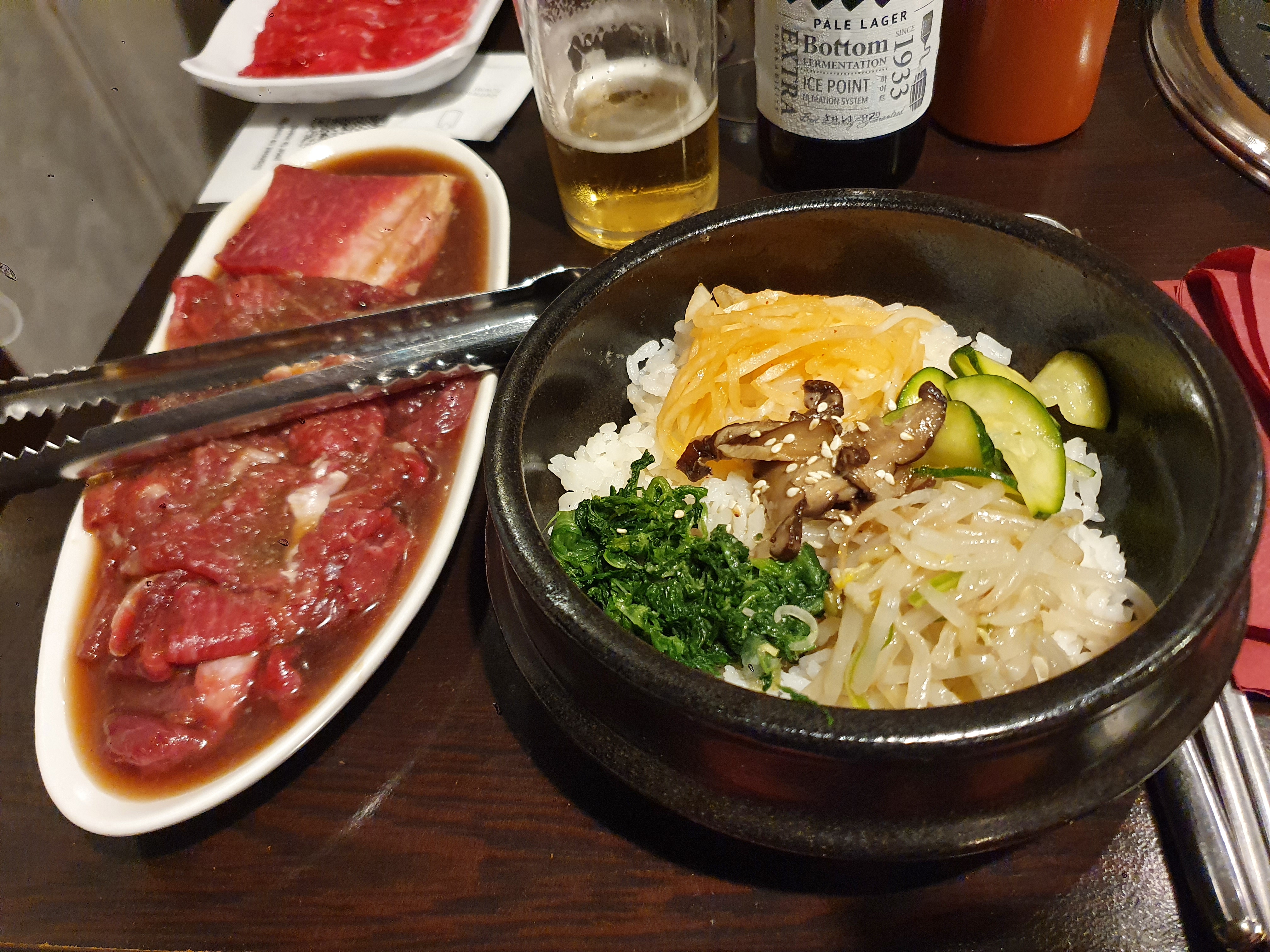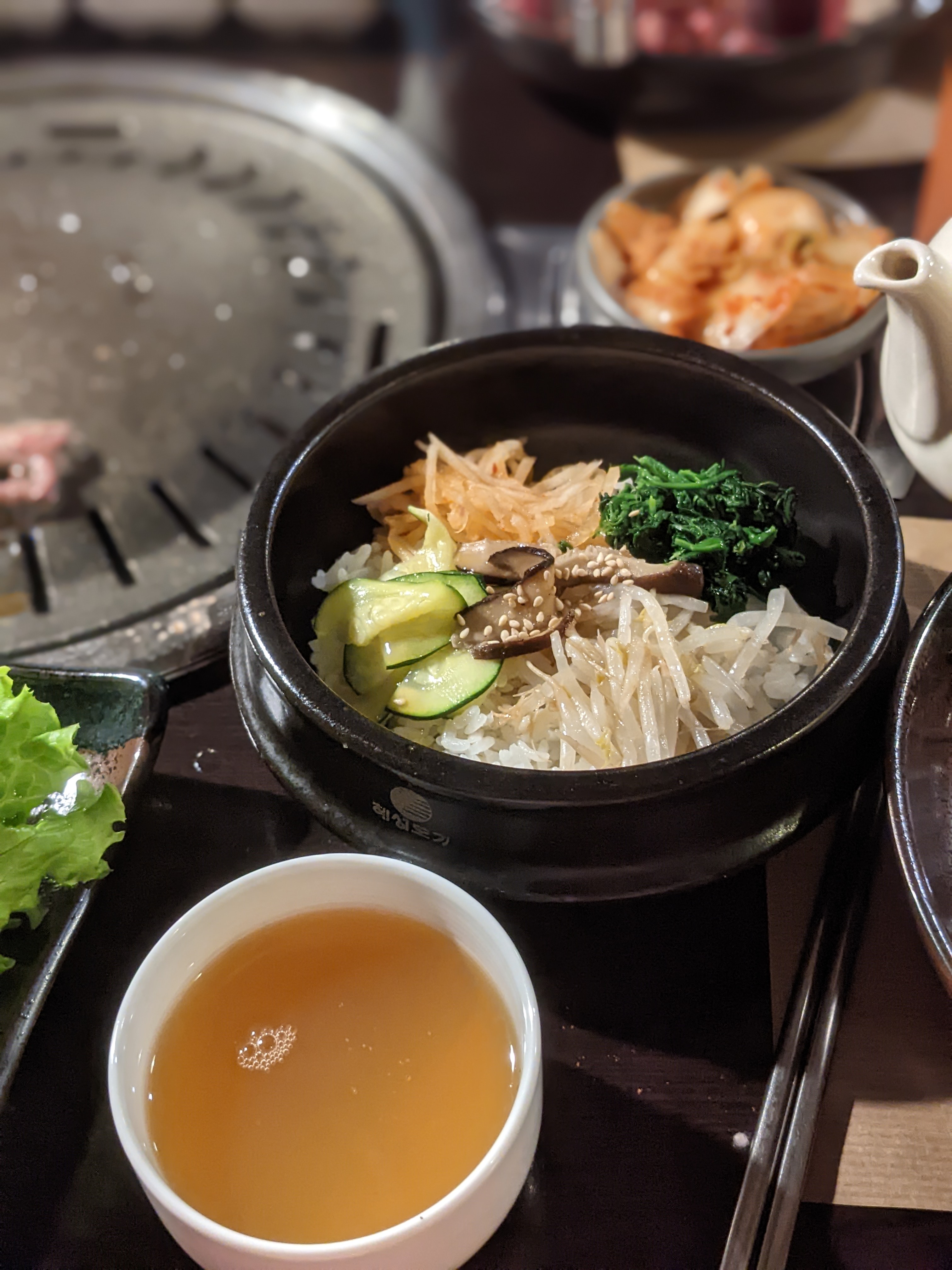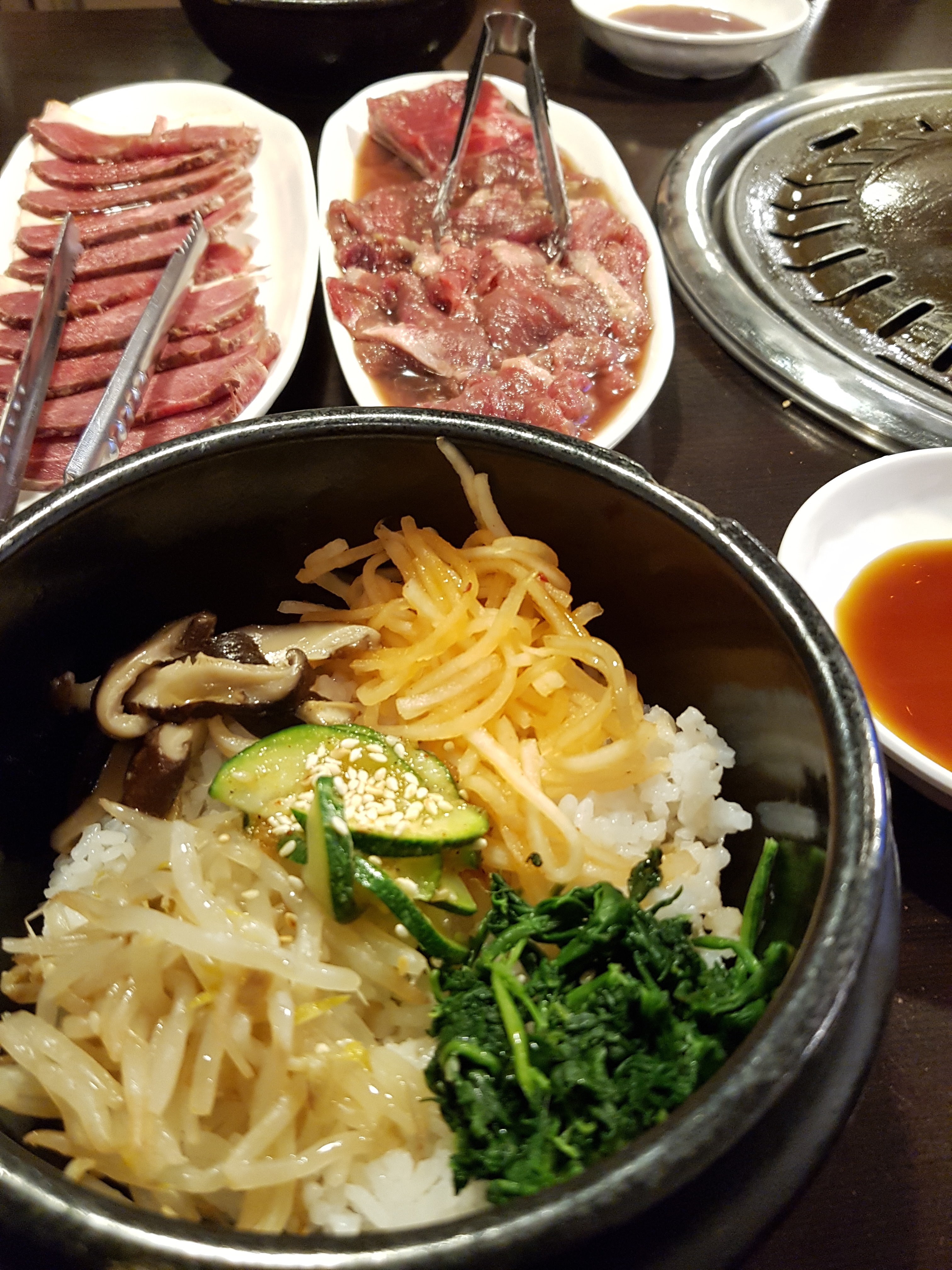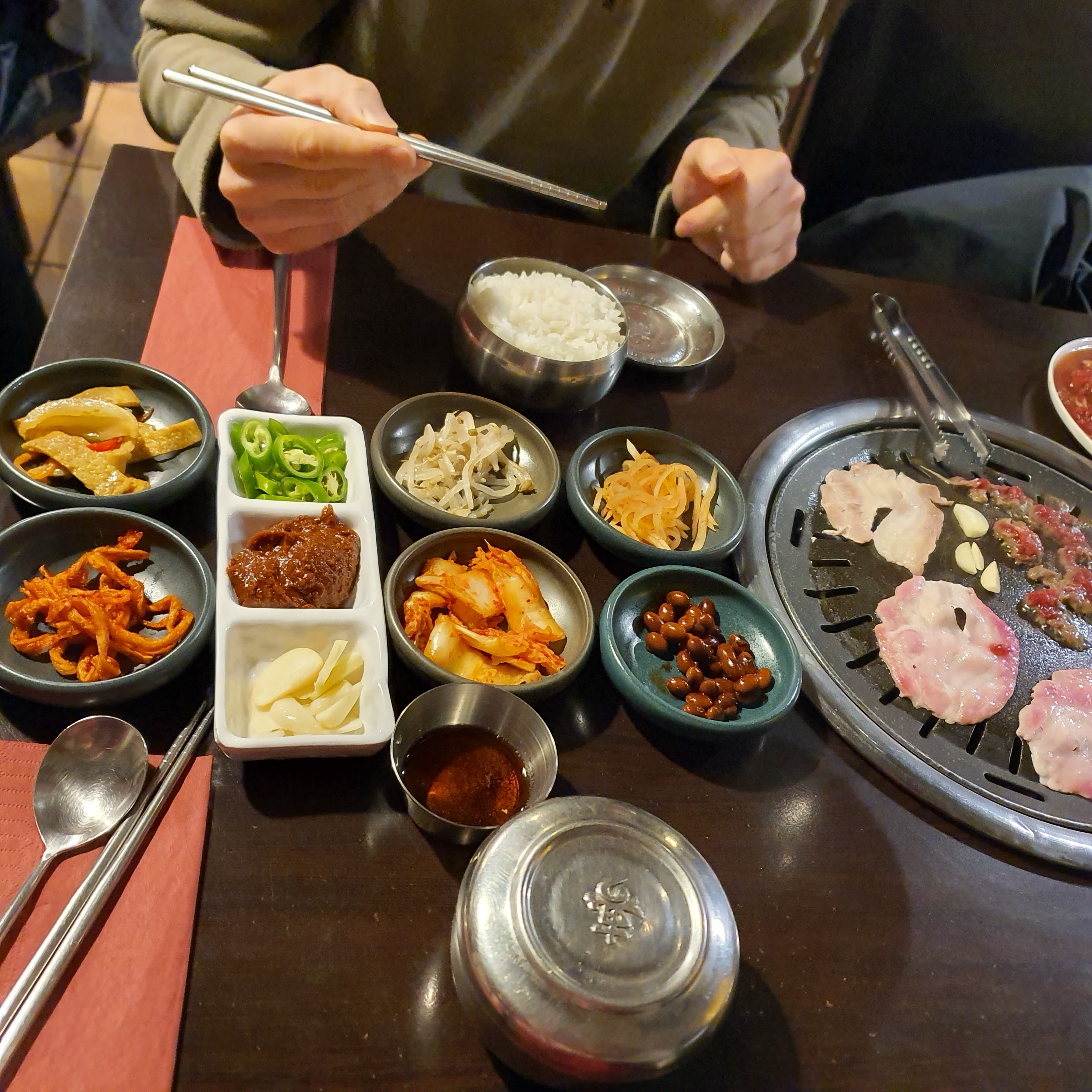 Déçu par ce restaurant. Ambiance morose, service convenable mais sans le sourire. Portions de viandes un peu petites. Vin âpre. Entrées ok. Le riz bibimbap était servi dans un bol de pierre froid, ce qui retire tout l'intérêt du bol de pierre (il est censé être encore chaud ce qui permet de faire griller un peu le riz et tous les ingrédients lorsqu'on les mélange avec la sauce pimentée ; au lieu de cela les légumes étaient froids). J'aime beaucoup les barbecues coréens habituellement donc suis assez déçu car ne répondait pas à mes attentes :(