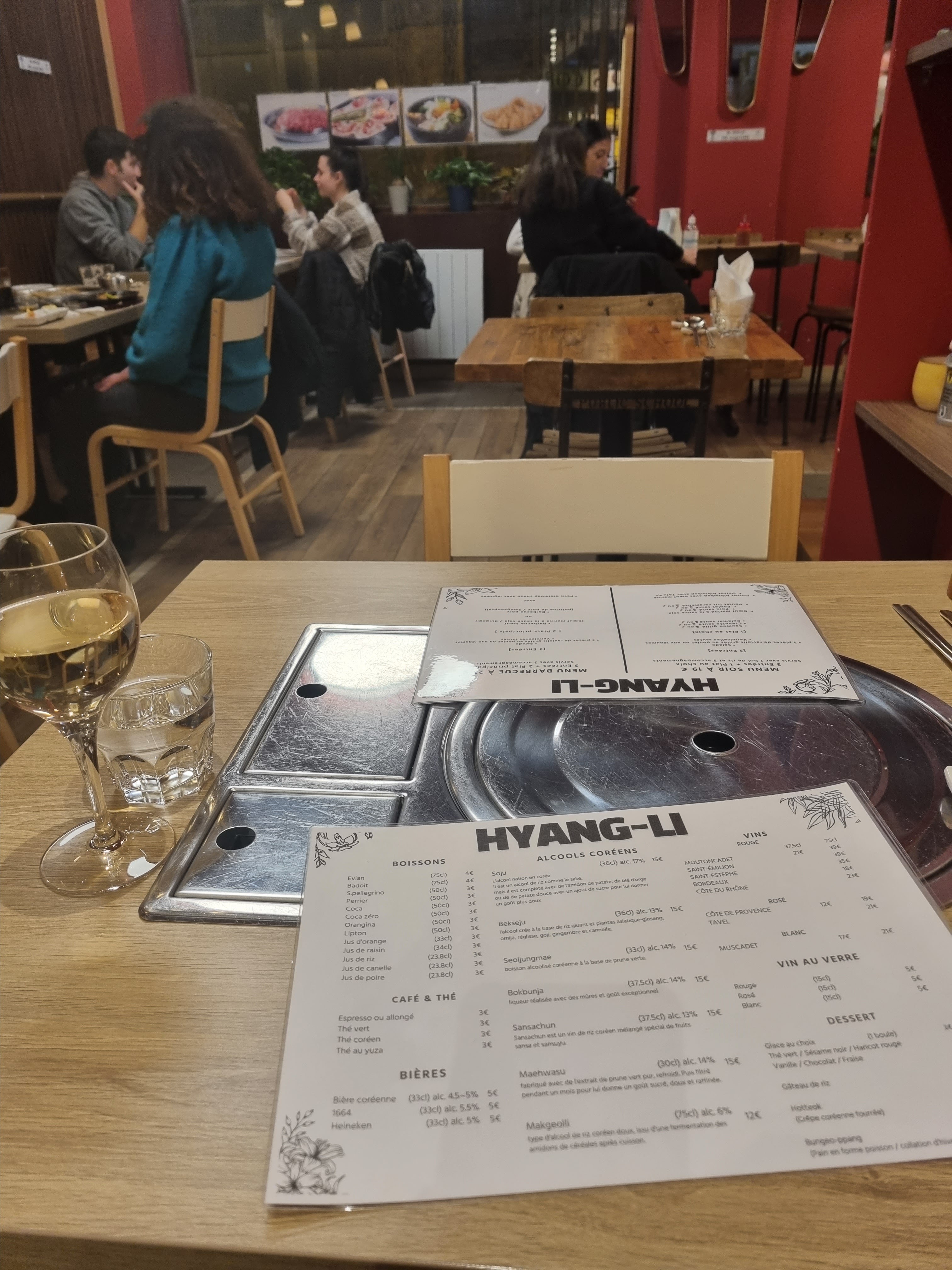 Un restaurant parfait pour déguster un barbecue coréen. Vous pouvez y faire griller vous-même votre viande grâce à une plaque chauffante située au milieu de la table et décidez ainsi de votre cuisson. Accompagné ça d'un bon Bibimbap végétarien ou d'un simple bol de riz et vous serez rassasié pour la journée ! Et si les barbecue ne sont pas de votre préférence, pas de soucis ! Le restaurant propose un bon nombre de plats coréens différents à la carte. Vous trouverez donc sûrement votre bonheur. Les alcools coréens proposés sont classiques mais se marient parfaitement avec leurs plats. Pour ce qui est des tarifs, je recommande fortement les formules midi barbecue qui sont beaucoup plus avantageuses (commençant à partir de 12€) contrairement au prix assez conséquent du soir.