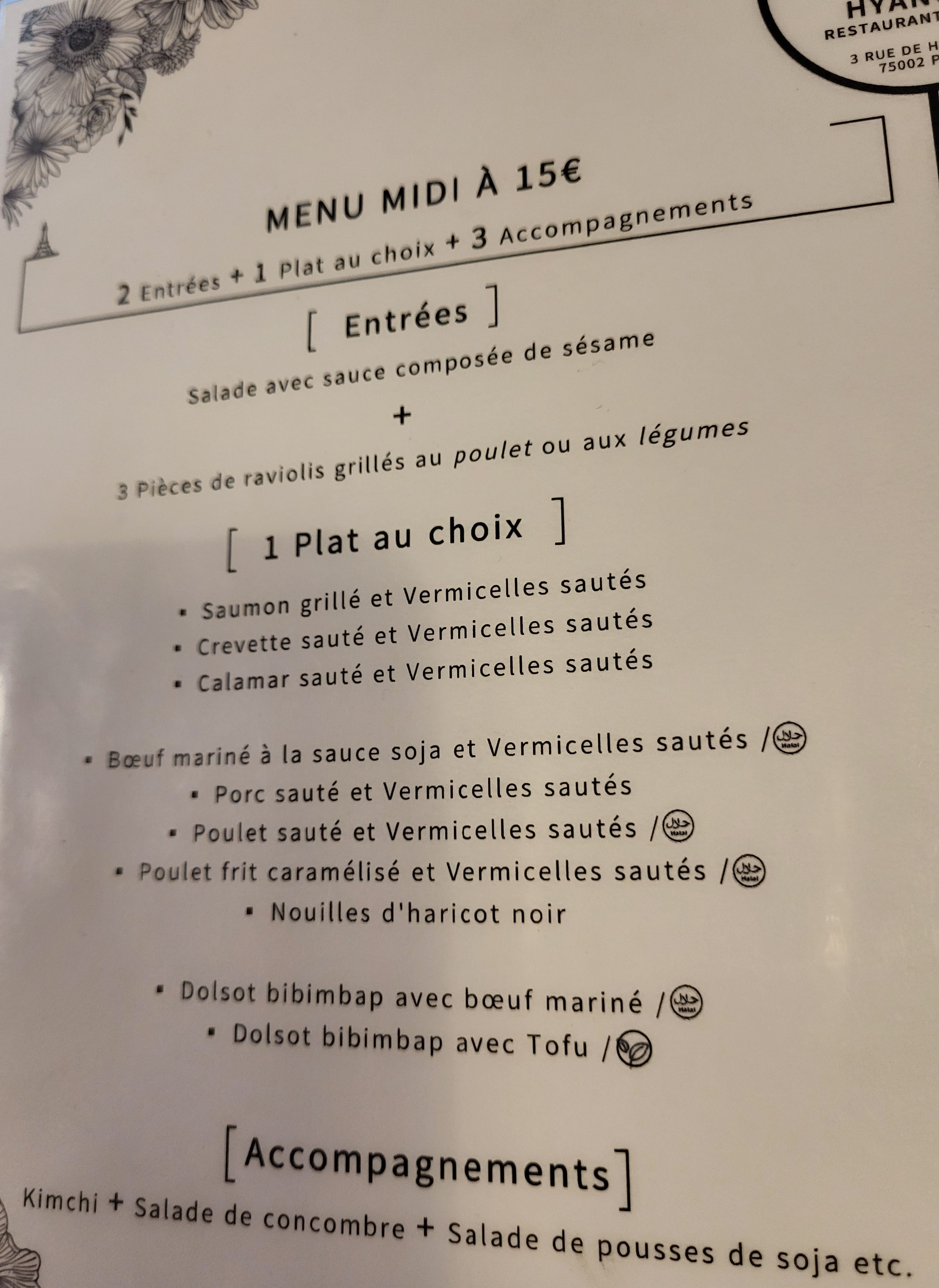 Dans mon souvenir c'était mieux. Là le soir ils vous imposent 2 menus (19€ 2 entrées imposées une salade et 3 vapeurs au poulet et un plat au choix, l'autre est autour de 24 € et il doit y avoir le barbecue j'ai pas regardé). Rien a la carte La carte des desserts était bof. J'ai mangé dans de très bons restaurants coréen et celui ci m'a déçue.