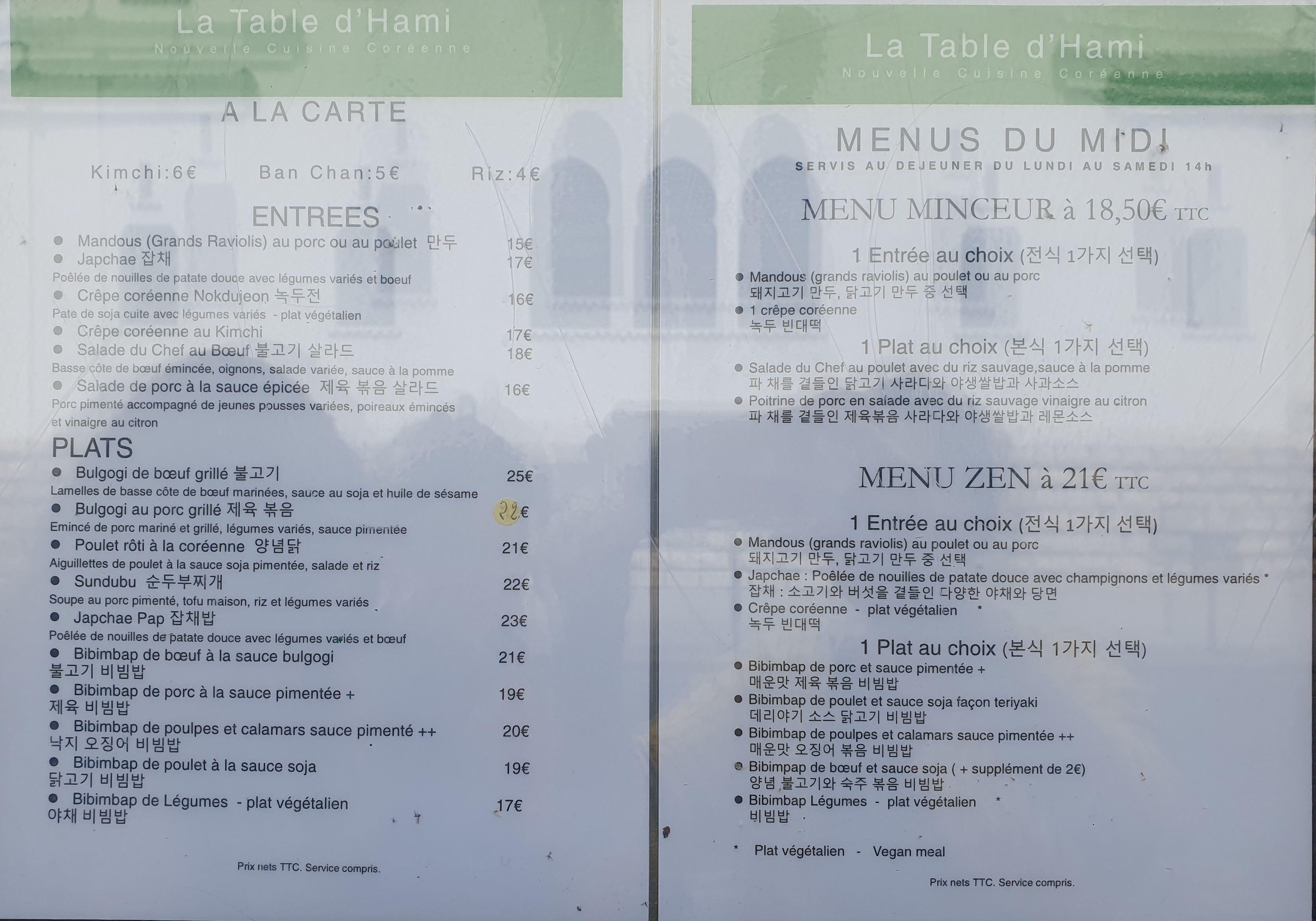 Bibimbap de légumes en plat du jour à 17,- euros. C'est du frais et c'est excellent. Et le kimchi à 6 euros est très bien aussi. Pas très piquant mais bien croquant. J'y retournerai volontiers. Le service est aussi de bonne facture, souriant et serviable.