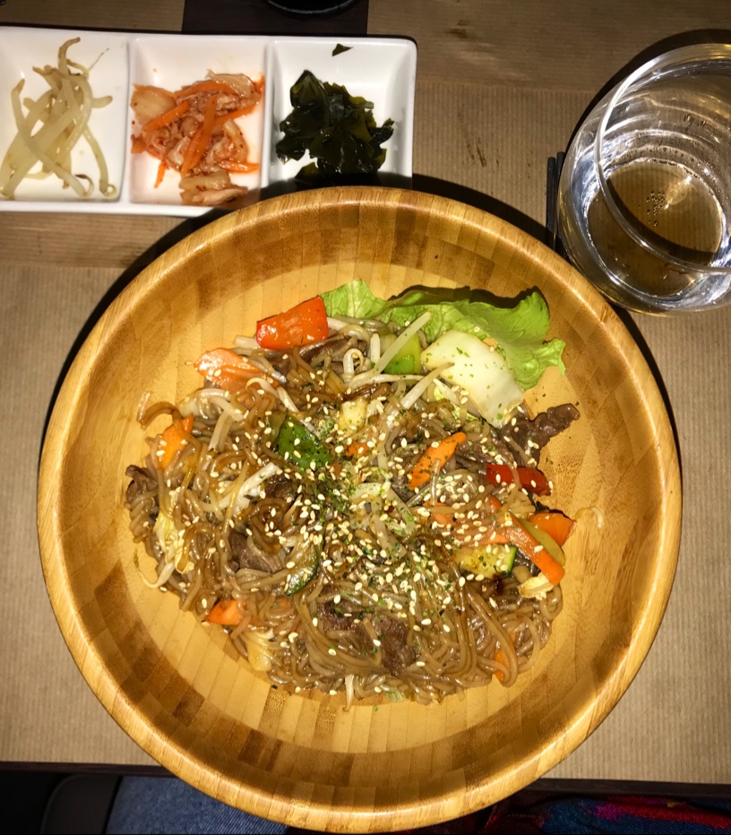 J'ai pris un Japchae avec du porc épicé. Ça fait le travail, mais je n'ai rien trouvé de transcendant sur les saveurs (avis purement personnel). C'était un plat avec des légumes sautés, donc c'est peut-être la nature du plat qui veut ça. Je reviendrai tester d'autres éléments notamment les hors d'oeuvres