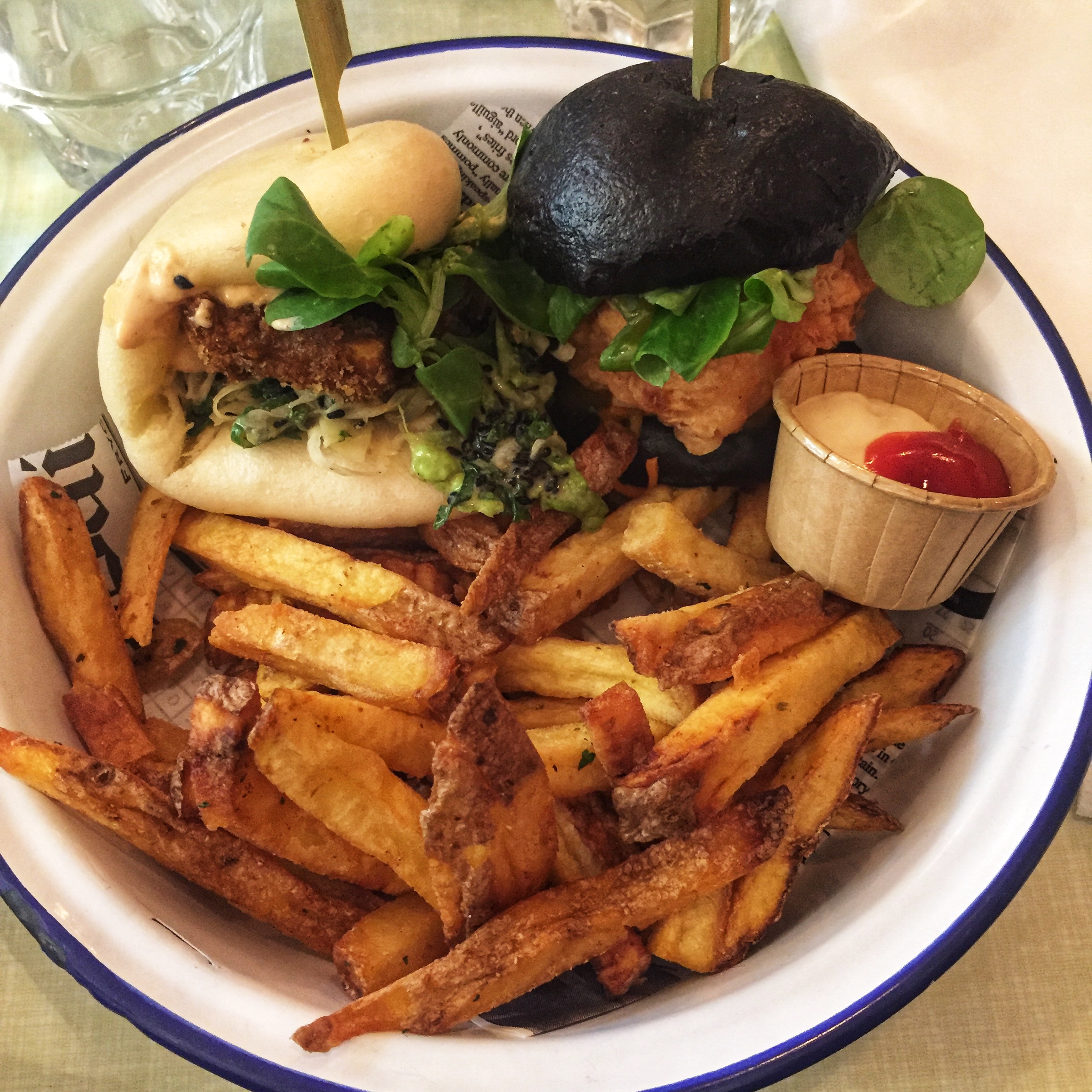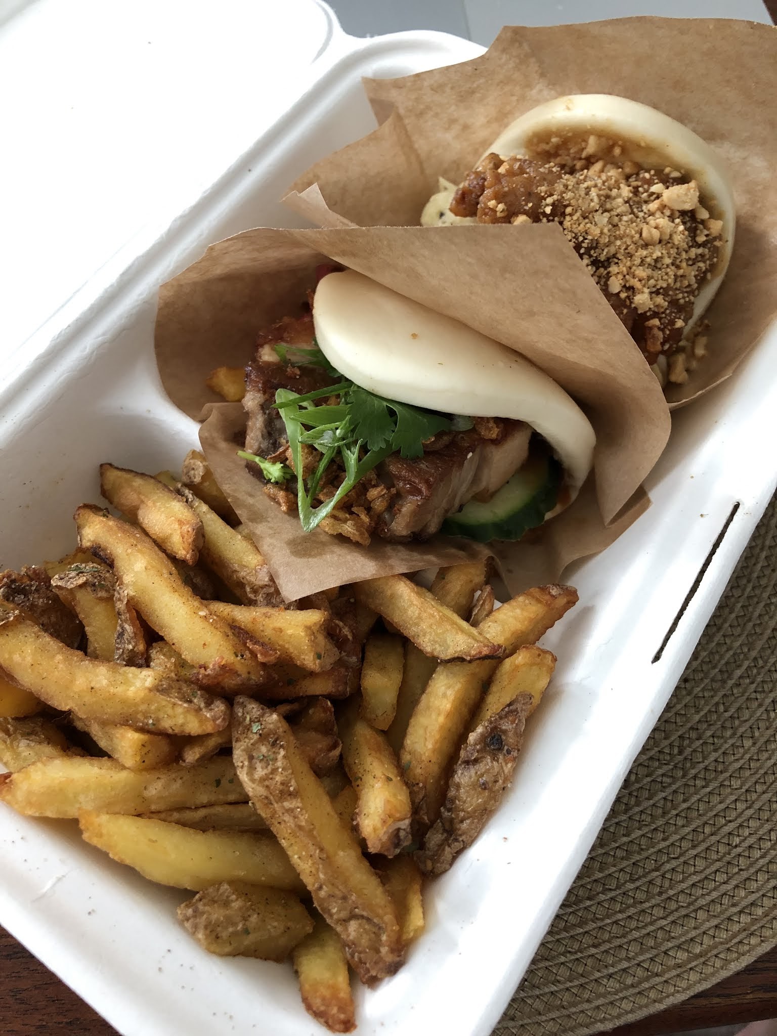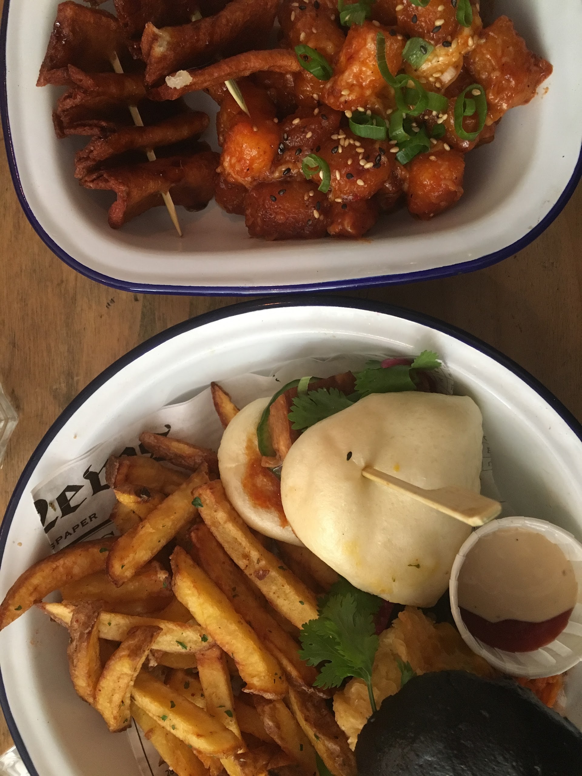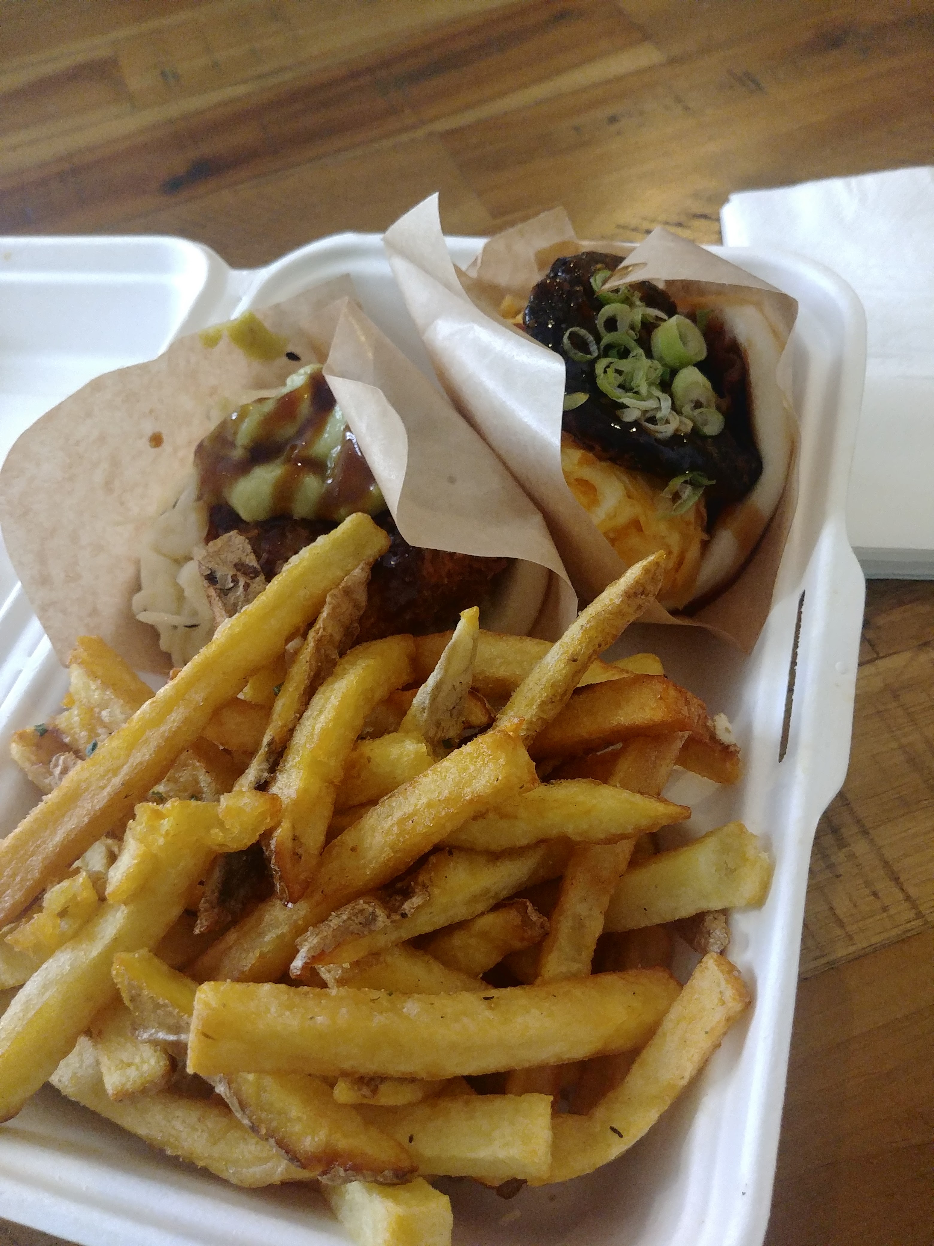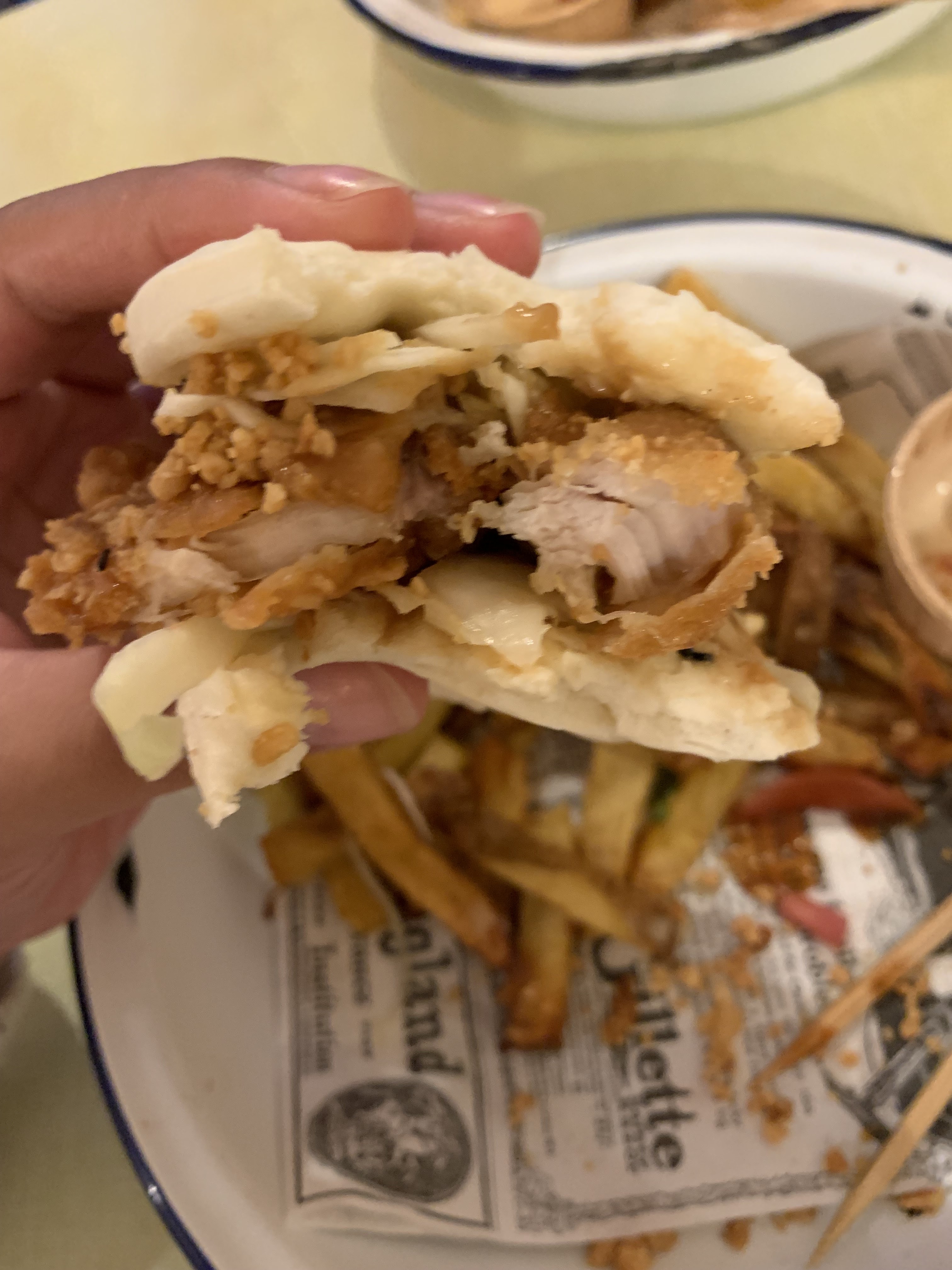 Petit bao, bonnes frites.. les side (aubergine et l'autre sur la photo) pas terrible..