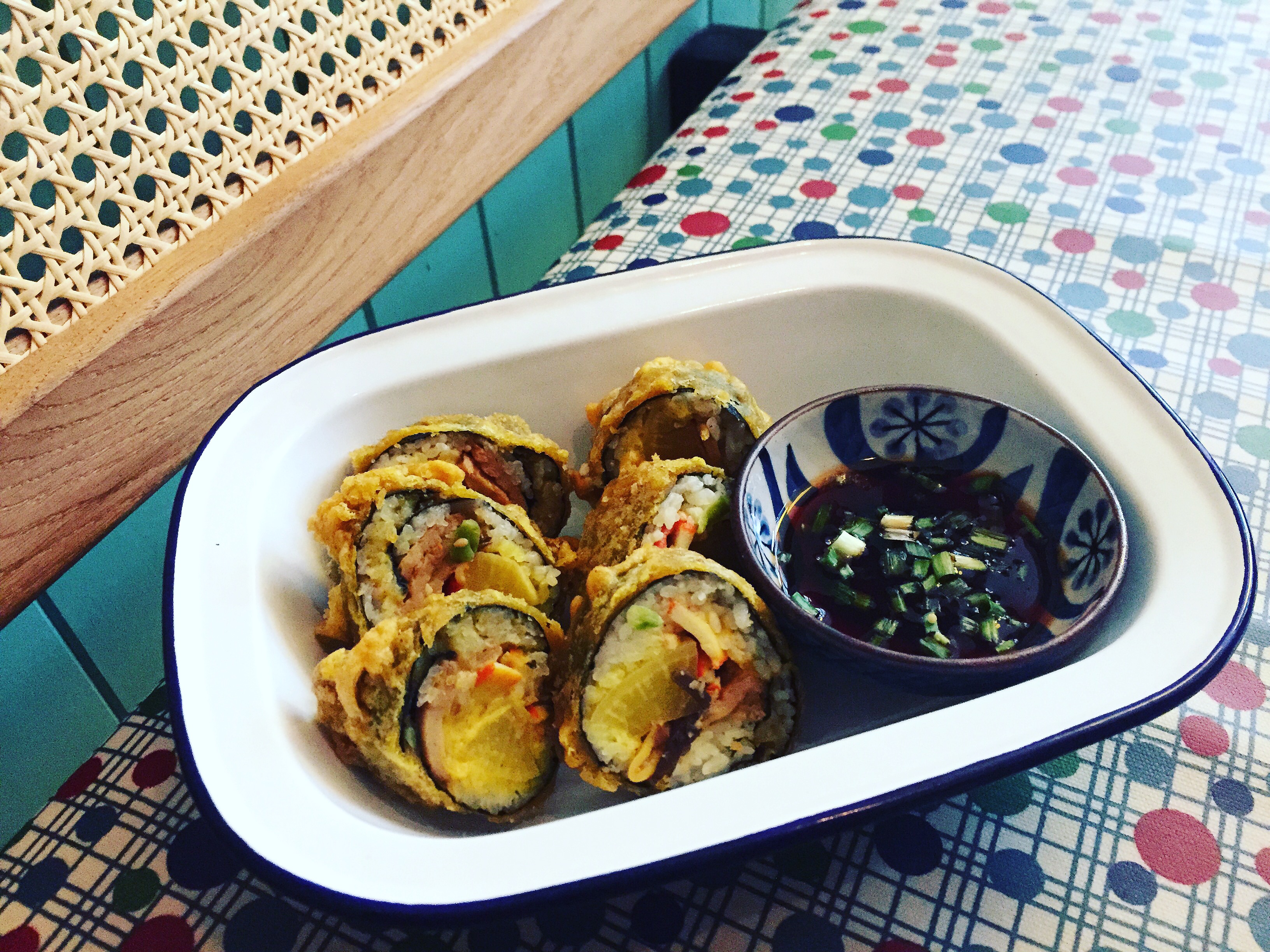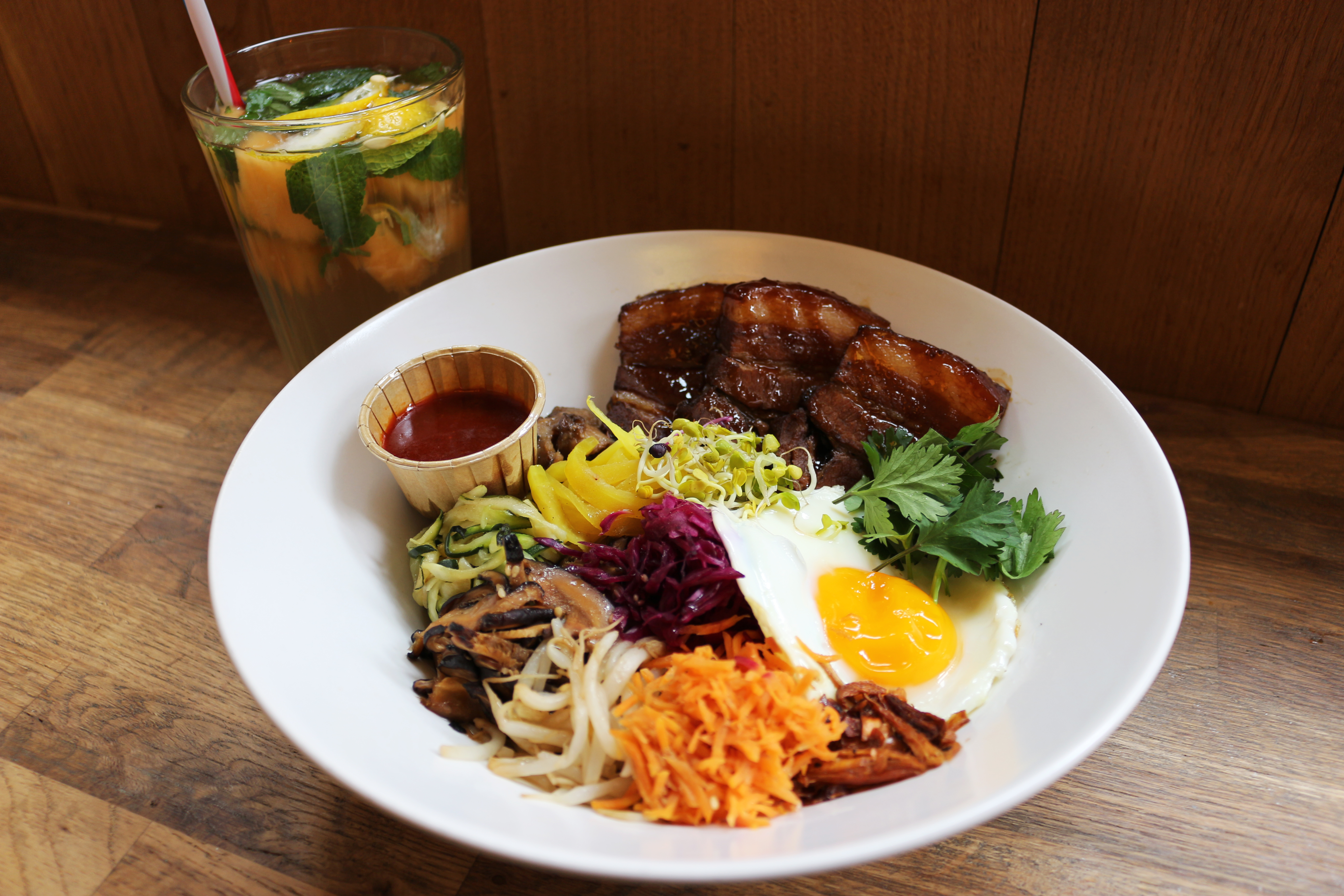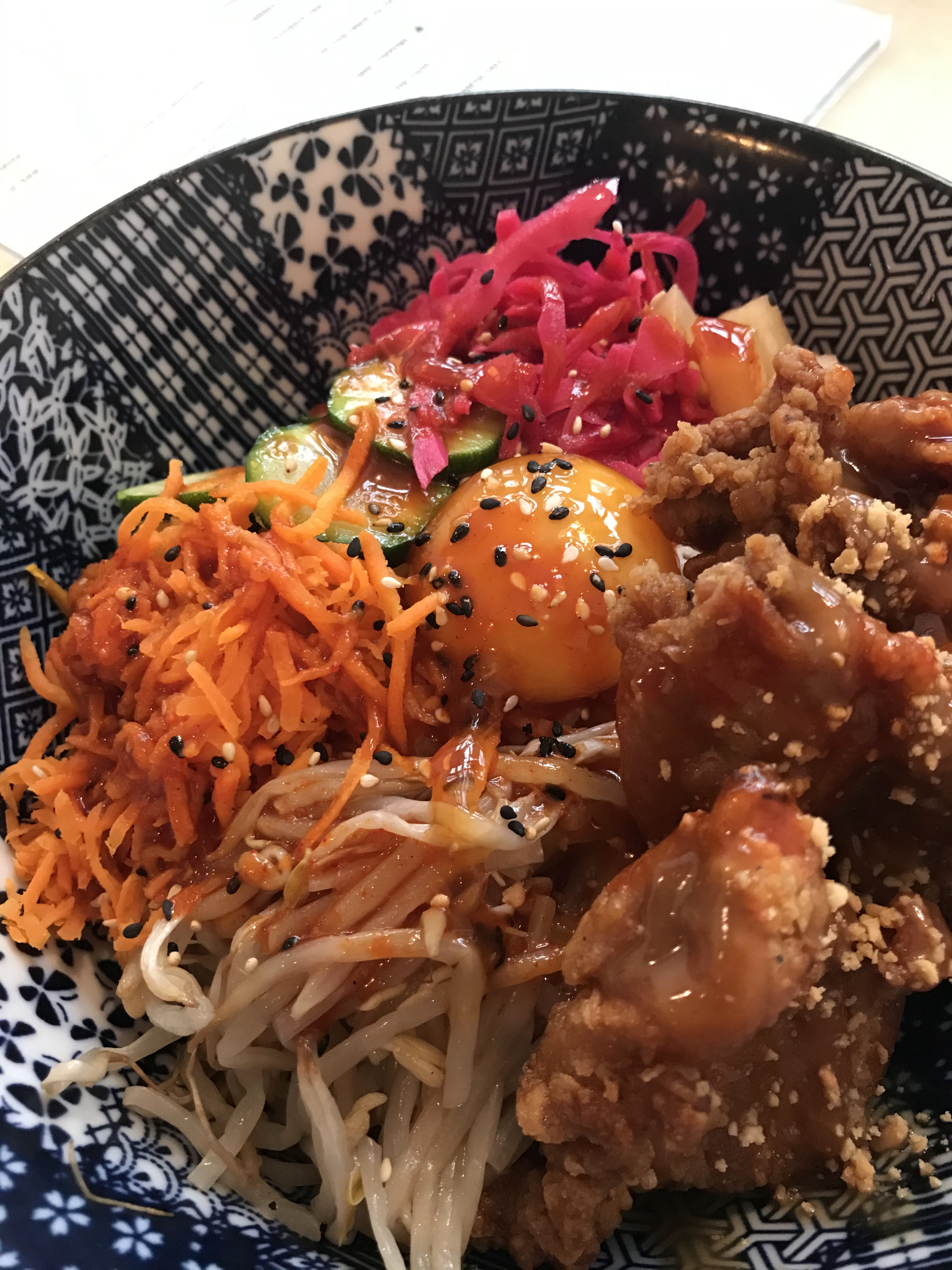 J’ai adoré ! Vraiment très bon et cadre très agréable. J’ai commandé un Dupbap. C’est un plat bol composé de riz et de légumes sautés avec au choix : tofu grillé (mon choix), fried chicken, porc ou bœuf. Le tout accompagné d’une sauce. C’était délicieux, plein de saveurs et visuellement très agréable avec toutes ces couleurs. Comptez 14€ en journée et 16€ le soir.