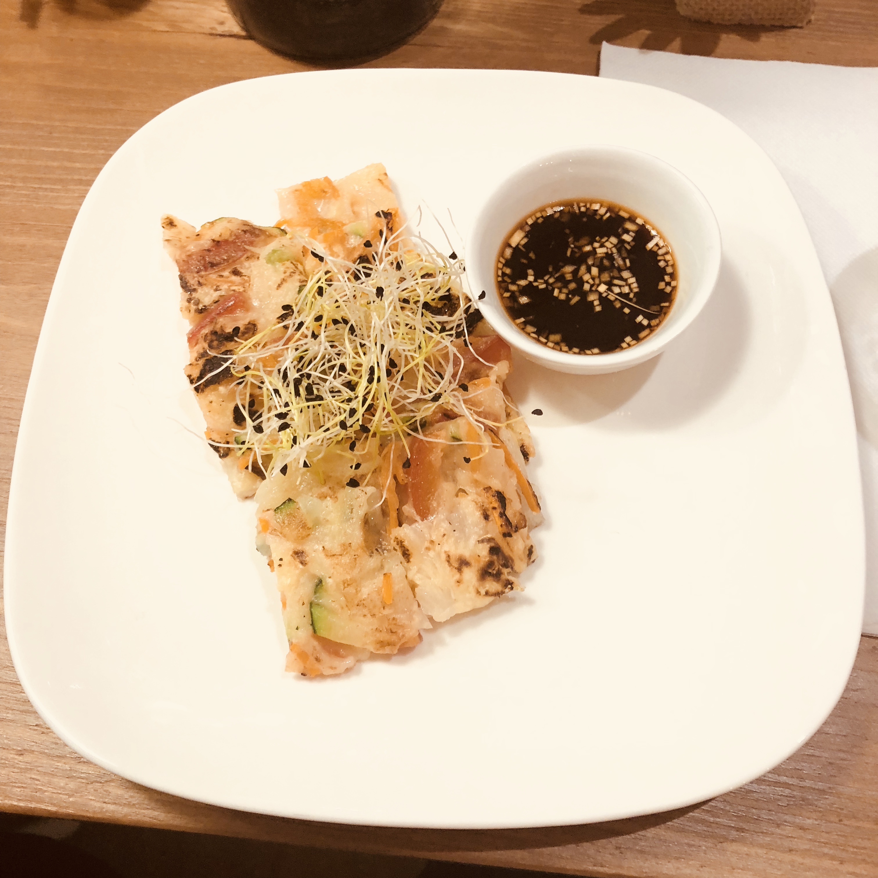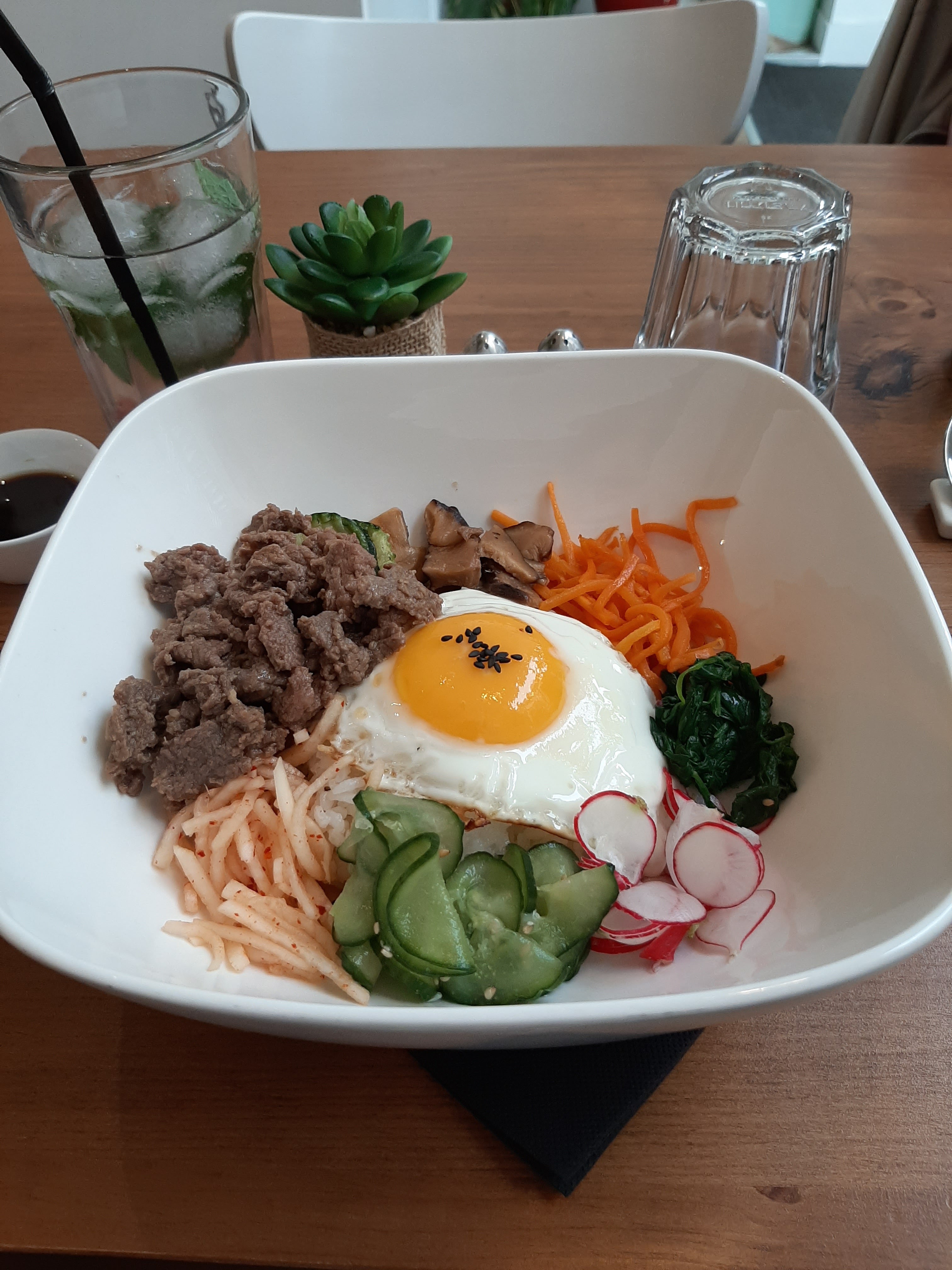 Super dîner avec une amie, les plats sont incroyablement bons petite préférence pour le Sotteok Sotteok et le Bibimbap Lieux minimaliste et calme, salle de restaurant assez petite Plats avec option végétarienne, niveau de piment indiqué et plats de la semaine proposé