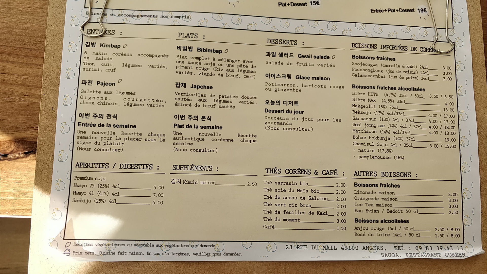 Testé ce jour, le restaurant est très petit comparé a d'autres compères Angevins (10 place dans 30m²), une déco sobre et intimiste. Une bande son douce et enivrante qui vous plongera dzns une bulle d'évasion coréenne vous voici donc a Sagoa. Après concernant le restaurant ne soyez pas forcement pressé, le service est assez long entre les plats. MAIS les plats sont bons, copieux, correctement epicés mais ils ne sont pas inoubliable. Ils feront a coup sur voyager les novices de cuisine coréenne. Je recommande l'adresse a tous les amateurs angevins de passage dans le quartier