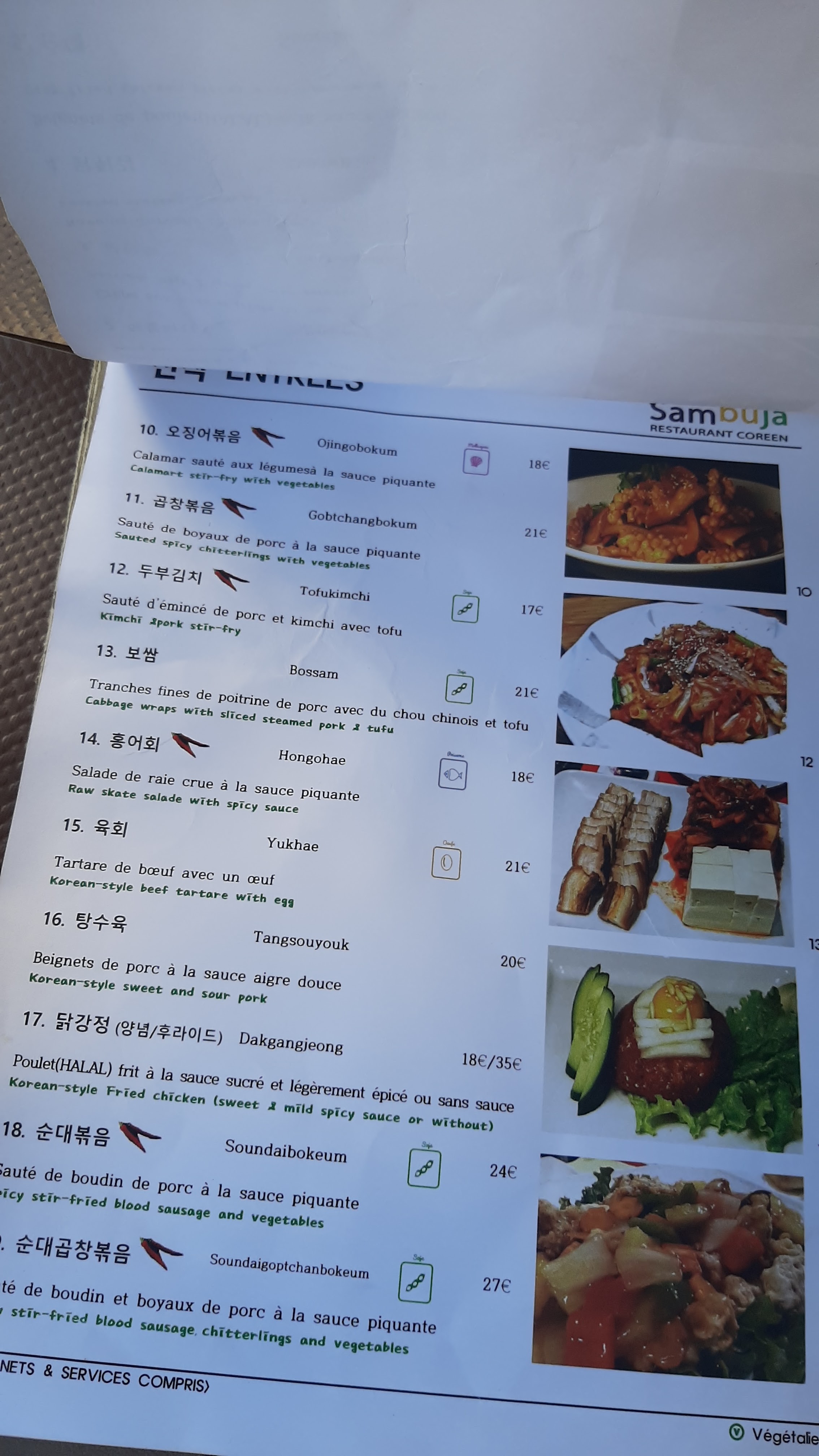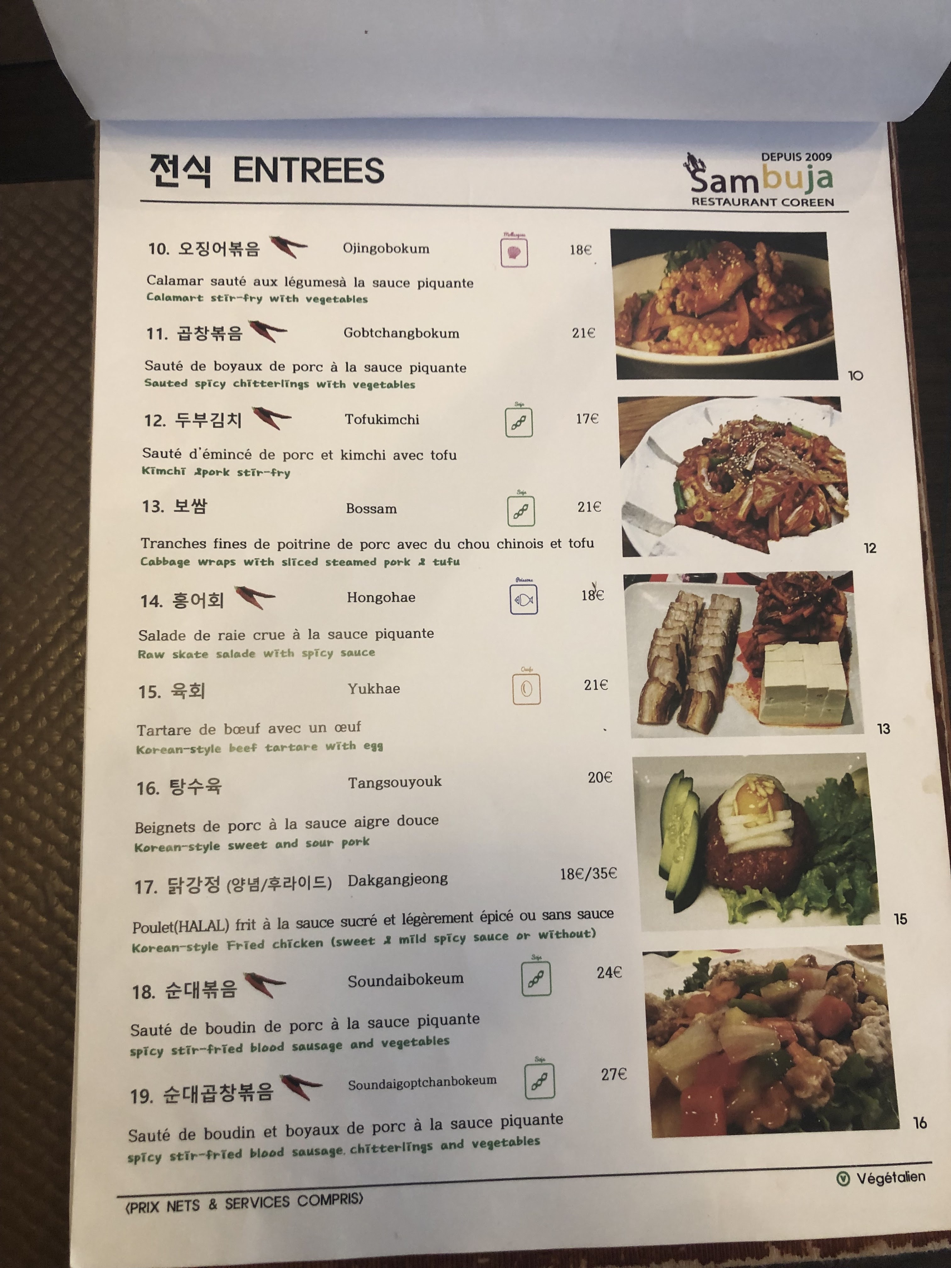 Deux mois que je suis rentrée de Corée et avec les chaleurs je rêvais de 비빔냉면 (je me suis régalée!) mais la plupart des restaurants n'en proposent pas. Quel plaisir quand j'ai découvert Sambuja ! La carte propose des plats que l'on peut retrouver dans les restaurants en Corée et pas seulement les traditionnels que nous pouvons être habitués à manger. Mon conjoint a pris le 순대국 qu'il a adoré ! Les quantités sont très généreuses (j'ai toujours du mal à finir) et les 반찬 très bons également. Nous avons été très bien accueilli, le personnel est très gentil et n'hésite pas à conseiller. Nous avons déjà hâte de revenir