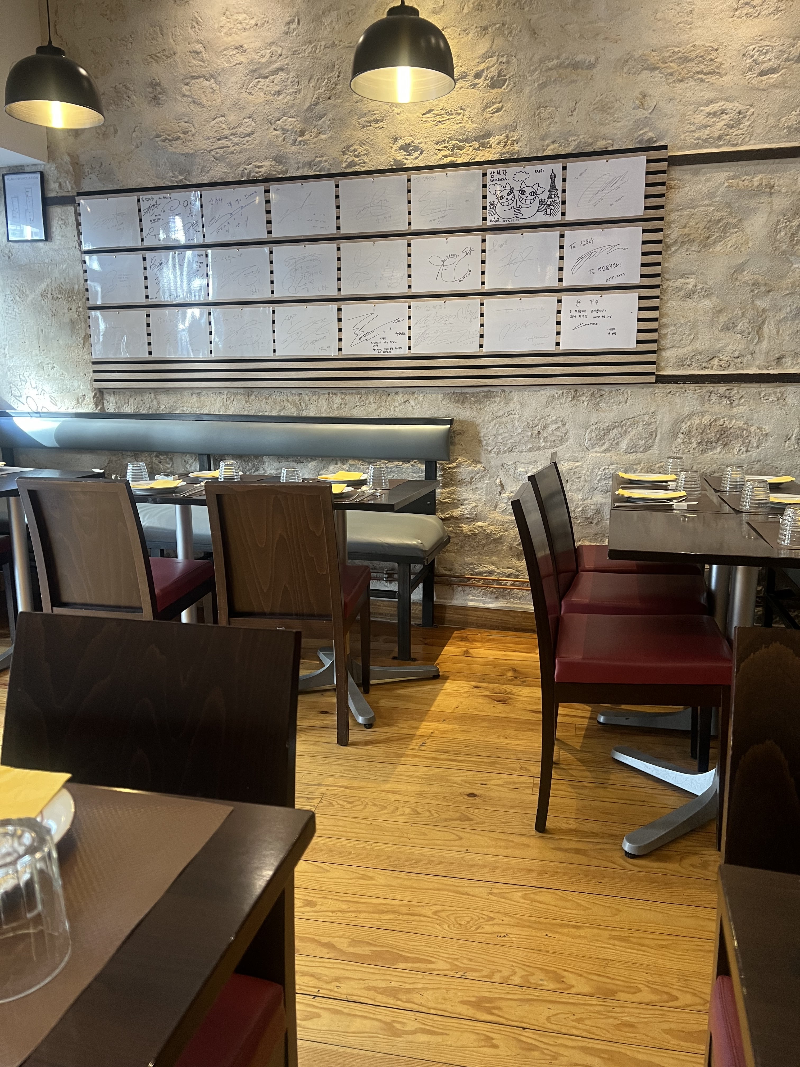 Restaurant succulent, bonne ambiance Le serveur à lunettes souriant s'améliore en français la serveuse est très gentille et agréable, tout ca pour un prix correct et un ventre plein :)