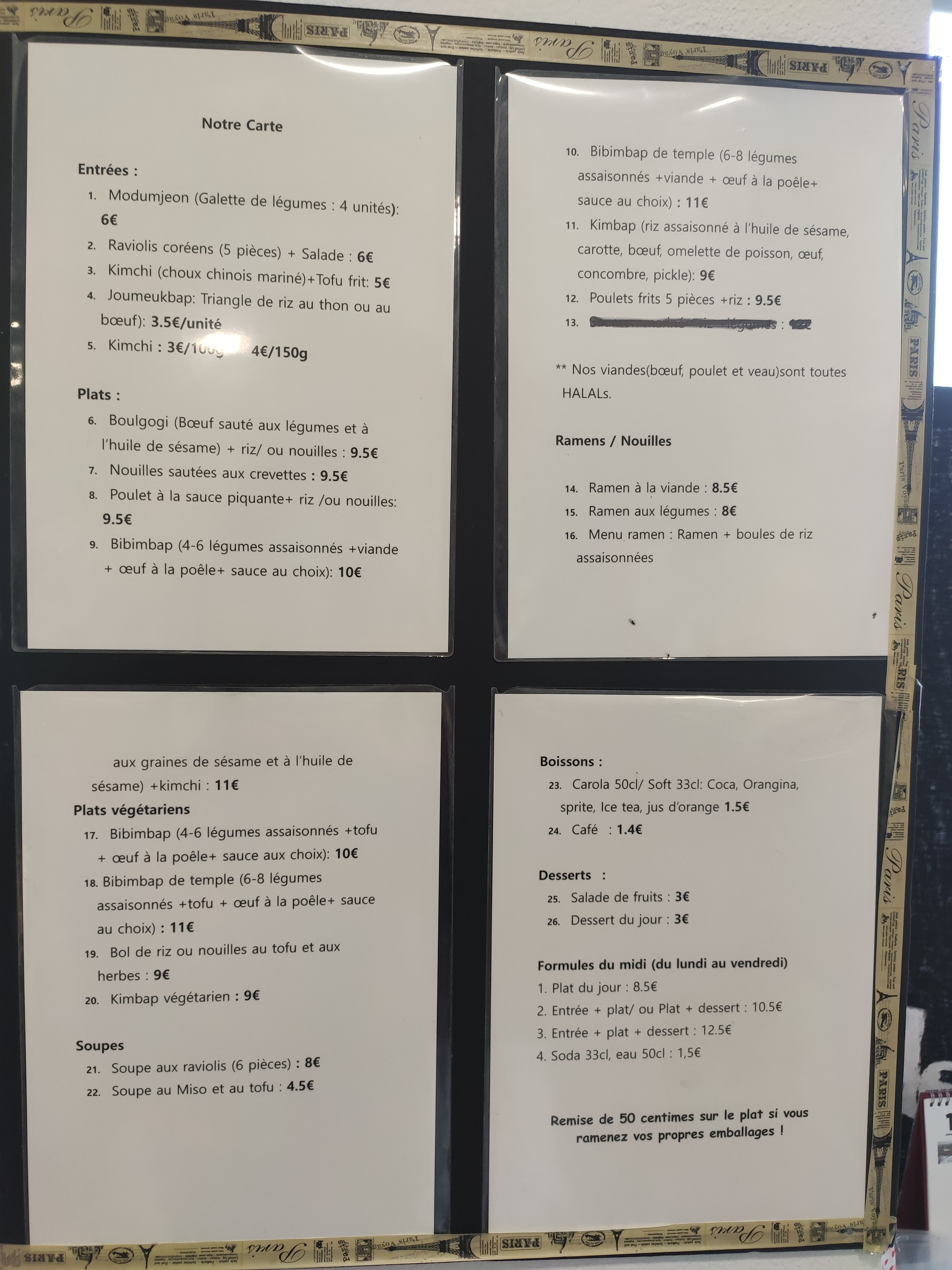 Chaque fois je commande à emporter tous les repas sont toujours bons et savoureux! La gérante qui est coréenne est super gentille. Un vrai repas coréen au coin à découvrir, je vous le recommande avec les yeux fermés 😉