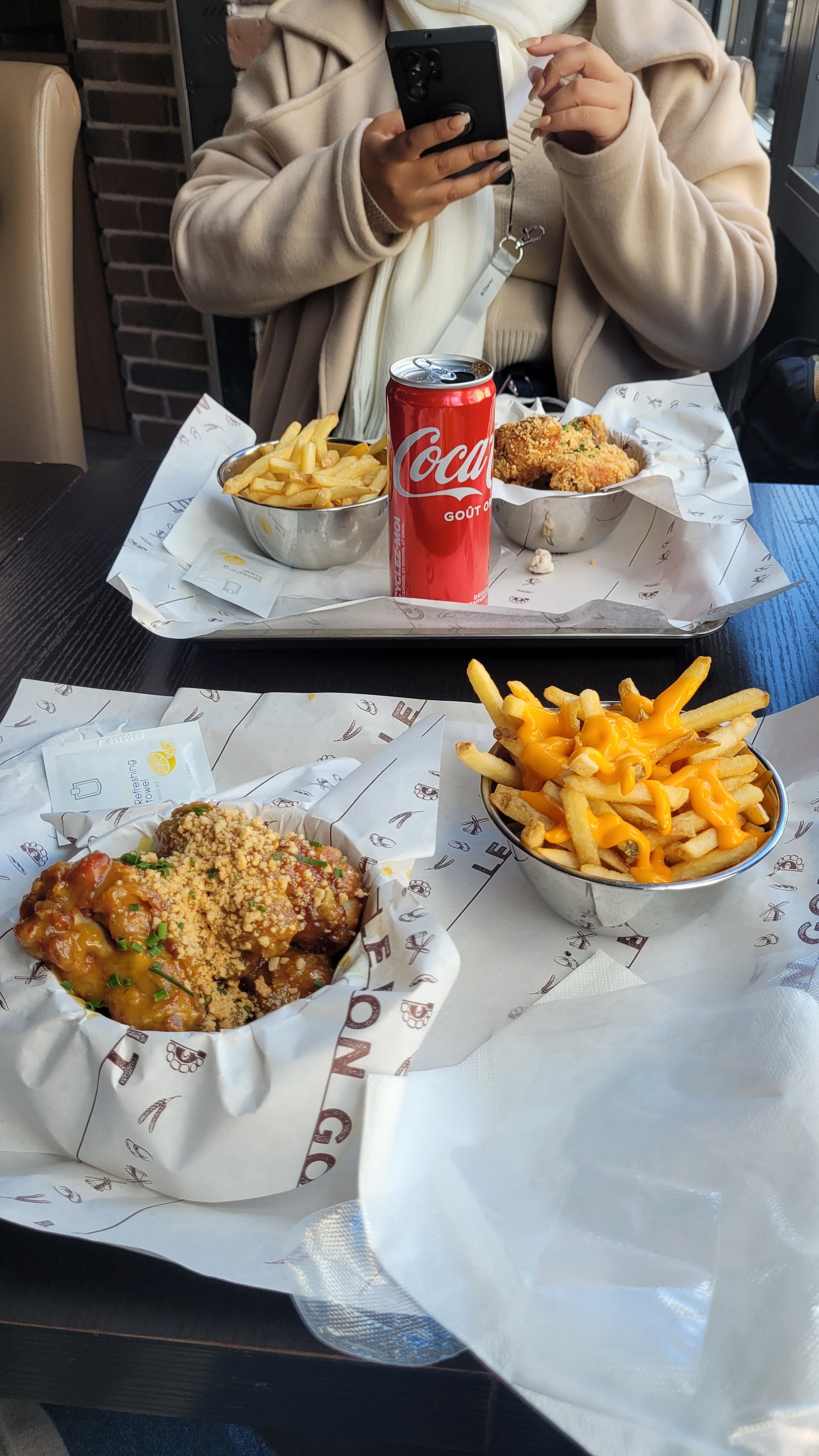 Vraiment SUPER bon! Les corn dogs sont excellent et bien cheesy, le poulet frits est succulent surtout celui à l'ail, les mandus sont très bons. Les frites en revanche sont très sèches (clairement pas bonnes ducoup) et le poulet frit curry parmesan est bon mais le fait que ce soit juste de la poudre comme ça par dessus rend ça pas forcément agréable en bouche. Sinon la salle est très jolie, t'as l'impression de te balader dans les rues de Seoul et une superbe ambiance KPOP! Au niveau des prix c'est pas excessivement cher. Le resto a ouvert il n'y à pas trop longtemps et fait fort. J'y retournerai c'est sûr !!