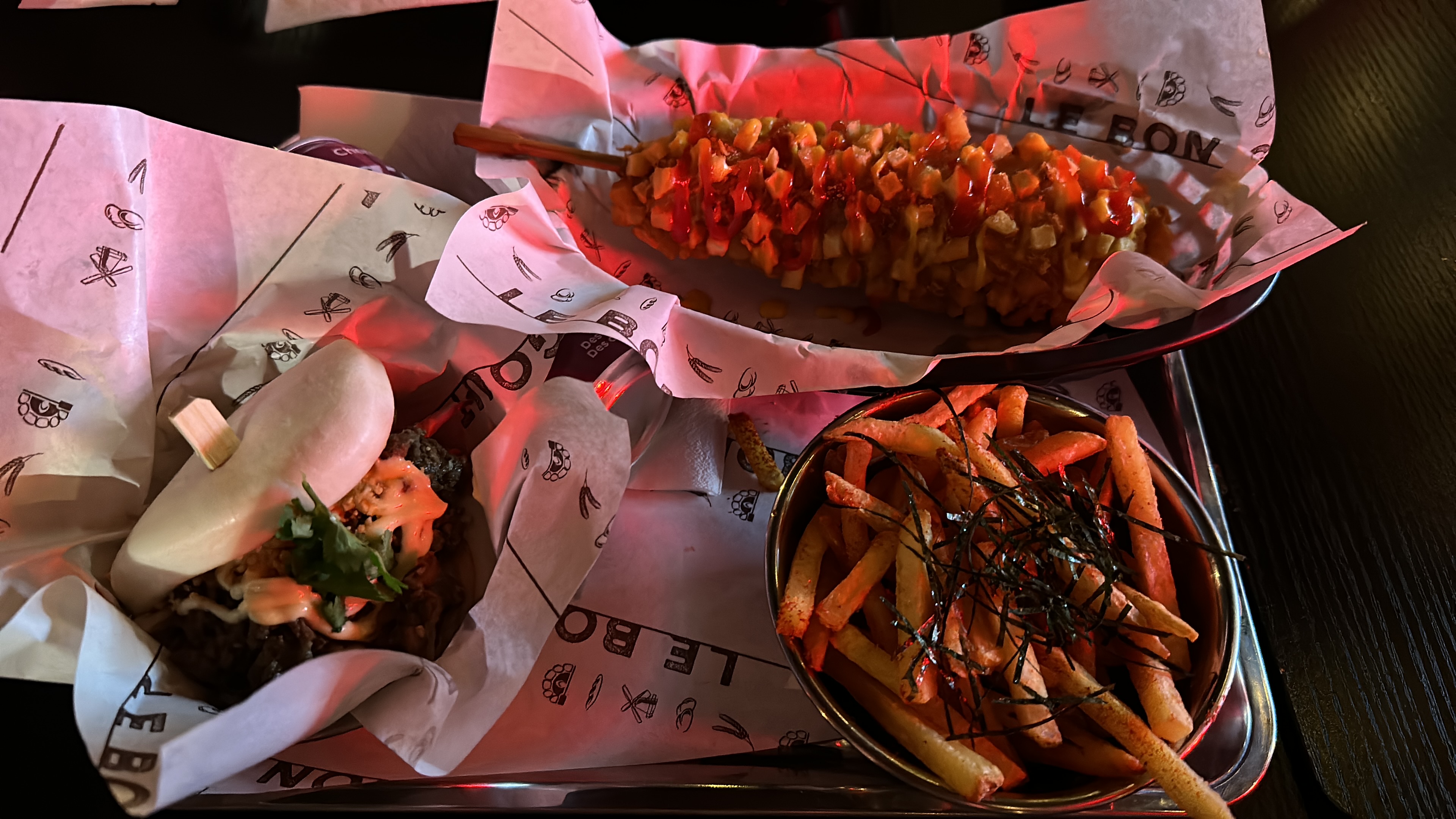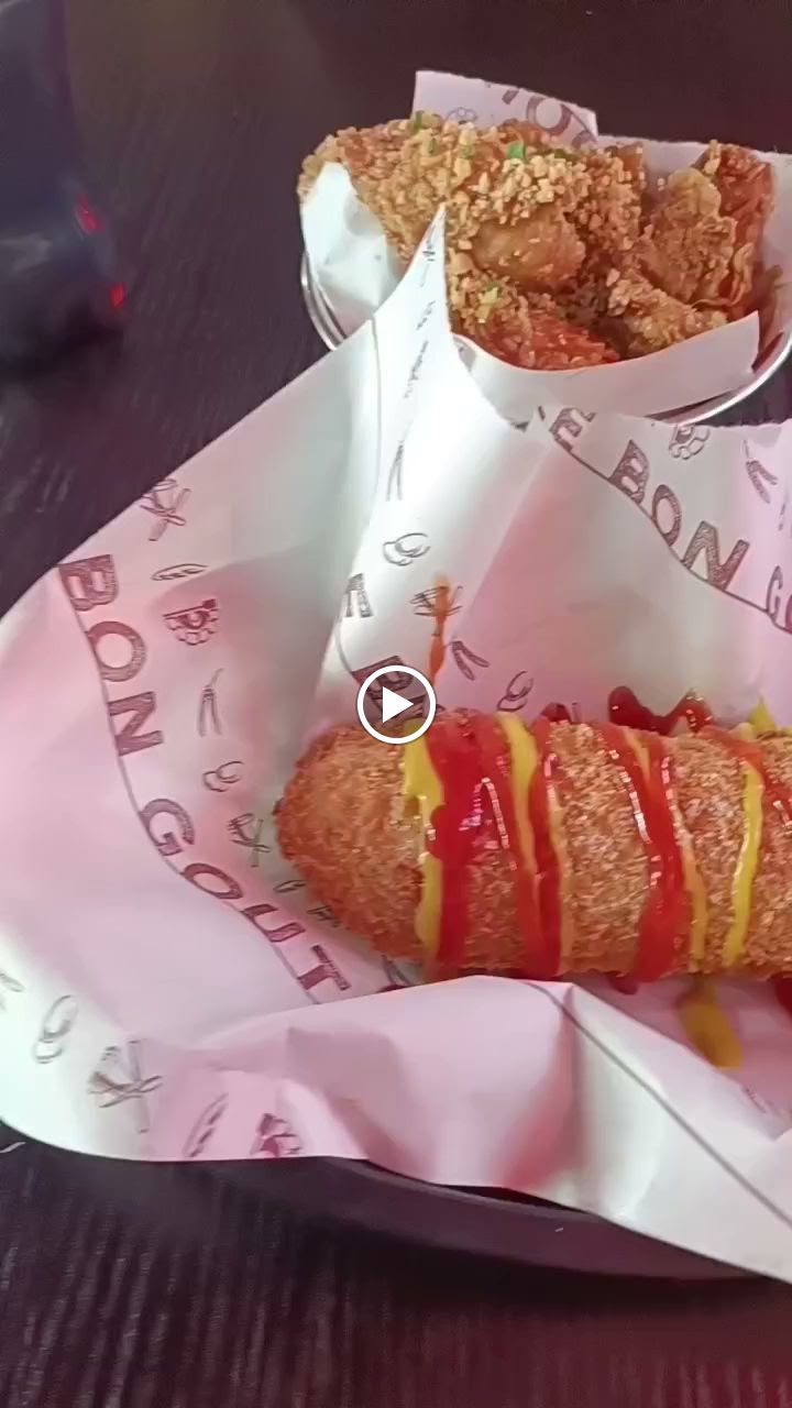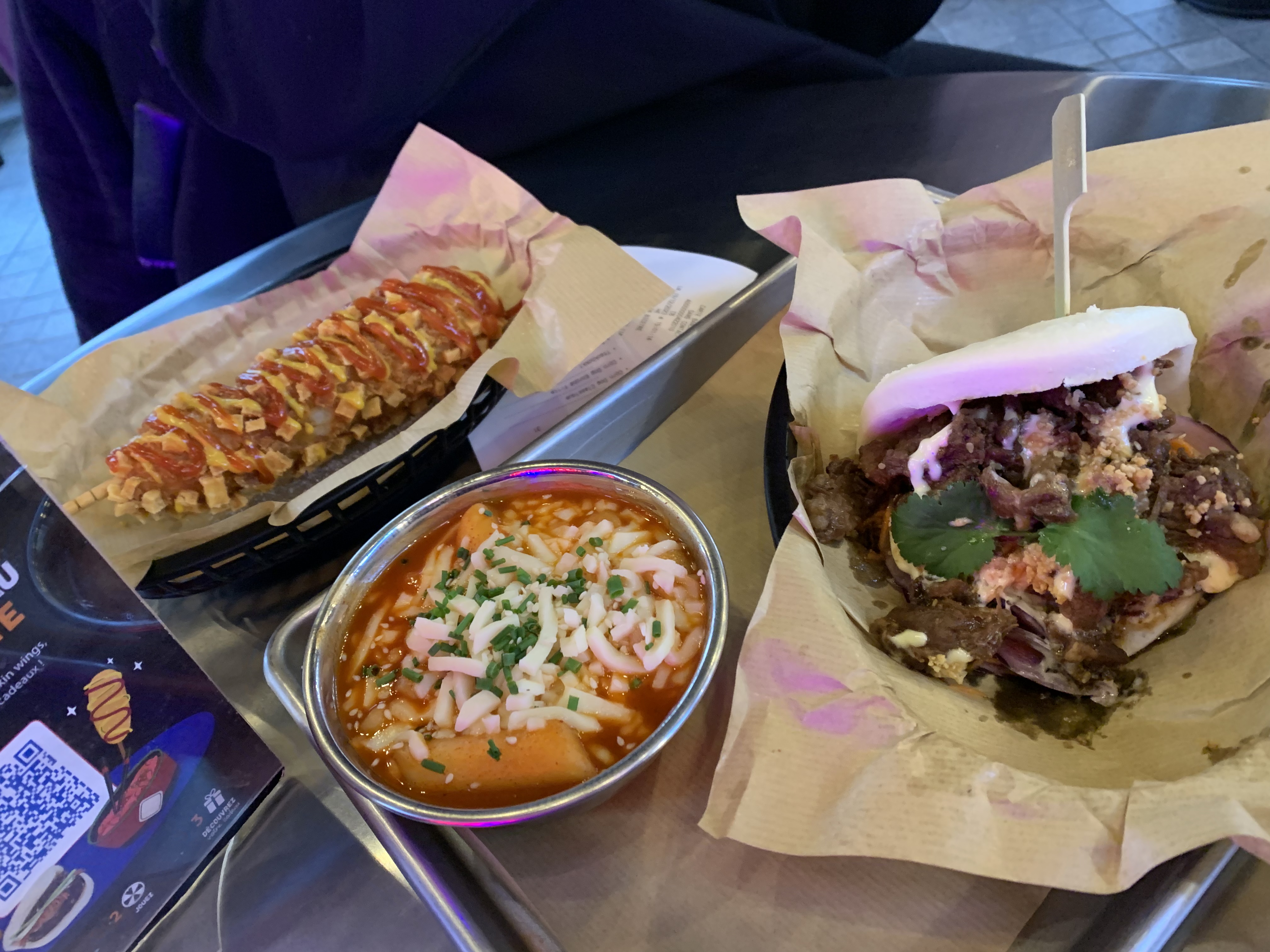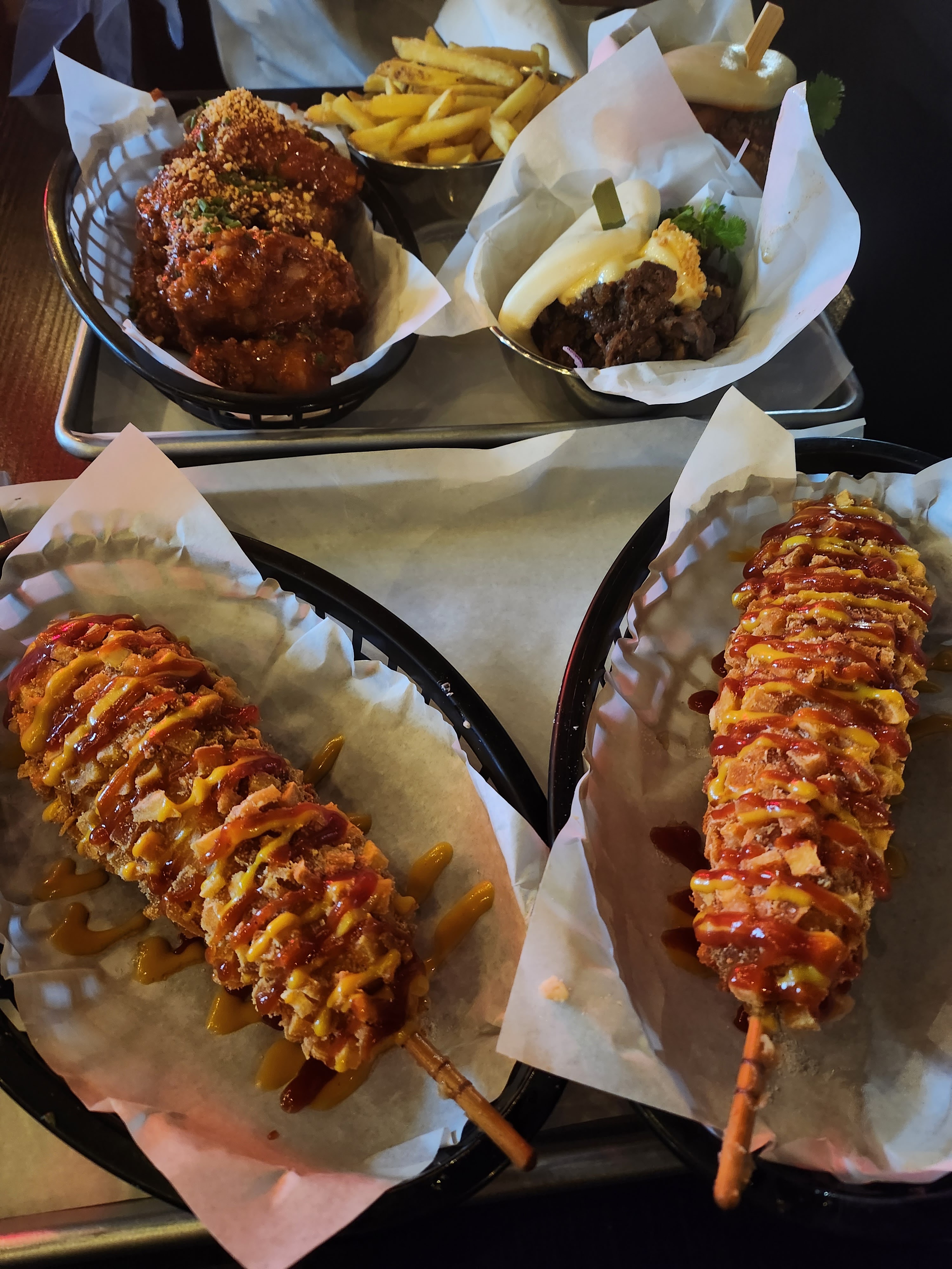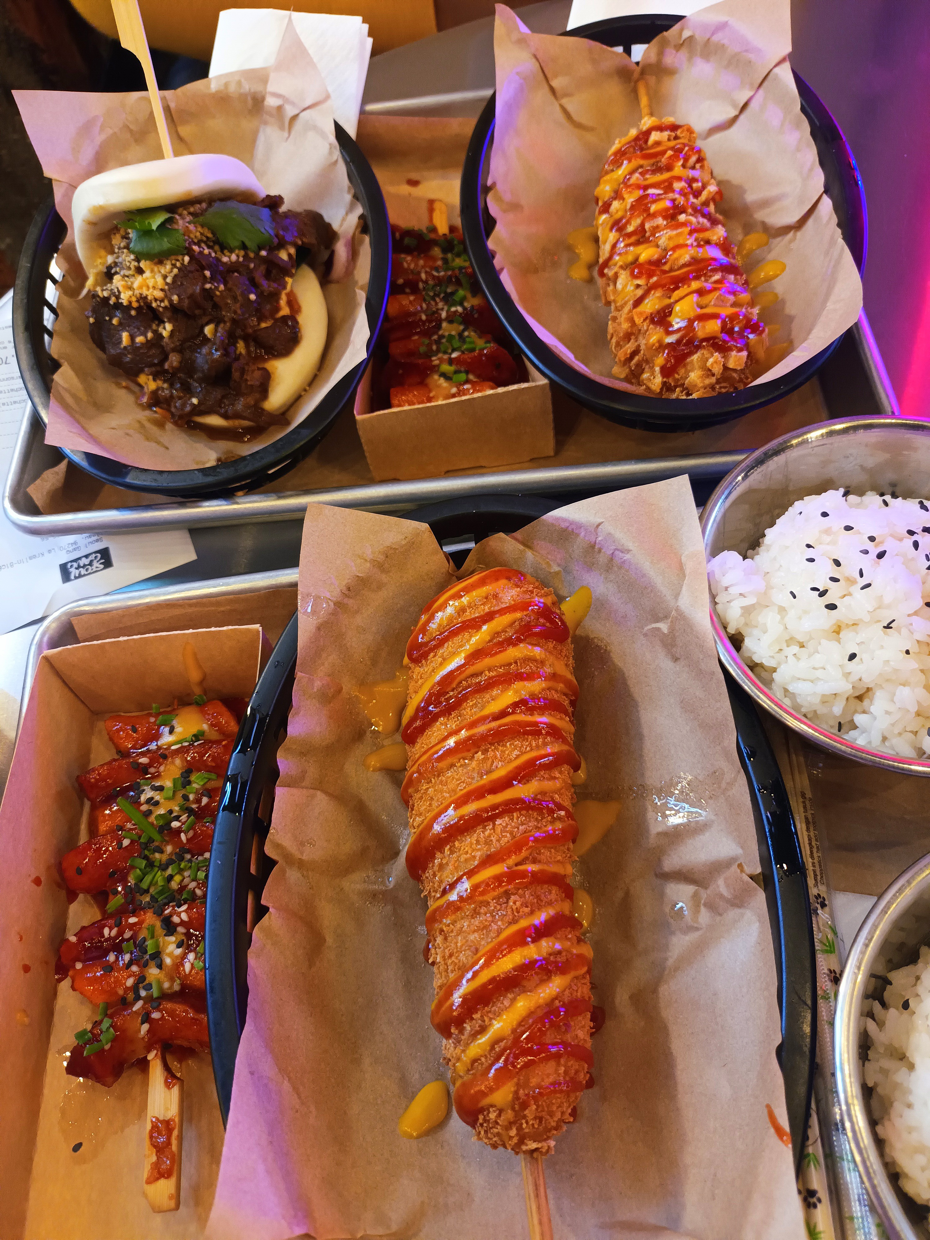 Guabao et Corn dog enrobé de frites incroyables ! De plus, le service est rapide et l’endroit respecte super bien l’ambiance de Séoul ! Il y avait pas bcp de monde, donc on pouvait manger dans le calme avec de la kpop en fond, c’était trop bien ✅