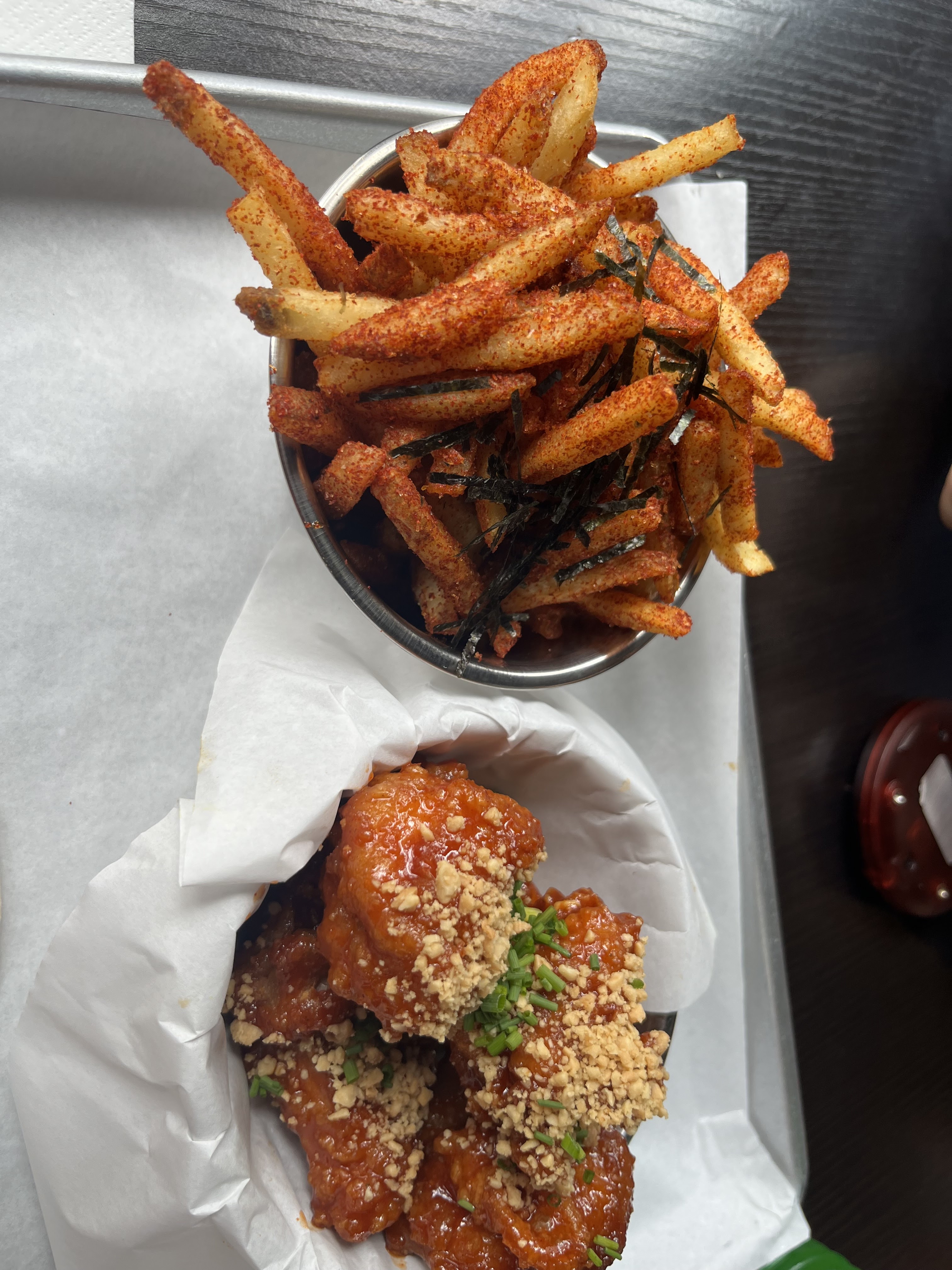 Poulet coréen correct, menu un peu cher 17e La déco à l'intérieur est très jolie et photogénique. Ce que je conseille : - Poulet frit moutarde/miel - Soja ail Ce que je ne conseille pas: - Corn dog - poulet curry/parmesan