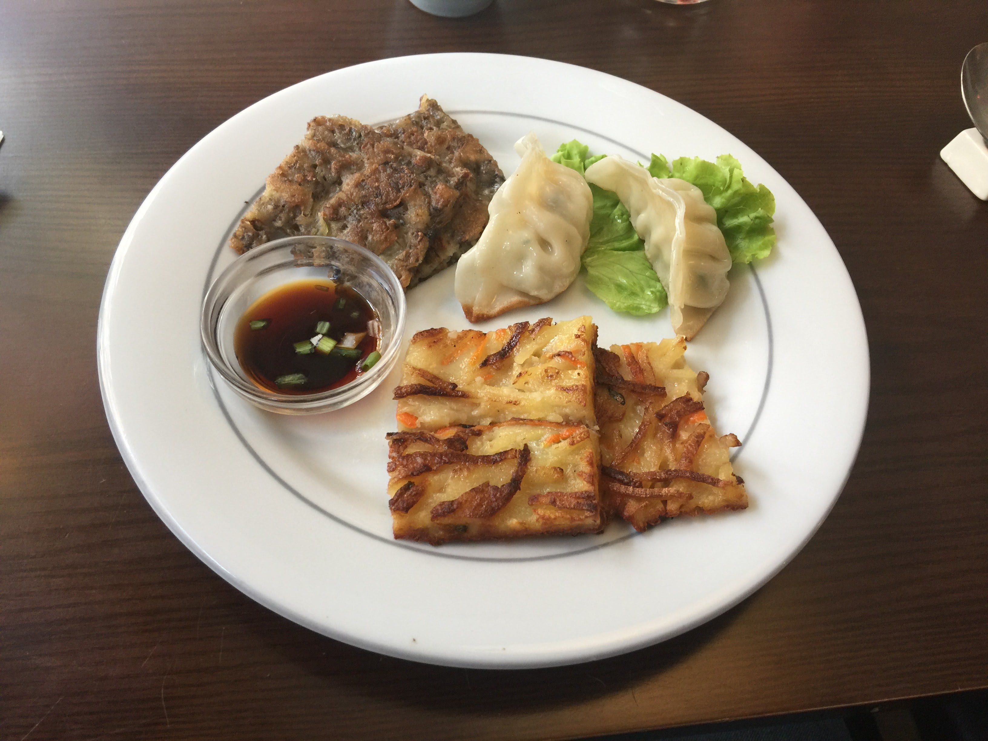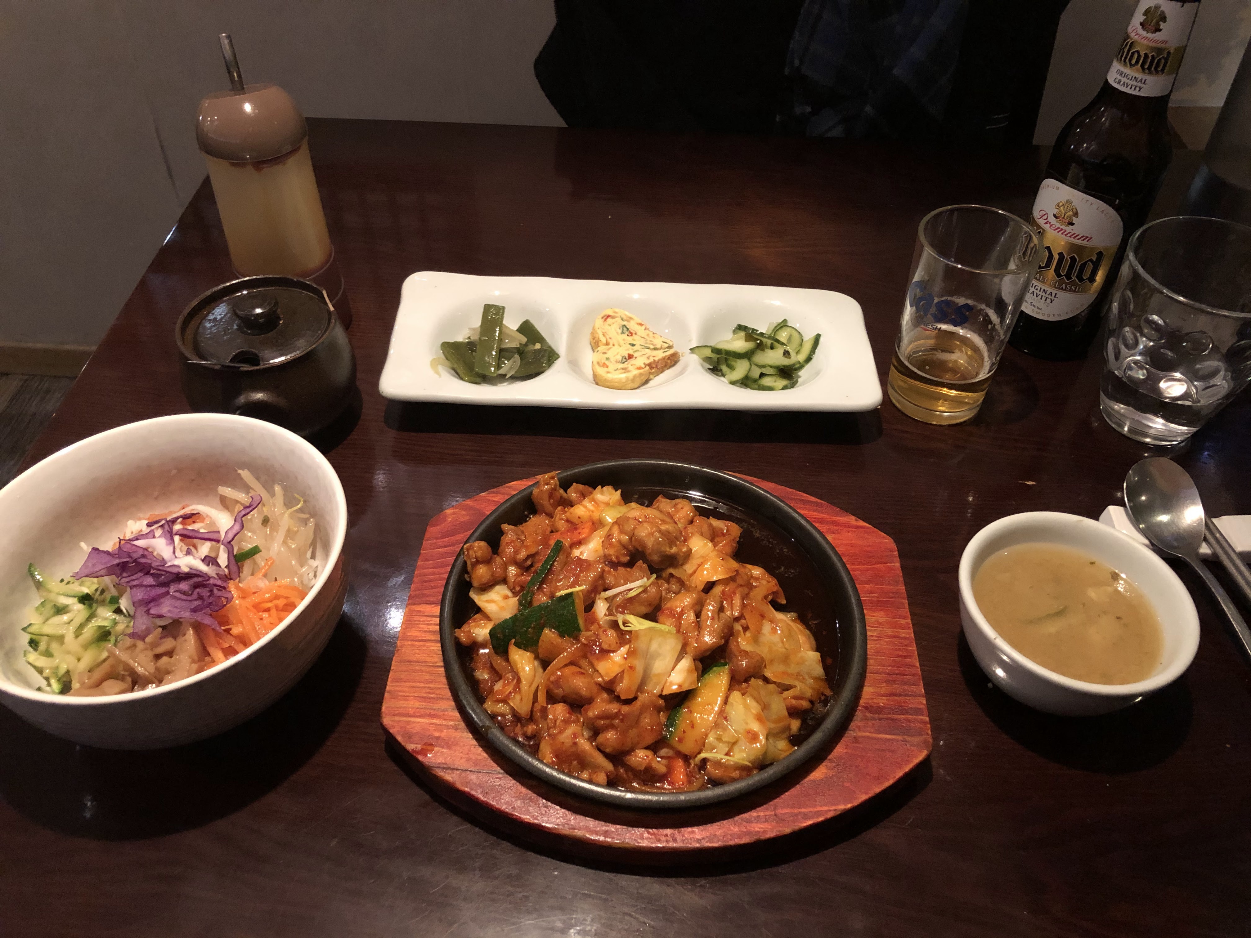 Vrai restaurant coréen, plats classiques et tables pour barbecue. Le goût et qualité est là. Pas déçu, ressemble aux anciens restaurants coréen de rue st Anne , près du Louvre. Les serveurs étaient tous très polis, souriants, un plaisir de manger sur la petite terrasse. Sur la photo, bibimbap au boeuf, entrée et kimchi (en supplément malheureusement), biere japonaise et eau purifiée . Crêpe au thé délicieuse, chaude et crème chantilly a très bon goût