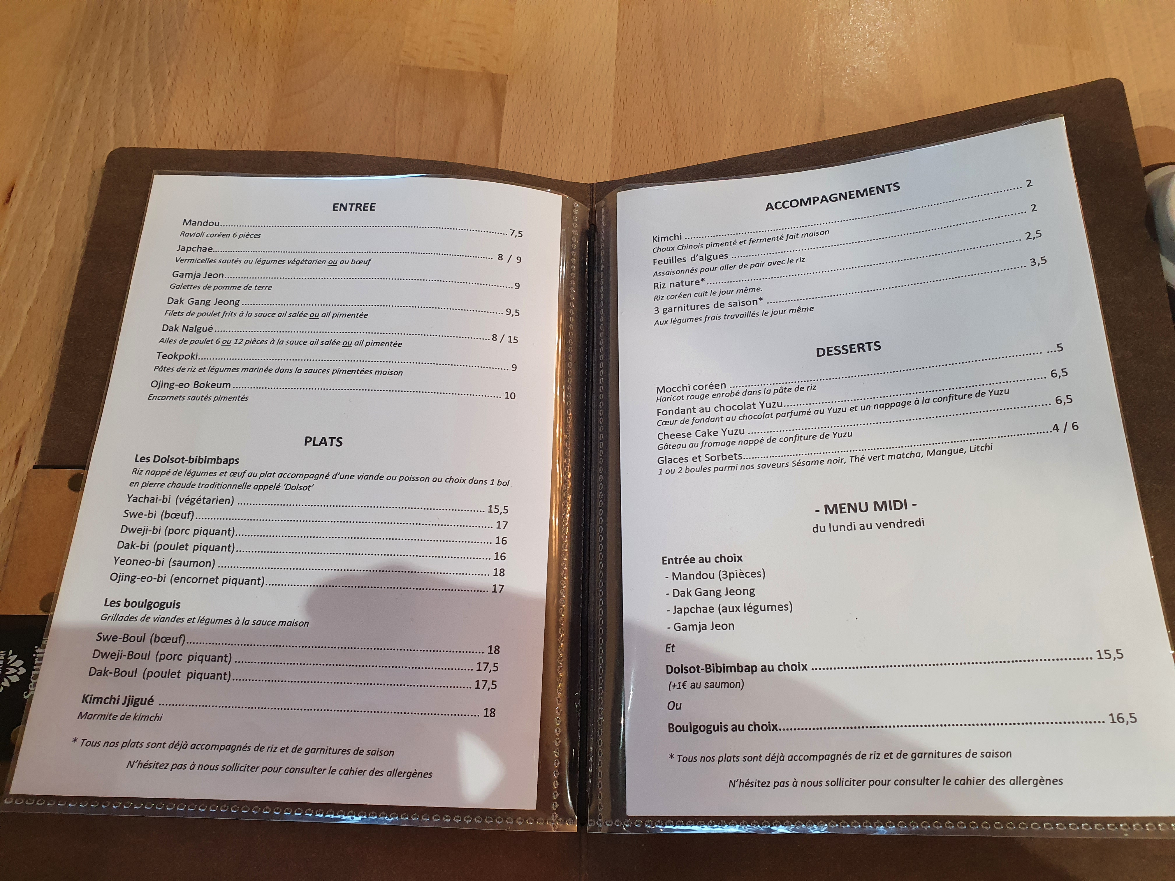Restaurant coréen très sympa. Il existe deux menus pour le midi offrant un excellent rapport qualité prix (14,8€ et 18,80€). Le premier propose une entrée et un plat, le deuxième rajoute le dessert.