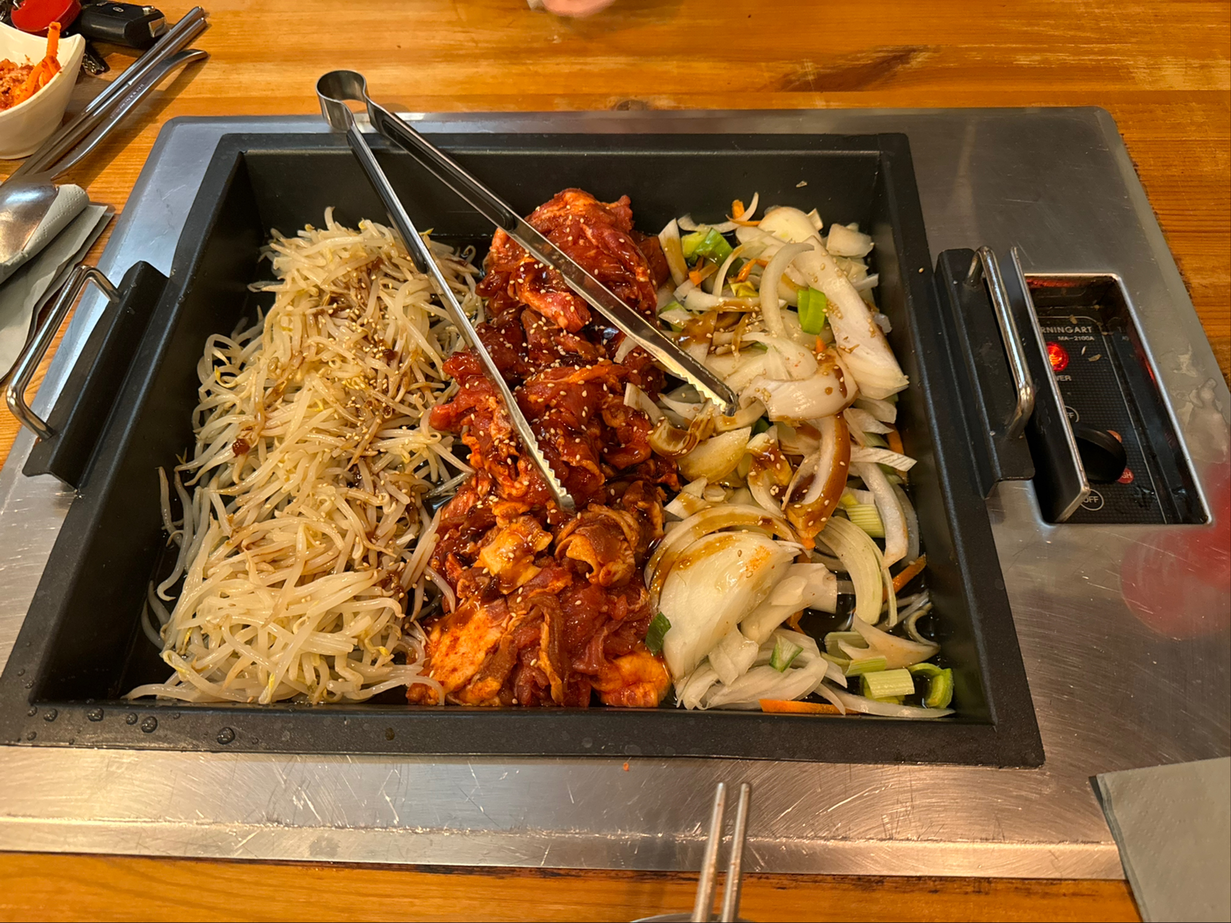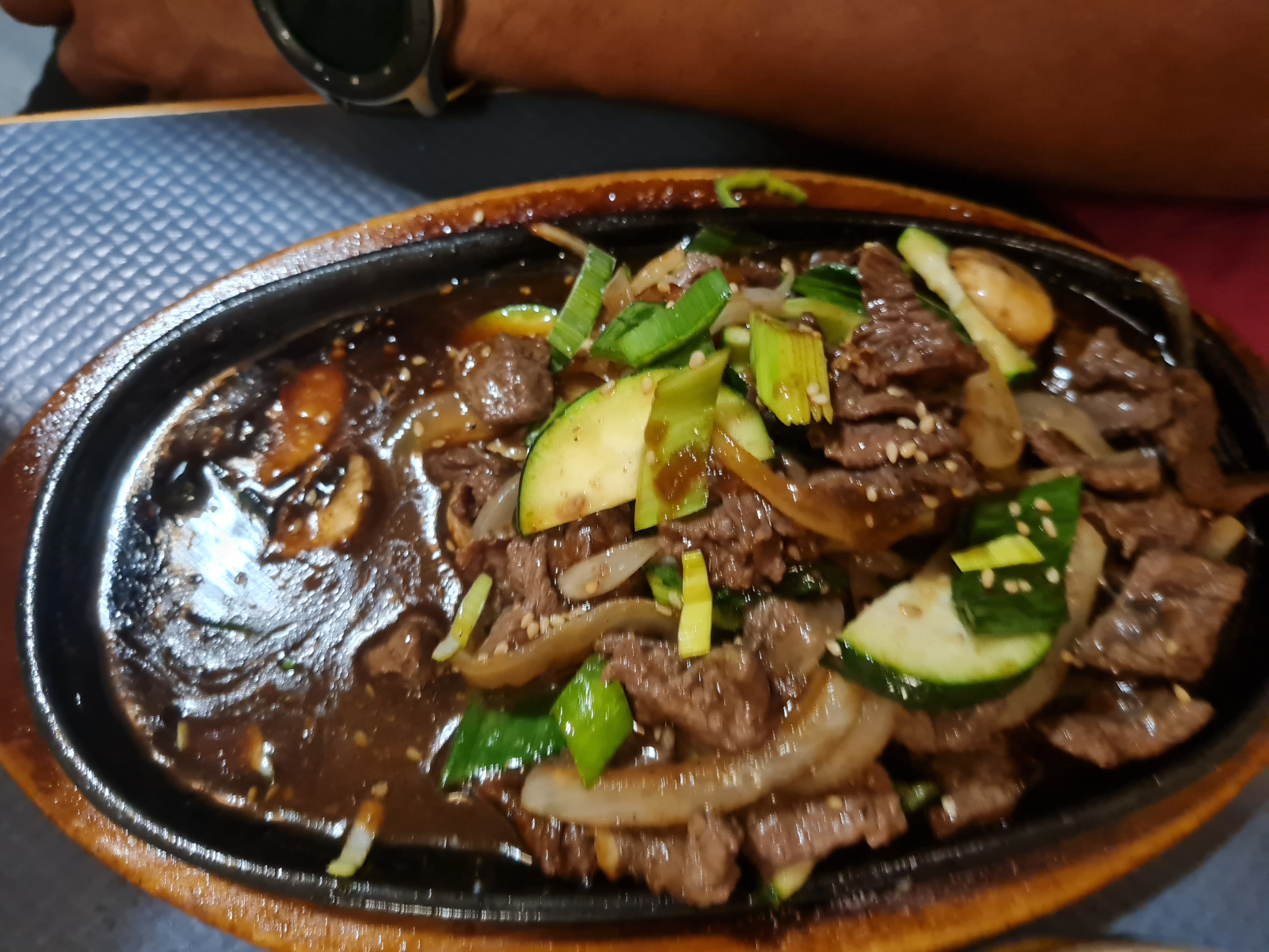 Un accueil fortement appréciable. Un choix limité mais suffisant à mon goût puisqu'il est proposé des plats, tant pour les amateurs de viandes que pour les végétariens. Il vous sera d'abord servi des amuses bouches de 3 sortes, assaisonnés avec goût. Pas d'entrées puisque nous avons choisi un barbecue, précisé pour 2 personnes minimum, mais 4 feront l'affaire au vu de la grande quantité (bon point, vous pouvez demander des doggy-bag) Nous avons pris le menu à 56€ avec un bulgogi-jeongol. La viande (bœuf) est tendre et très fondante en bouche, c'est un régal. La sauce qui assaisonne le tout apporte une touche sucrée qui vient lier parfaitement les nouilles avec les légumes et la protéine. Cet endroit vous plongera dans la culture coréenne au vu de sa cuisine traditionnelle bien amenée. Points positifs: -Accueil souriant -Bonne nourriture -Ambiance chaleureuse -Décoration appréciable -Service rapide et peu d'attente Points négatifs: -La carte des desserts est très petite -Ne prennent pas la carte tickets restaurant -Un manque de clarté au niveau de la carte sur les explications de la composition des plats (mais vous pouvez demander et le personnel vous répondra volontiers)