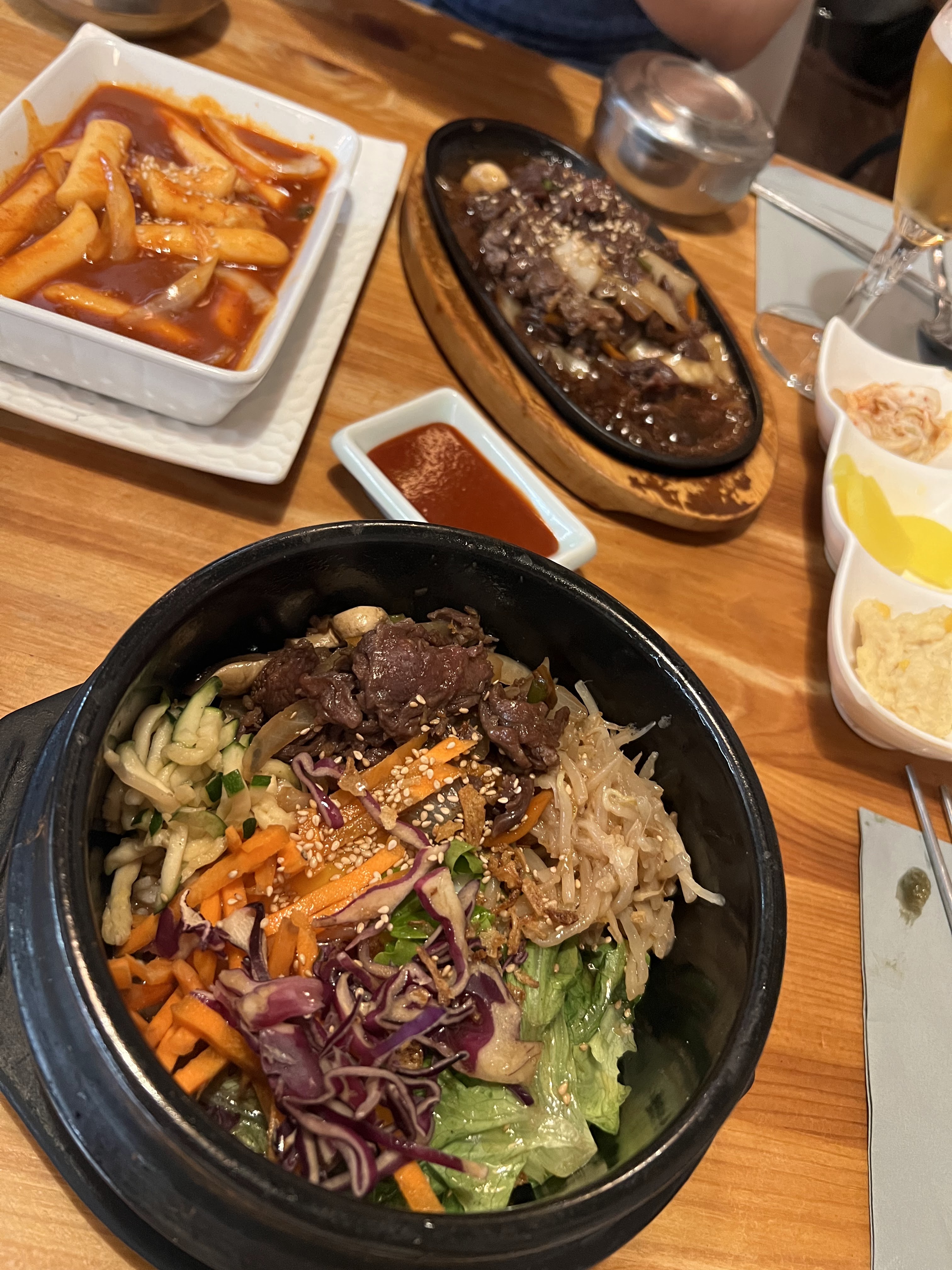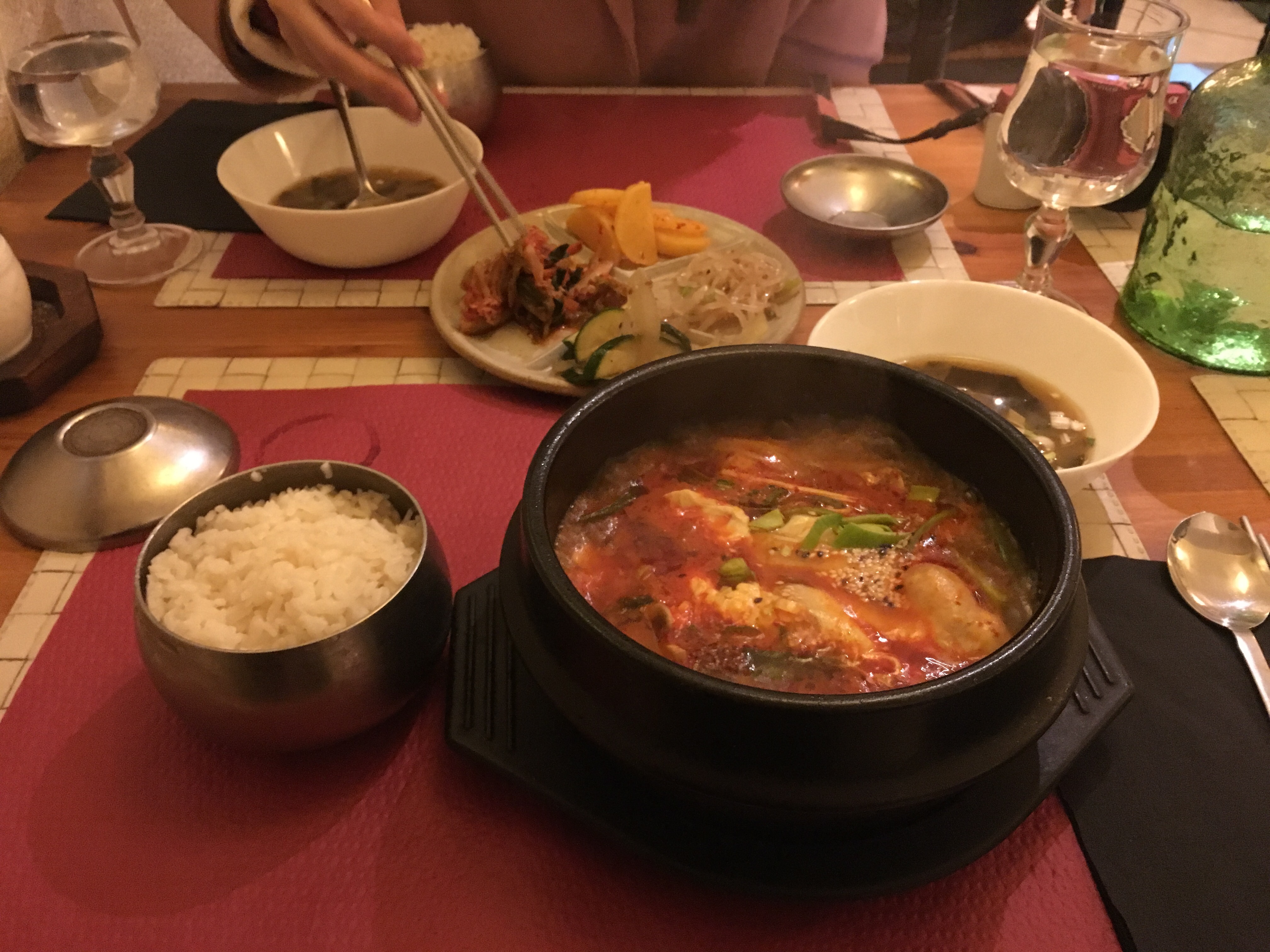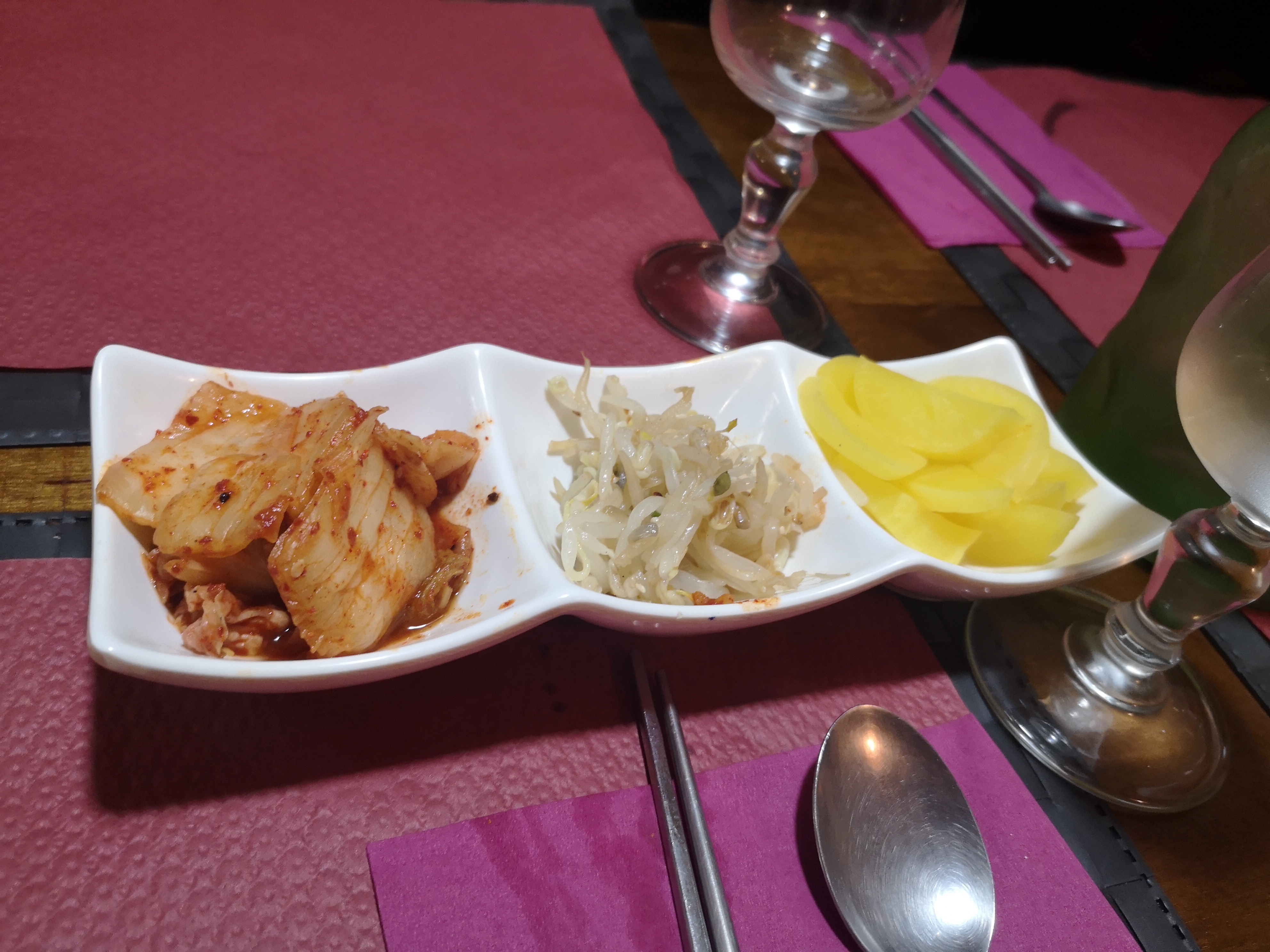 Si vous cherchez le goût de la Corée, passez votre chemin. 3 banchan différents, seuls le kimchi était passable, le radis jaune n'avait absolument aucun goût (comment c'est possible???). On a commandé un kimchijeon pour l'entrée qui était plutôt bon. Pour les plats principaux on a commandé un dwaenjang jjigae et un jaeyuk. Ayant vécu 5 ans en Corée je peux vous assurer avec certitude que ce ne sont PAS ces plats qui nous ont été servi. Visuellement oui, gustativement non. Et supplément : le riz n'était même pas bien cuit???? Il était presque cru????? Comment c'est possible????
