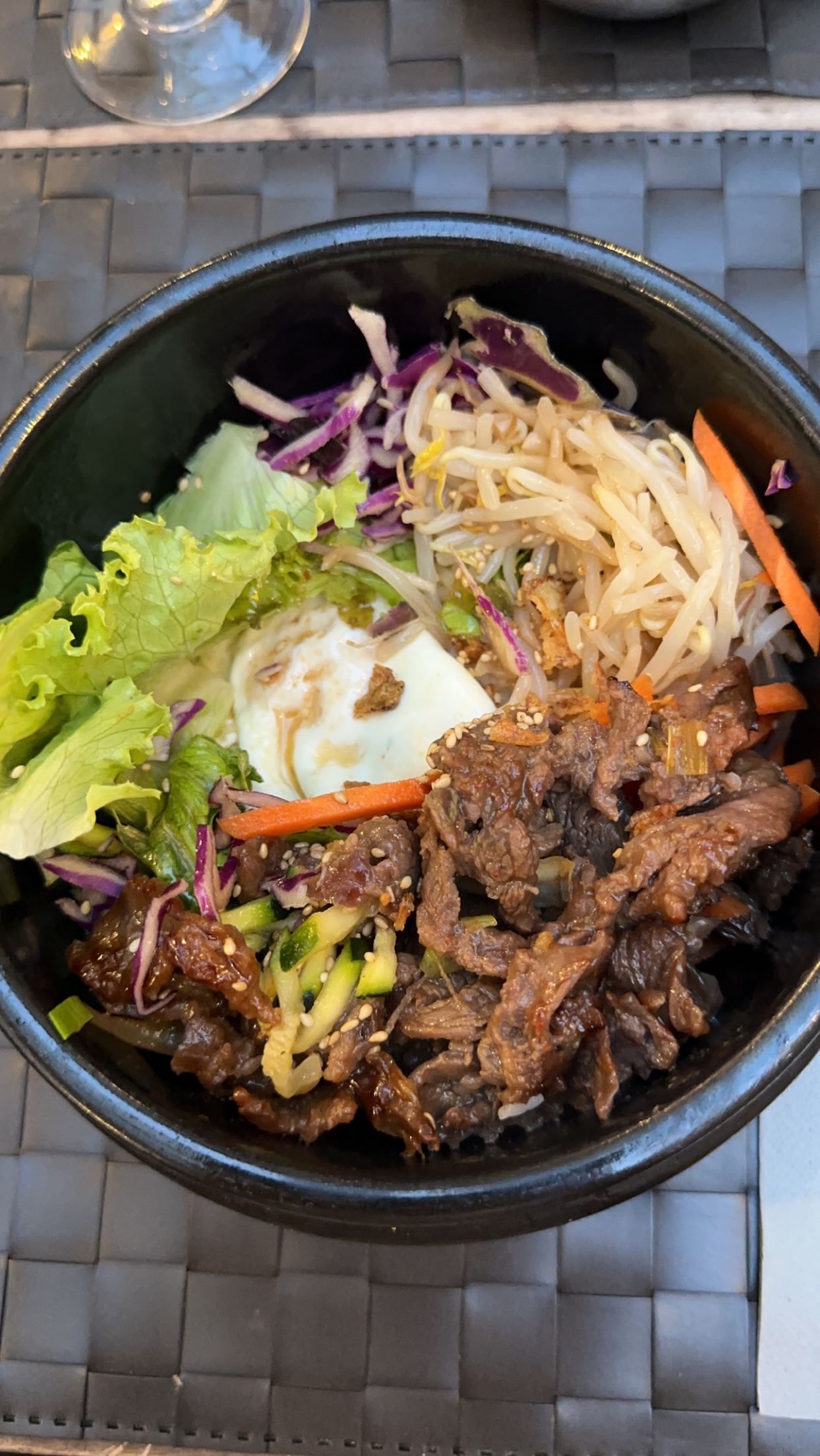 En ce Lundi 11 Novembre pluvieux , j’ai voulu prendre refuge dans ce petit restaurant élégamment éclairé. Pour satisfaire ma faim , j’ai opté pour un Bibimbap au bœuf. Ce fut très copieux , servi rapidement et bien présenté. Le tout a été servi avec une sauce très bien relevée. Concernant le cadre , c’est très chaleureux grâce aux lumières tamisées , la musique douce mais aussi avec la présence d'une équipe très souriante et serviable. Je vais assurément réitérer mon expérience et tester d’autres plats. Une belle découverte !