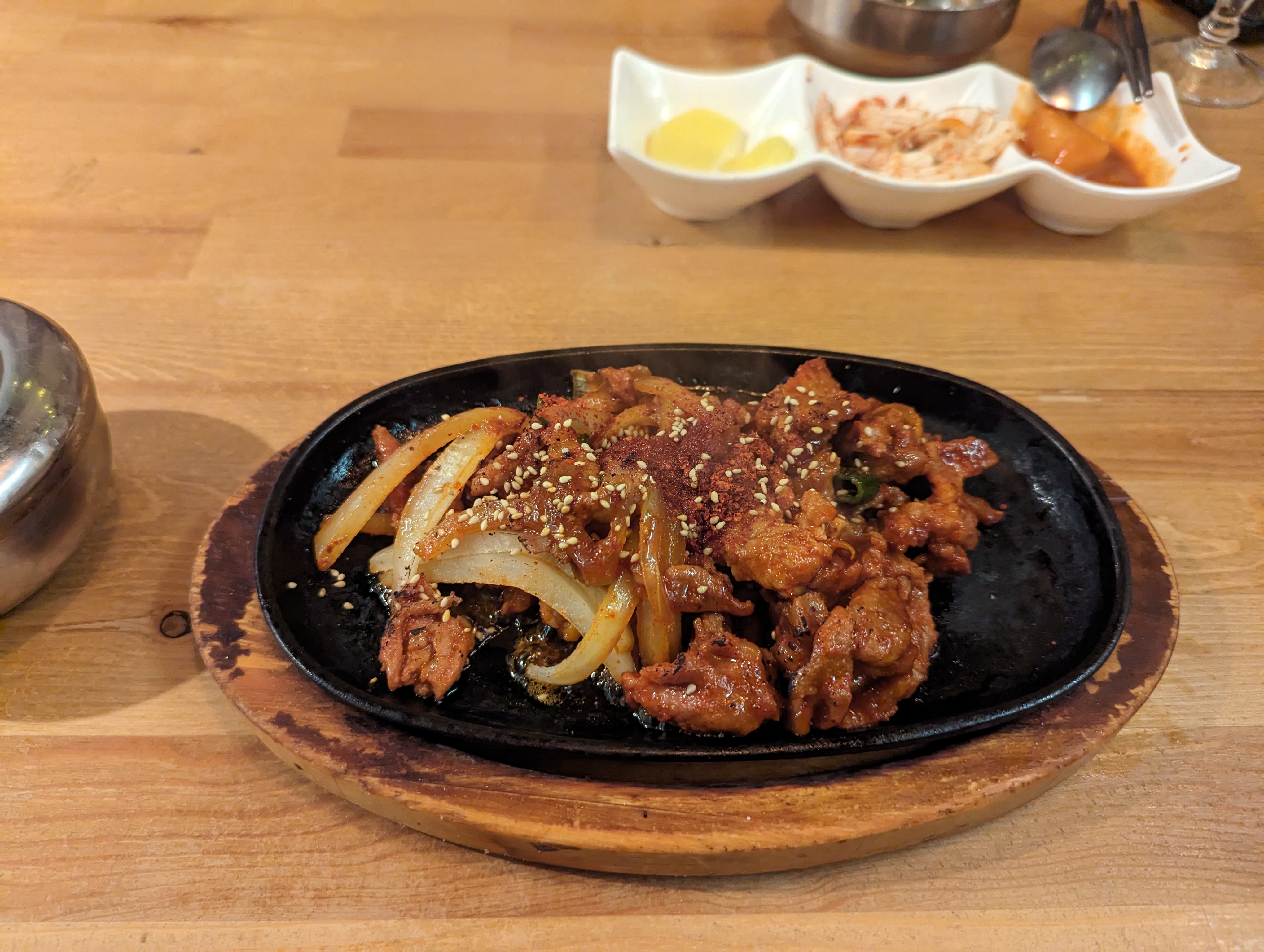 Ce restaurant coréen propose un vaste choix de plats. C'est bon, copieux et épicé à souhait. Certains plats annotés sont piquants (cela reste correct). Les prix sont abordables. Le serveur était très aimable (c'est le gérant). Possibilité de manger sur une terrasse dans l'arrière-cour. Un seul bémol, si vous mangez en salle, vous risquez que vos vêtements sentent le gras.