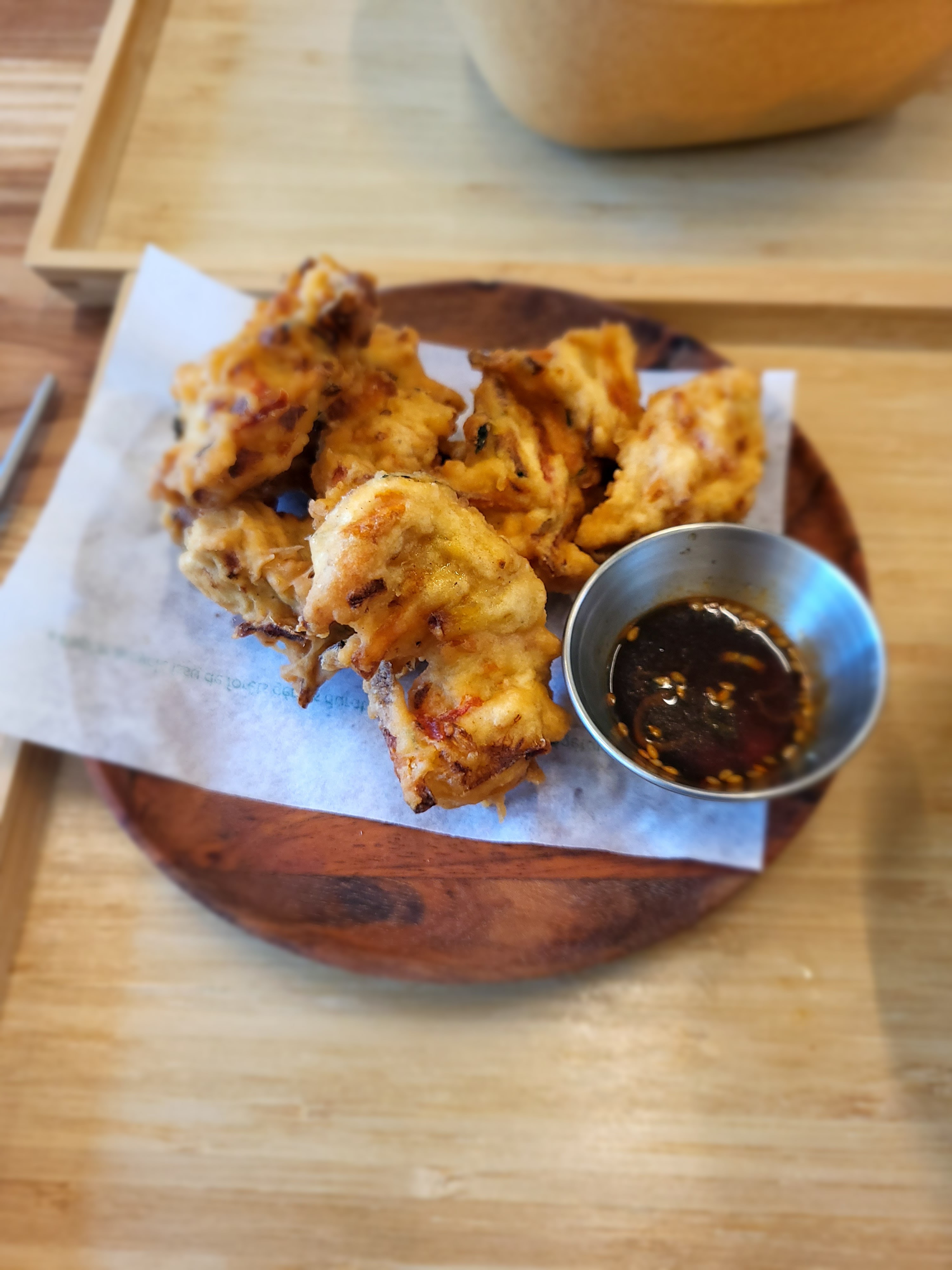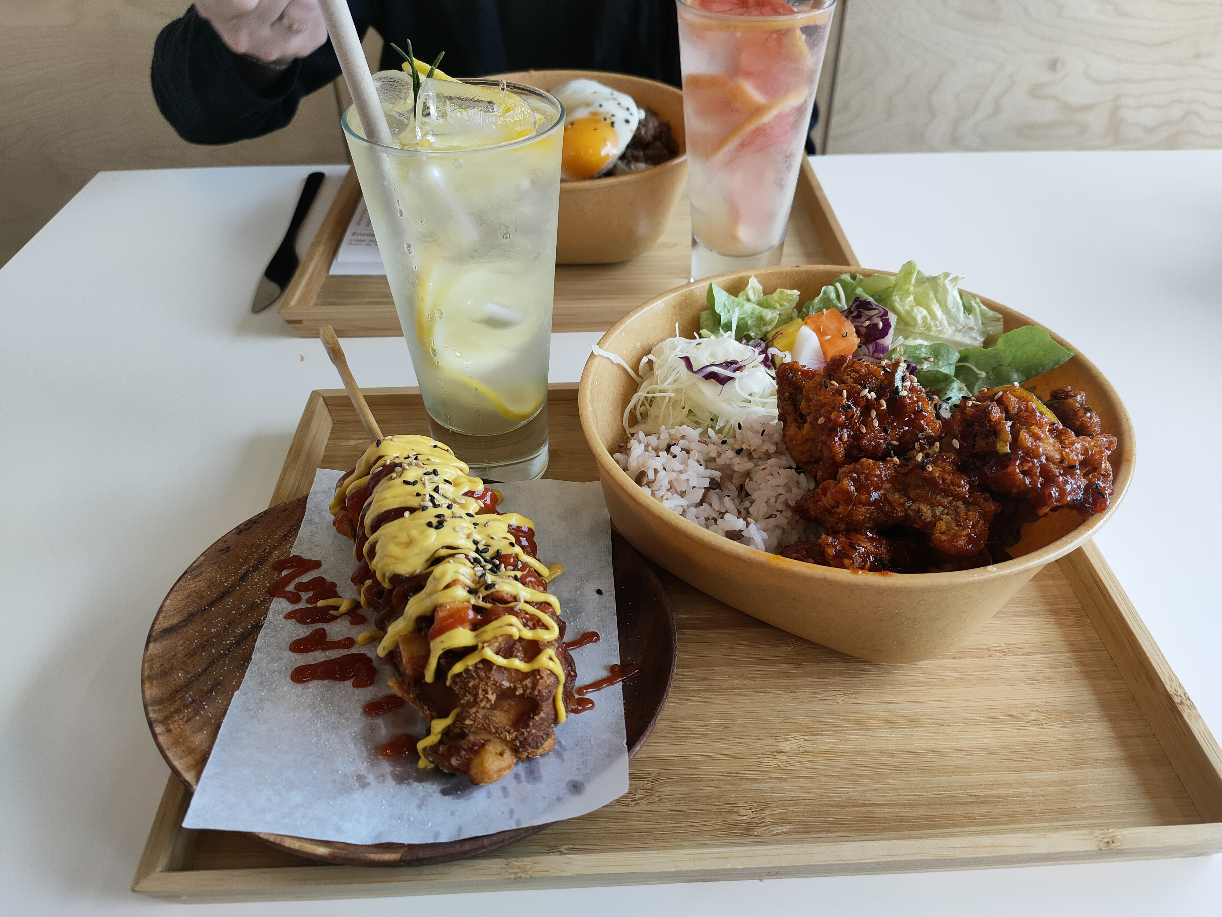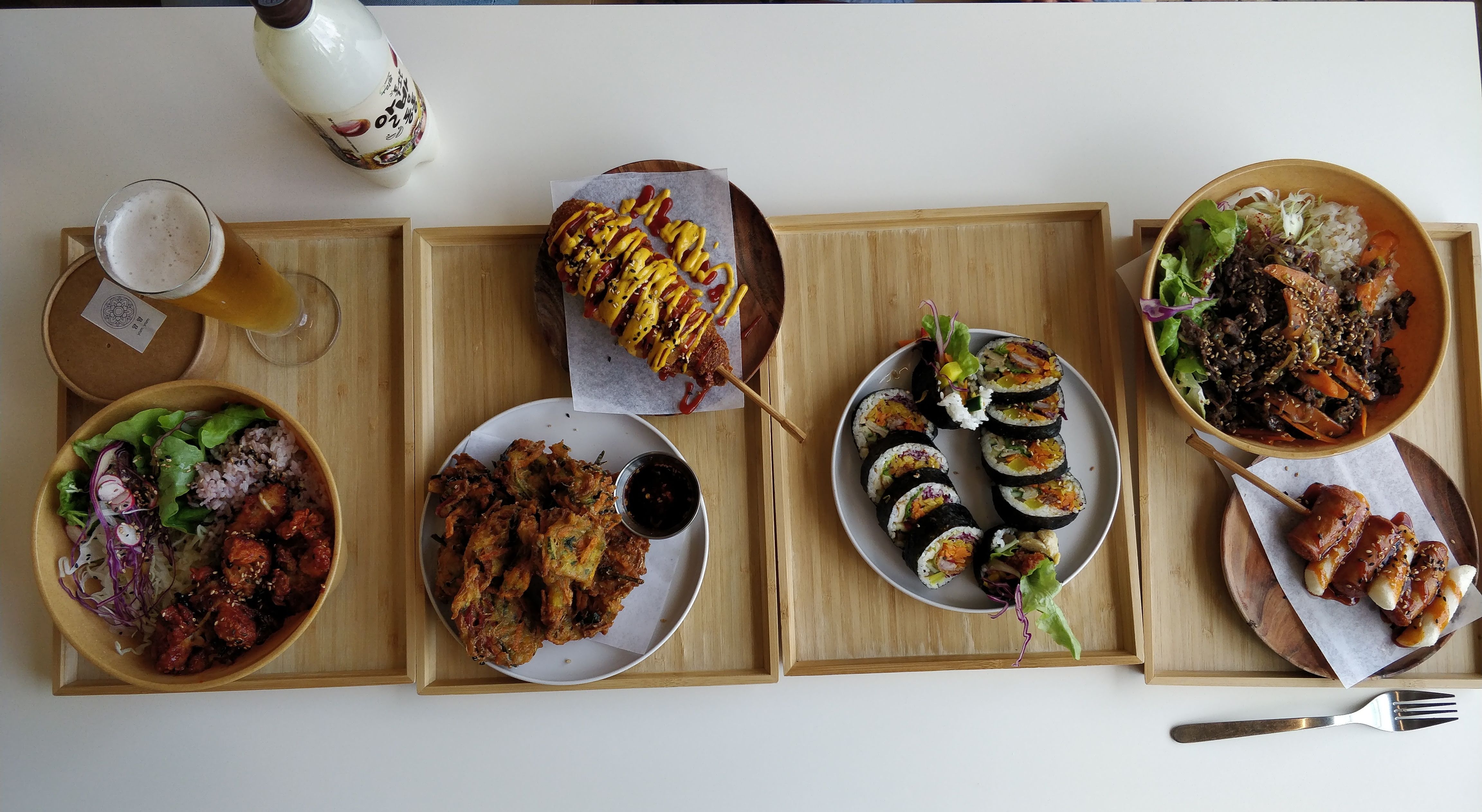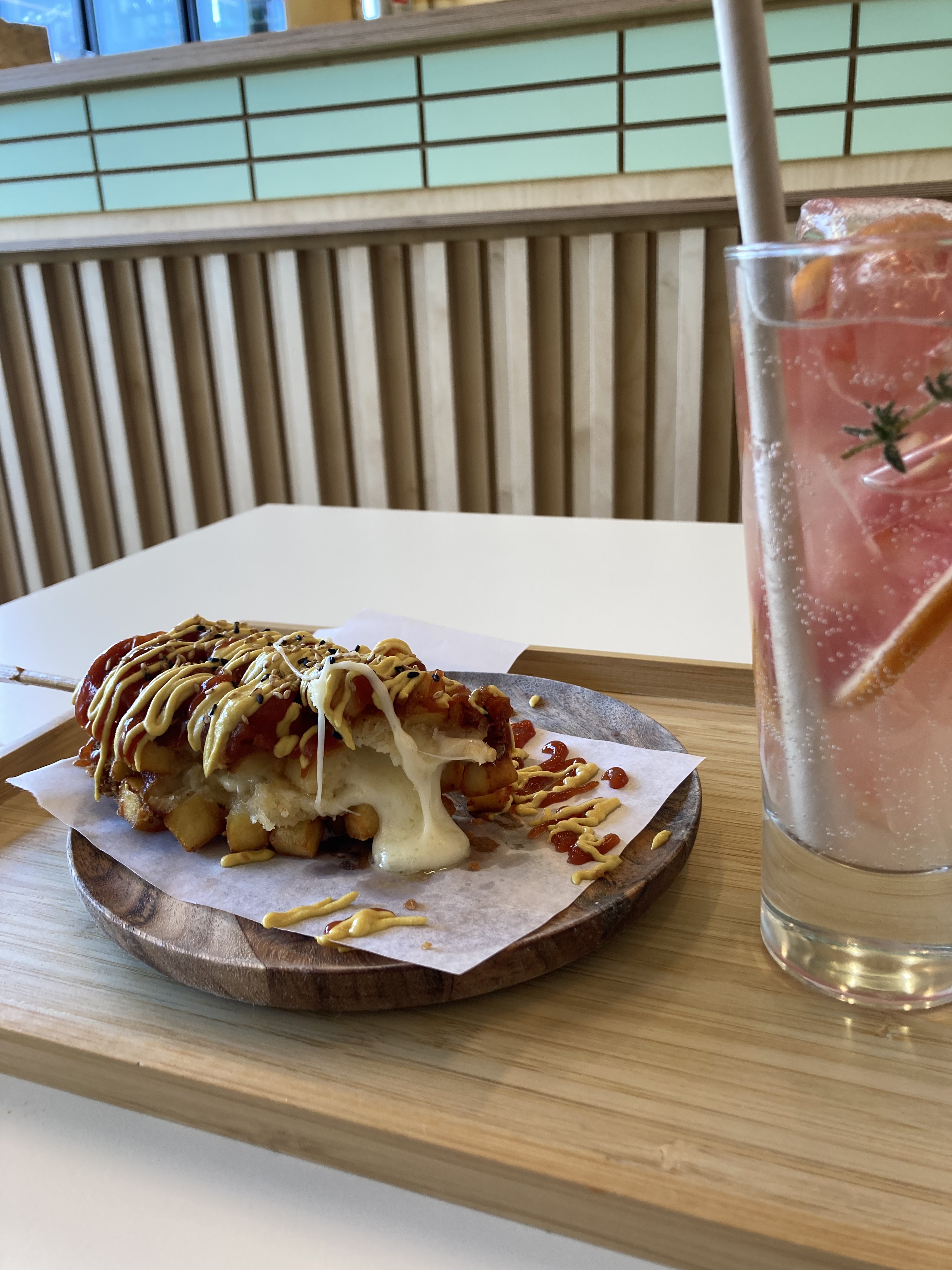 Nous sommes arrivés un peu après 13h30 un vendredi en vacances scolaires. L' ambiance est jeune et dynamique tout comme l'équipe qui a été adorable. Le service a été rapide et les plats (corn dog cheese et beignets au légumes) étaient succulents et généreux comme il faut. La ade au citron était également incroyable. On reviendra tester un de ces soir en afterwork avec des amis ça c'est sûr ! 감사합니다 🤍