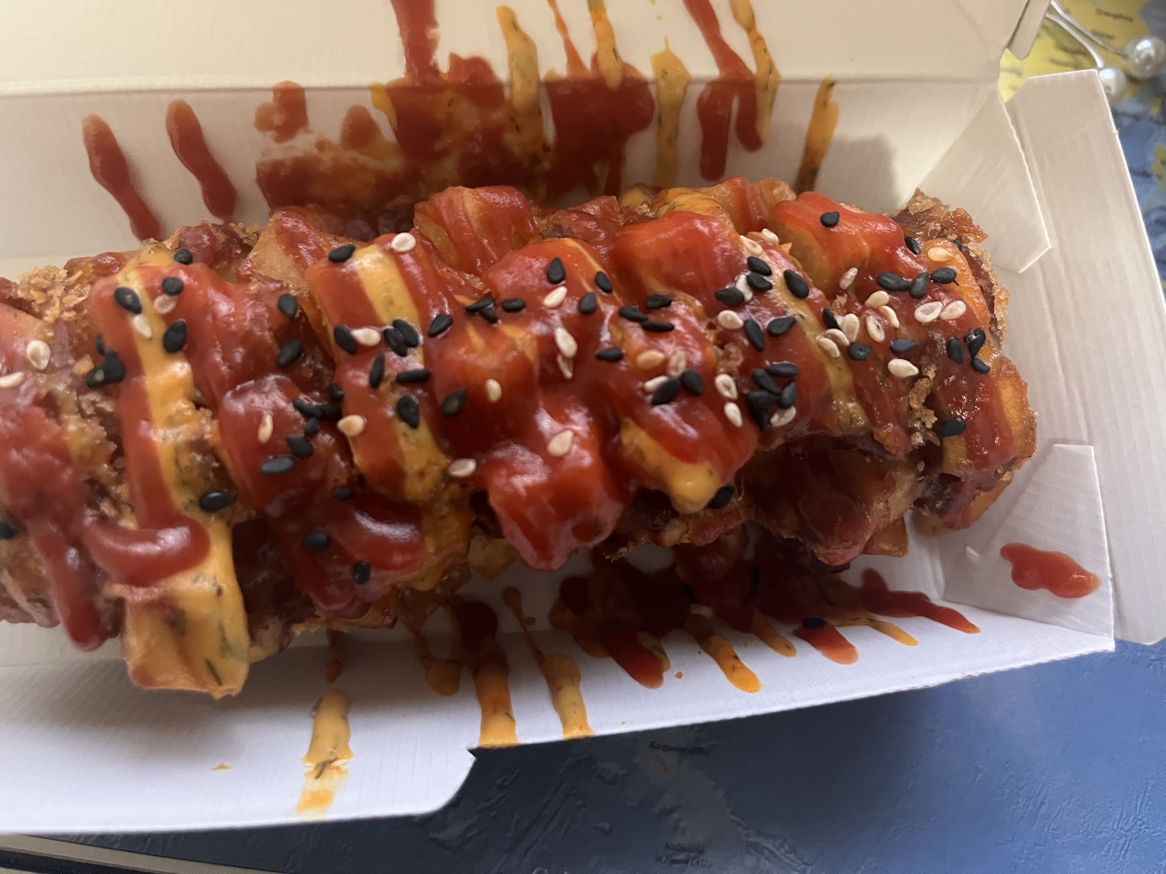 - Accès et emplacement : Joli restaurant, mais un peu dommage qu'il soit situé dans un quartier peu fréquenté. - La nourriture : Le corn dog : + Ce n'est pas le corn dog que je connais habituellement. En général, il s'agit d'une saucisse enrobée de fromage, puis de pâte. Mais dans ce restaurant, on nous propose soit un bloc de fromage frit, soit une saucisse frit. C'est pourquoi nous avons été assez déçus d'avoir reçu le bloc de fromage frit. + En outre, le corn dog manquait de goût, malgré la présence de sauces. + Cependant, la texture était vraiment agréable, croustillante et aérée à la fois. La taille est exactement comme sur le menu. - Le service : Rapide. Cependant, ils ont commencé à nettoyer les tables alors que nous nous asseyions, au lieu de le faire après le départ du client précédent. De plus, ils nous ont laissé ranger notre plateau dans la zone du personnel sans aider.