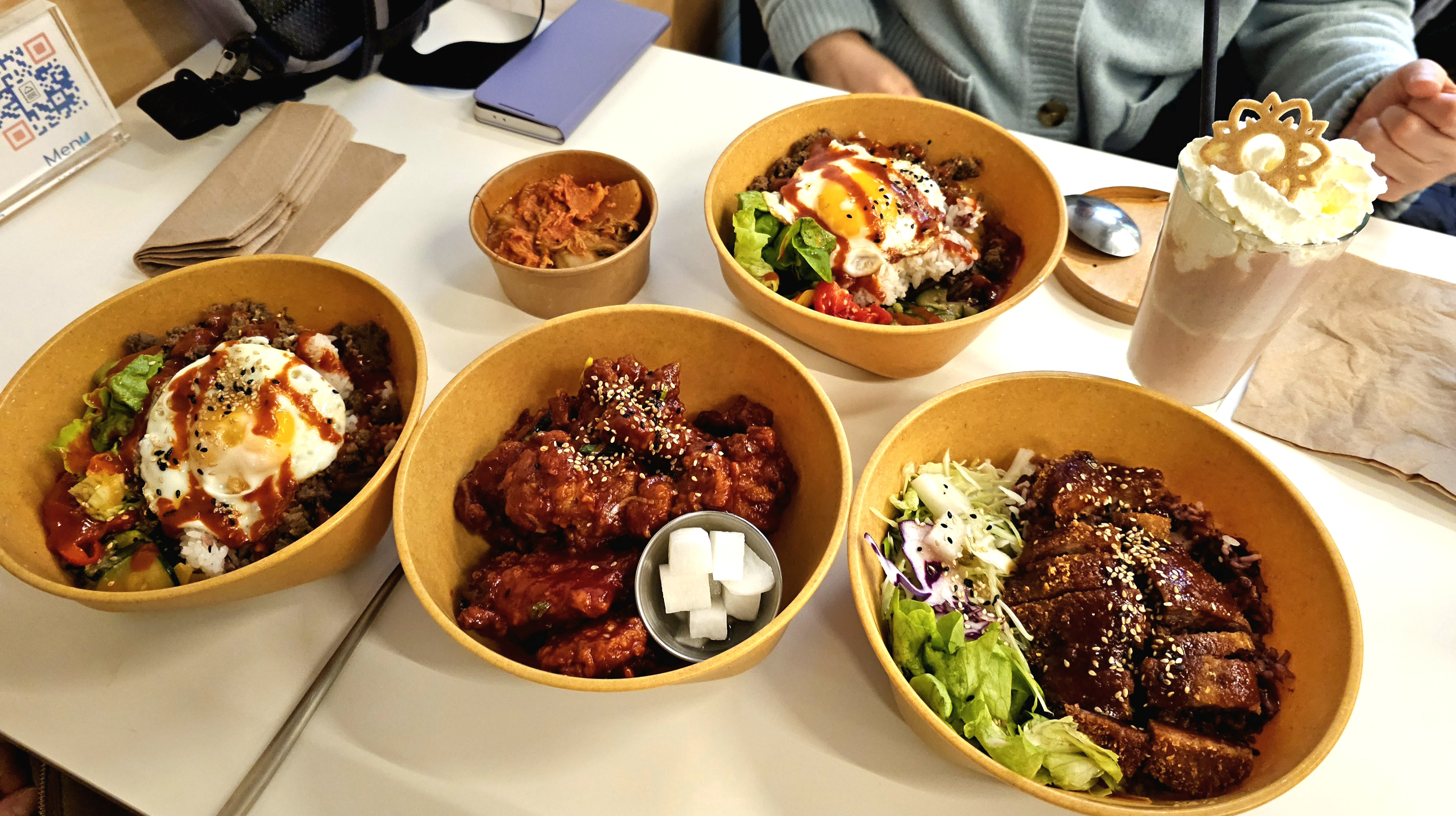 Excellent service, ambiance de dingue c'est super charmant. Que dire de la nourriture, la Corée est transportée des cuisines aux assiettes puis dans notre estomac. C'était absolument delicieux je vais y retourner avec mes amis. Je recommande les corn dogs, et le bibimpap. Le chocolat chaud et le café sont de très bonne qualitée.