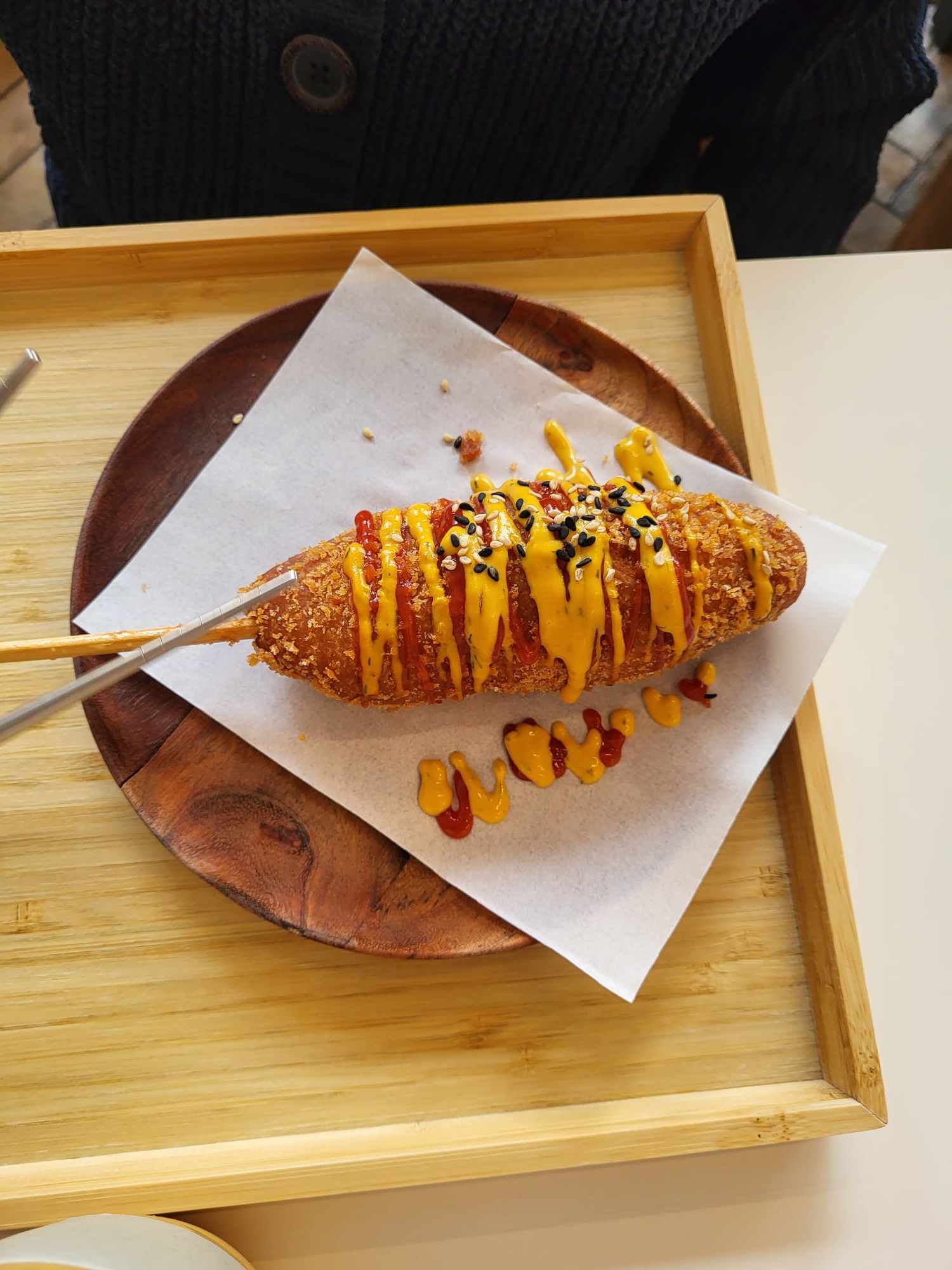 Le lieu est très petit, compliqué de s'y faire une place pour manger tranquillement. Mis à part cela, la nourriture est excellente. Le corndog est très très fondant 👌