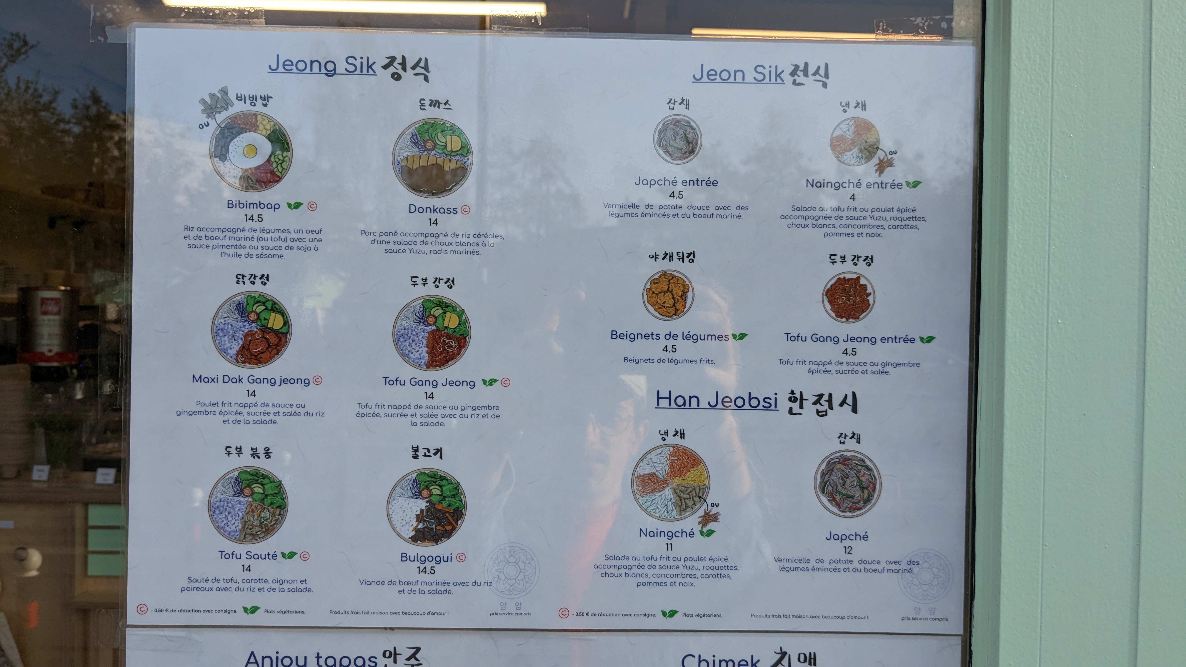 Equipe très sympa, nourriture excellente. Plutôt bon marché Nous y sommes allés pour l'anniversaire de ma fille l'été dernier et on était ravie (nous avions eu les yeux plus gros que le ventre, ma fille et son amie voulaient tout goûter... Nous avons pû rapporter des doggy bag. Nous y sommes retournées en janvier : bien moins de monde, très bon (les kimbap au thon 🥰). Nous avons été plus raisonnables sur les quantités : (2 entrées, un plat. Nous nous sommes tout partagés et plus faim à 2 : 21€50) La même équipe, encore plus sympa quand pas débordée. Nous y retournerons avec plaisir, notamment parce qu'il y a toujours une offre végétarienne et que ma fille est une fana absolue de la k-food. Le seul bémol : les places pour se garer, c'est une tannée. Et loin du métro. (Il va falloir qu'on checke les bus...)